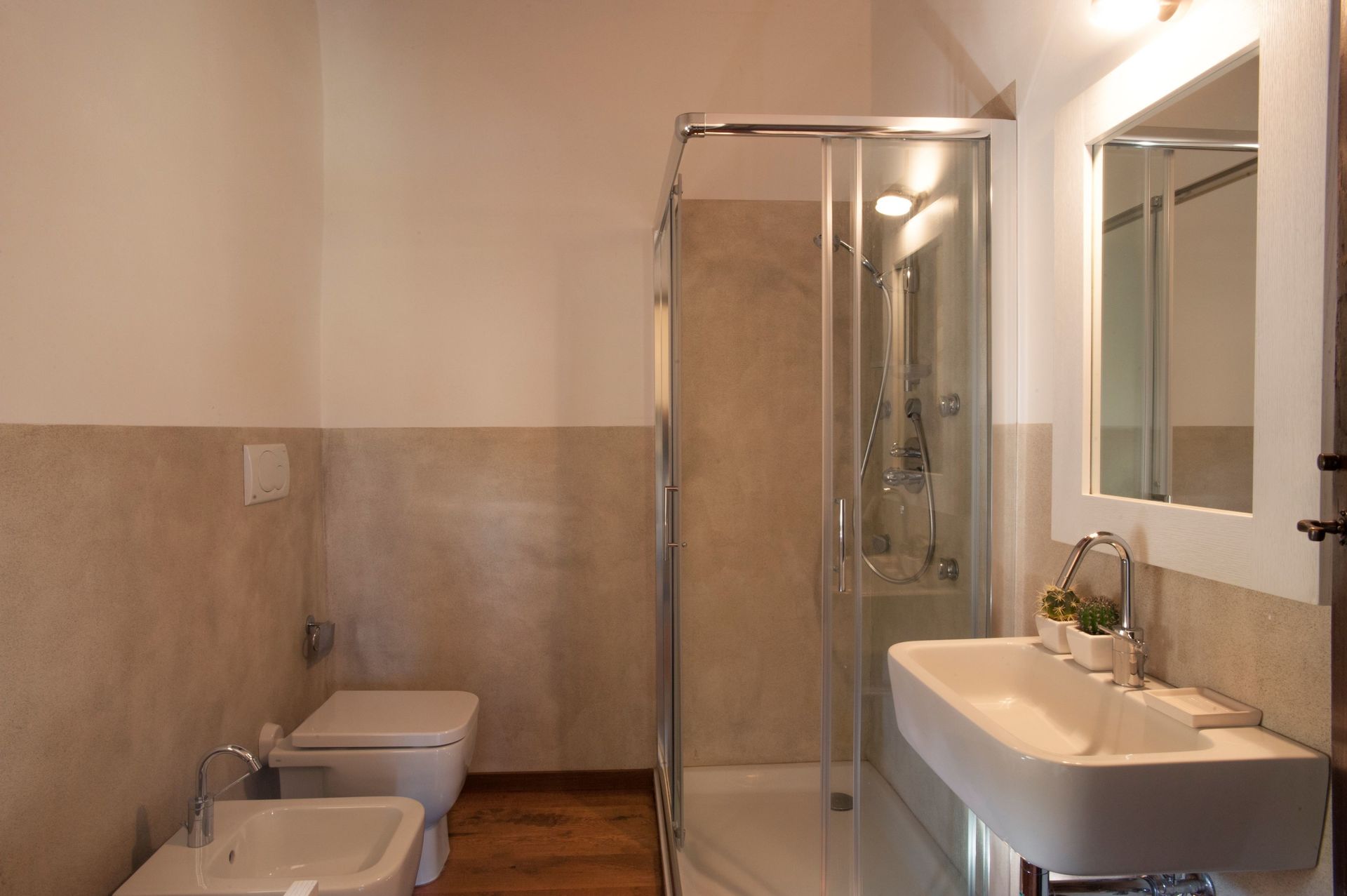 Anden sal-tårn: Dobbeltværelse med opdelt aircondition og eget badeværelse med brusebad med trægulve.