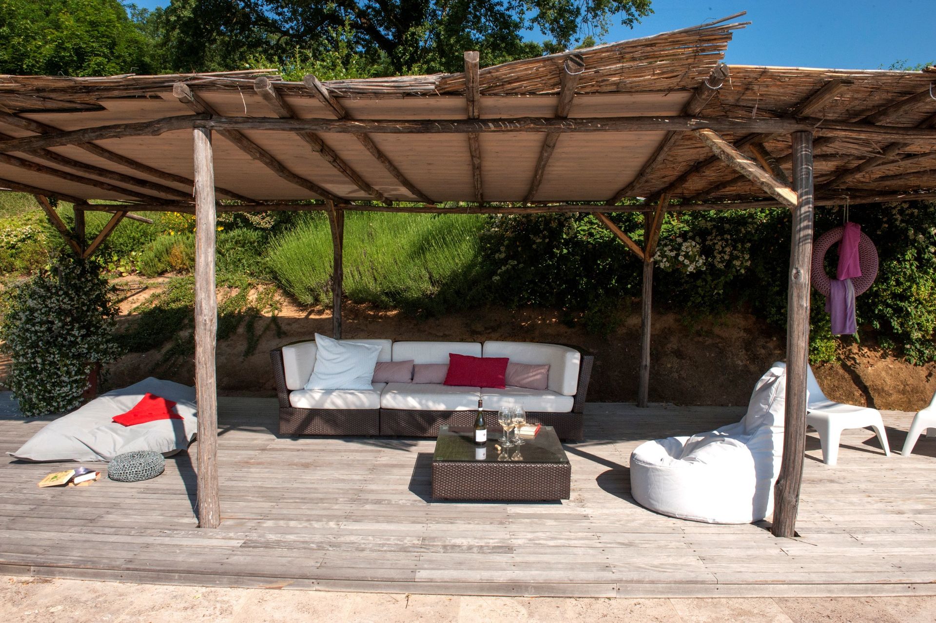 Det lille hus ved siden af poolen har sommerkøkken og badeværelse med bruser.