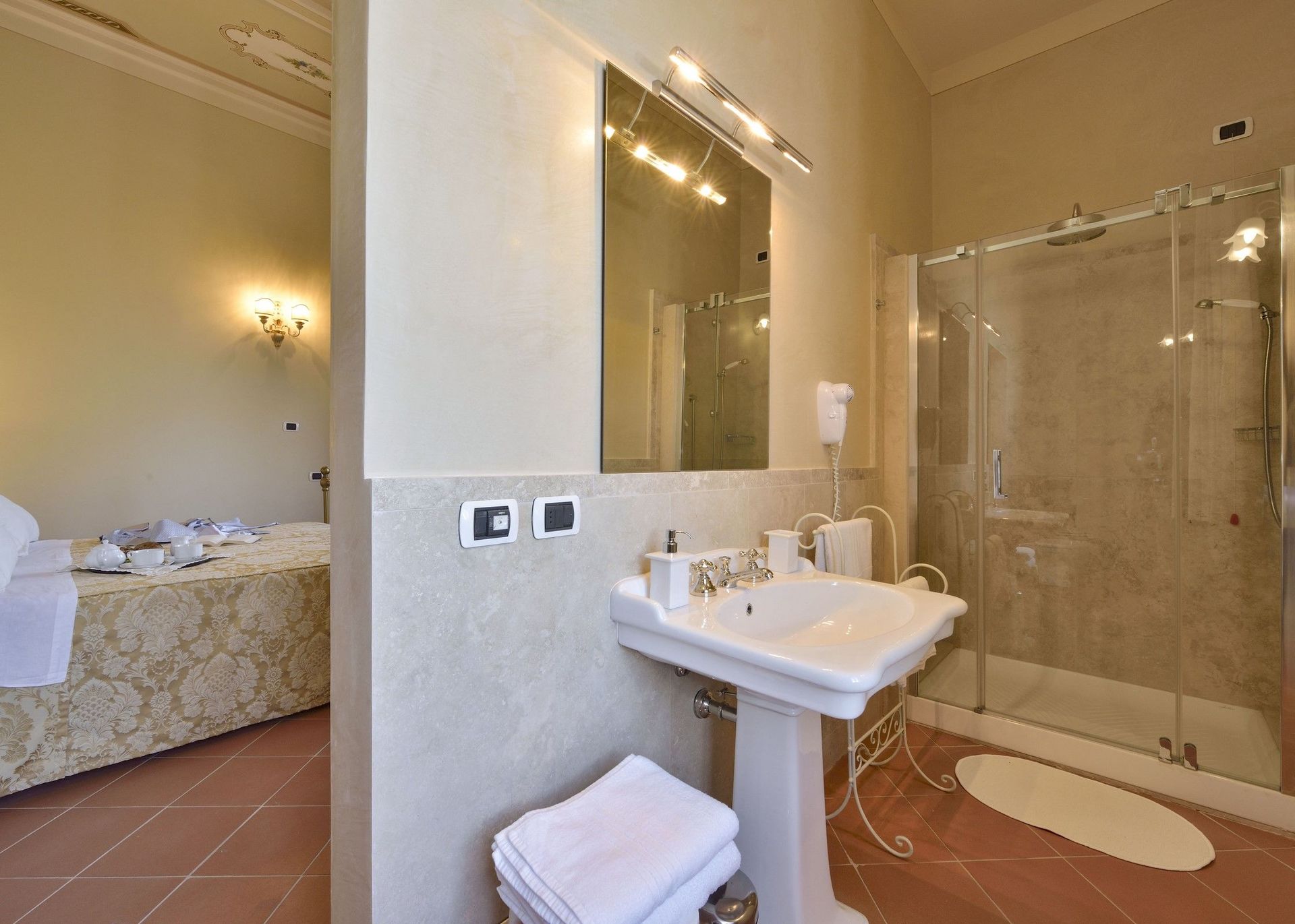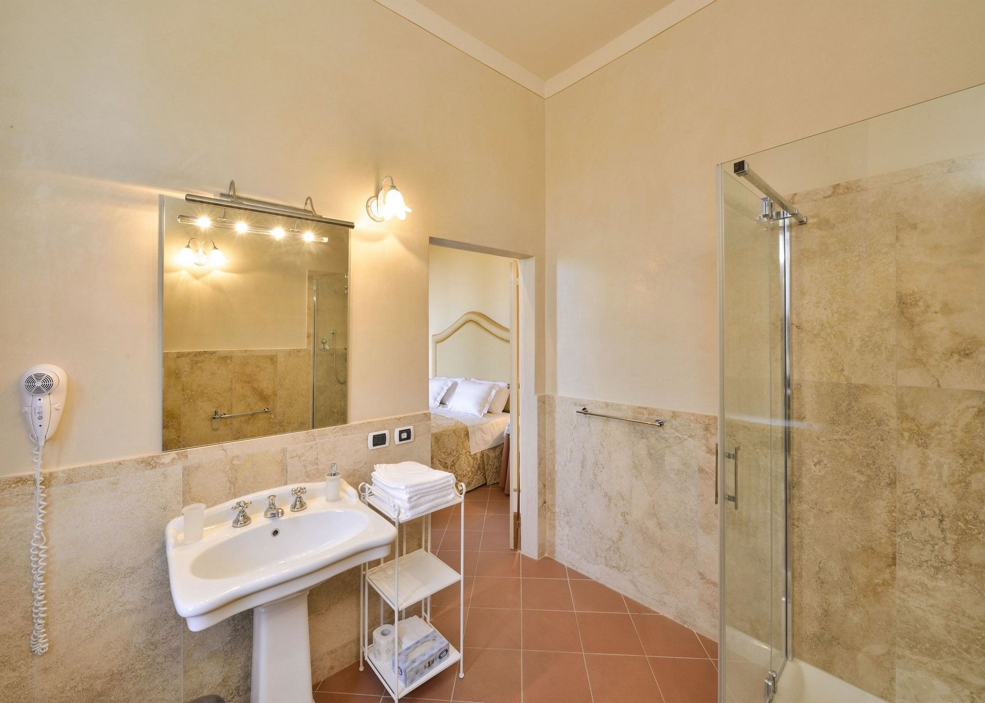 Soveværelse med bad 7: dobbeltseng, WIFI internet, klimaanlæg, tv, vask, wc, bidet, bruser, hårtørrer.