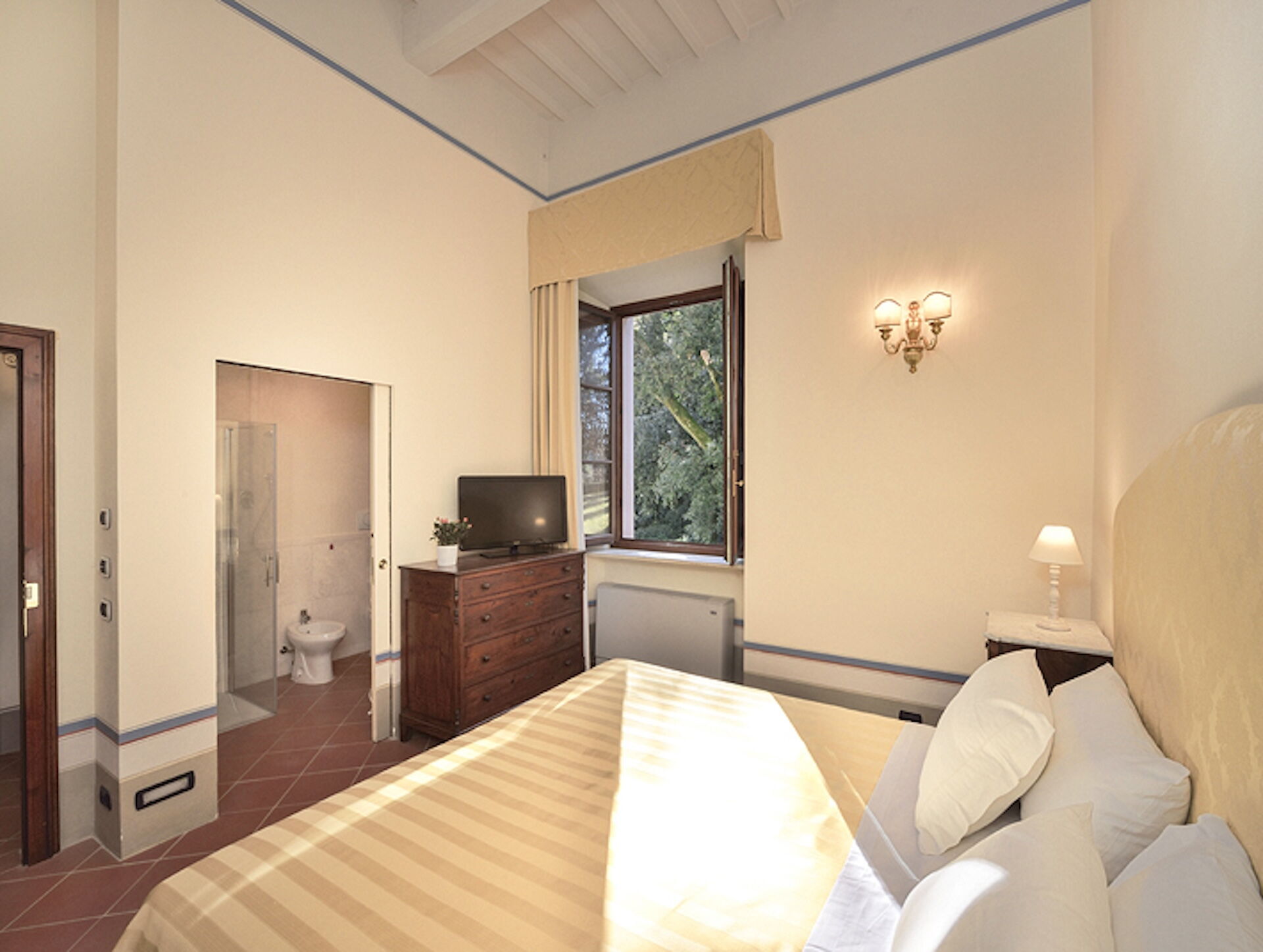 Soveværelse med bad 5: dobbeltseng, WIFI internet, klimaanlæg, tv, vask, wc, bidet, bruser, hårtørrer.