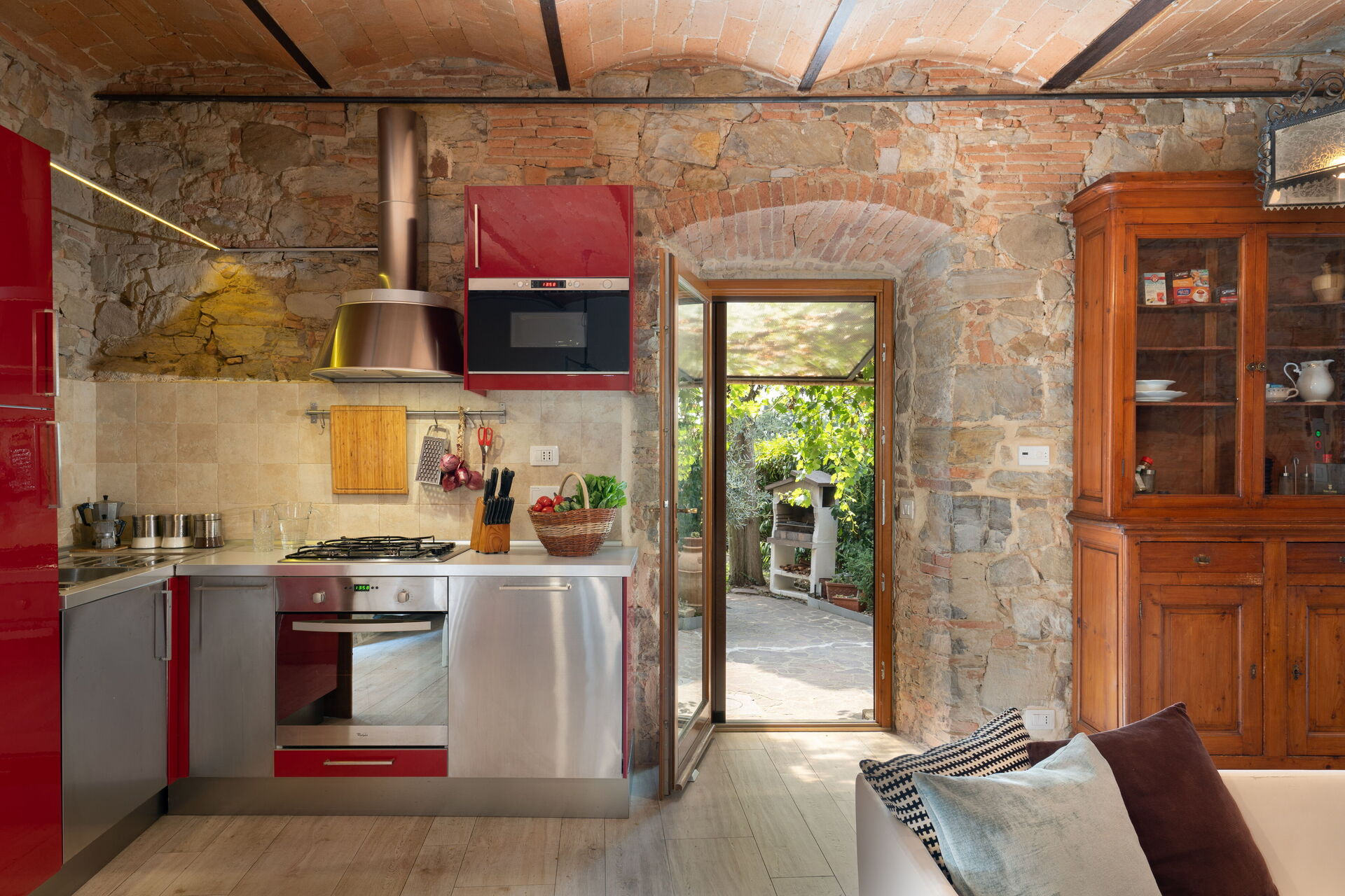 The main entrance is from a small alley of this small cute Tuscan village. From the door a big open plan room in stones and red bricks welcomes you to the daytime part of the villa, with a dining, kitchen and living area.