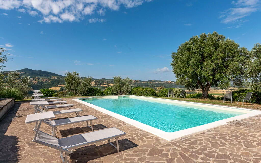 Haven skaber et roligt miljø med panoramautsigt over Ombrone-dalen; på klare dage kan havet ses i det fjerne. Svømmepølen måler 6 x 12 meter med en dybde på 110 til 160 cm og er tilgængelig fra 15. maj til 20. september for fælles brug. En udendørs bruser befinder sig i nærheden af pølen. En charmerende pergola tilbyder skygge, og havemøbler er placeret rundt omkring i de udendørs områder. En privat grill står til rådighed for udendørsspising. Parkeringsplads på stedet er tilgængelig; adgang til ejendommen sker via en grusvej på cirka 1 km.