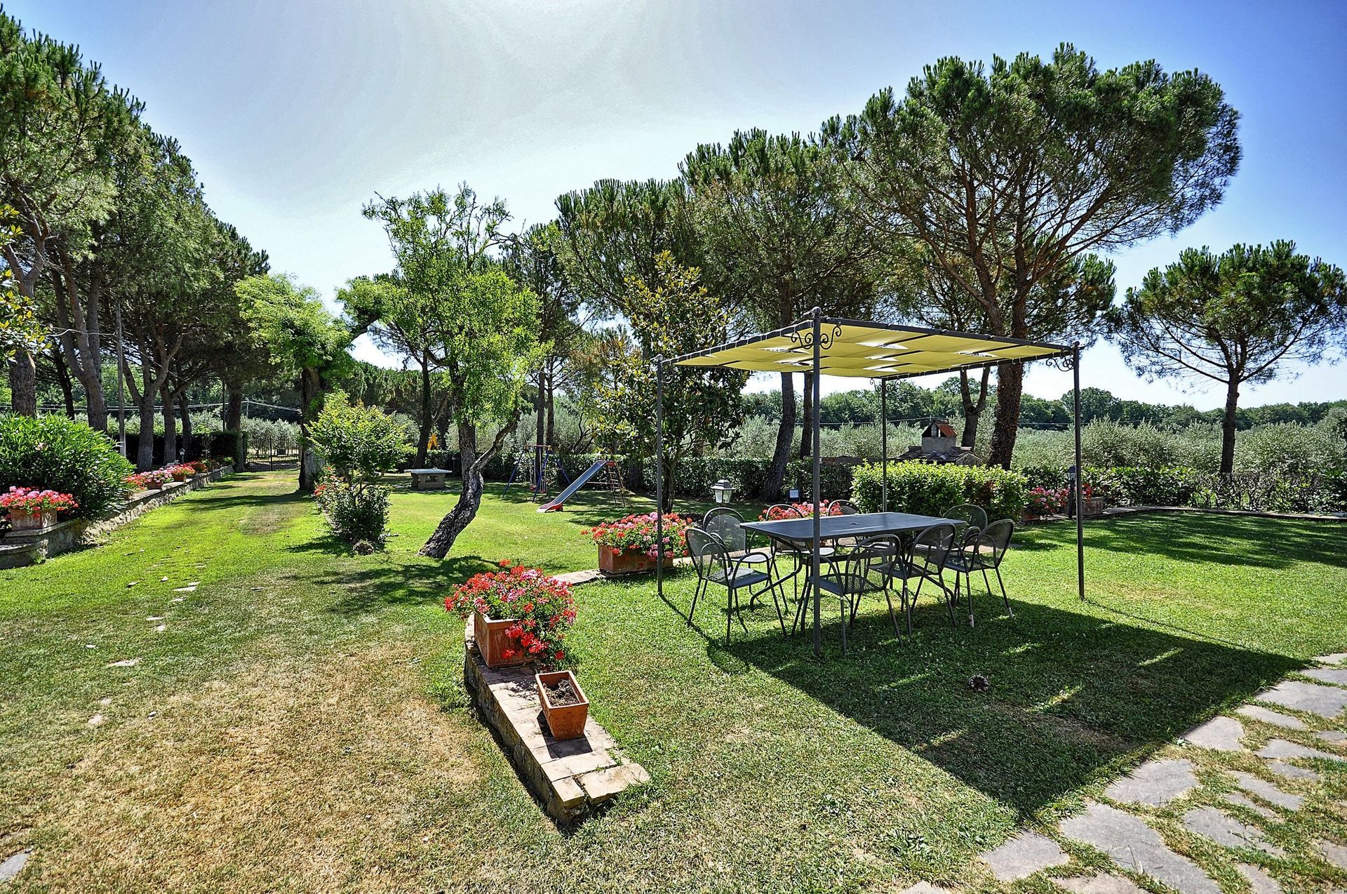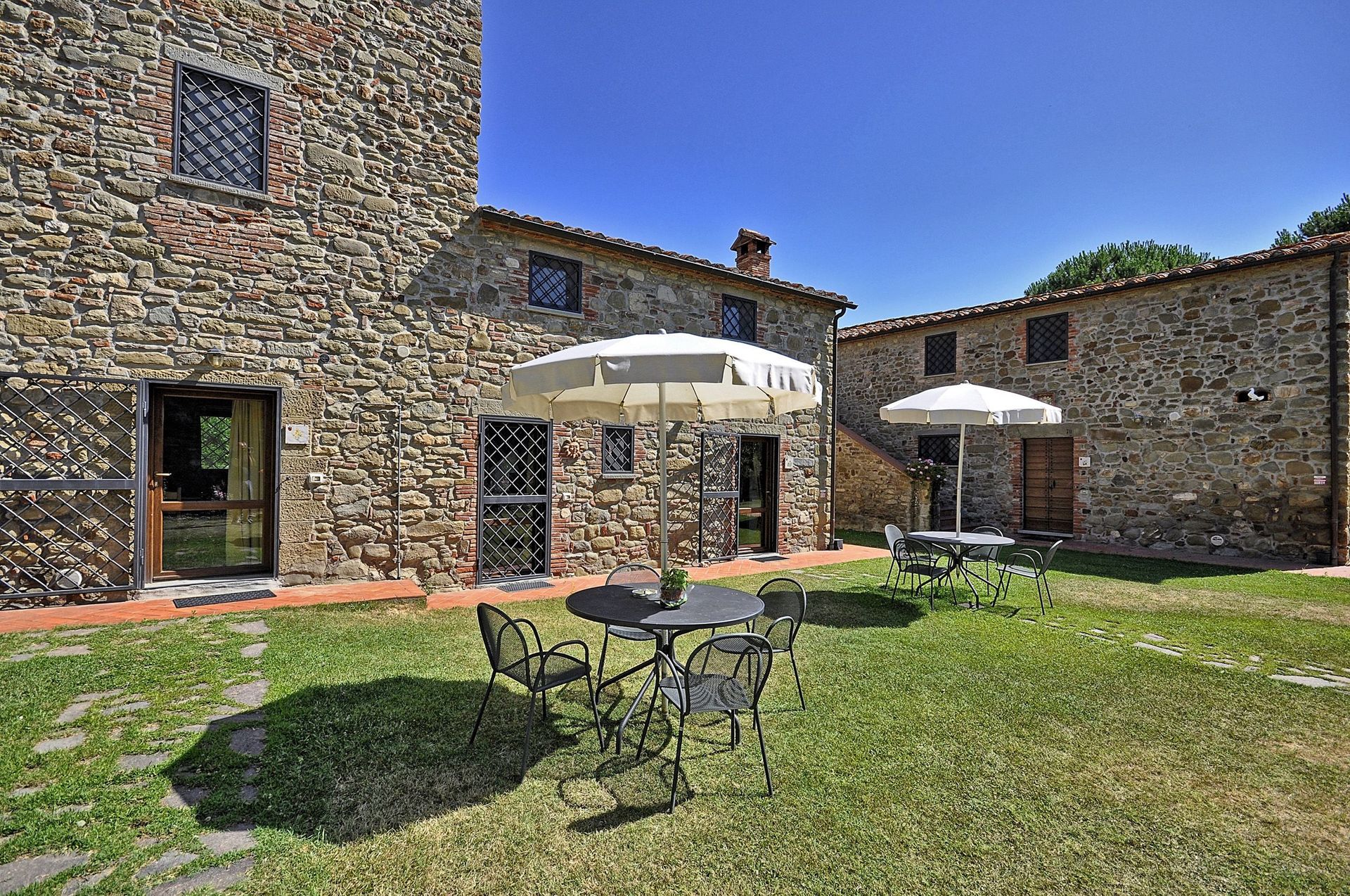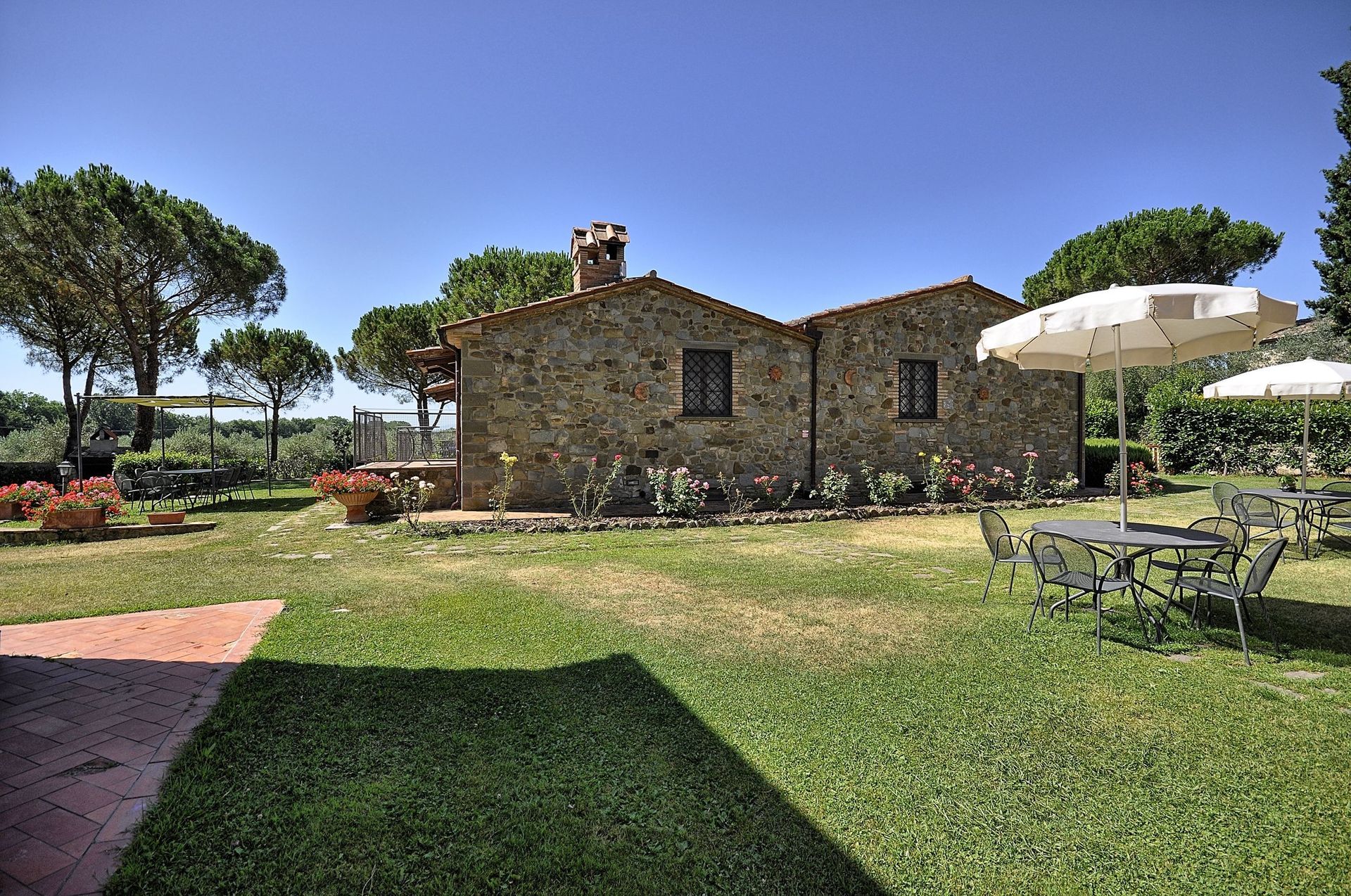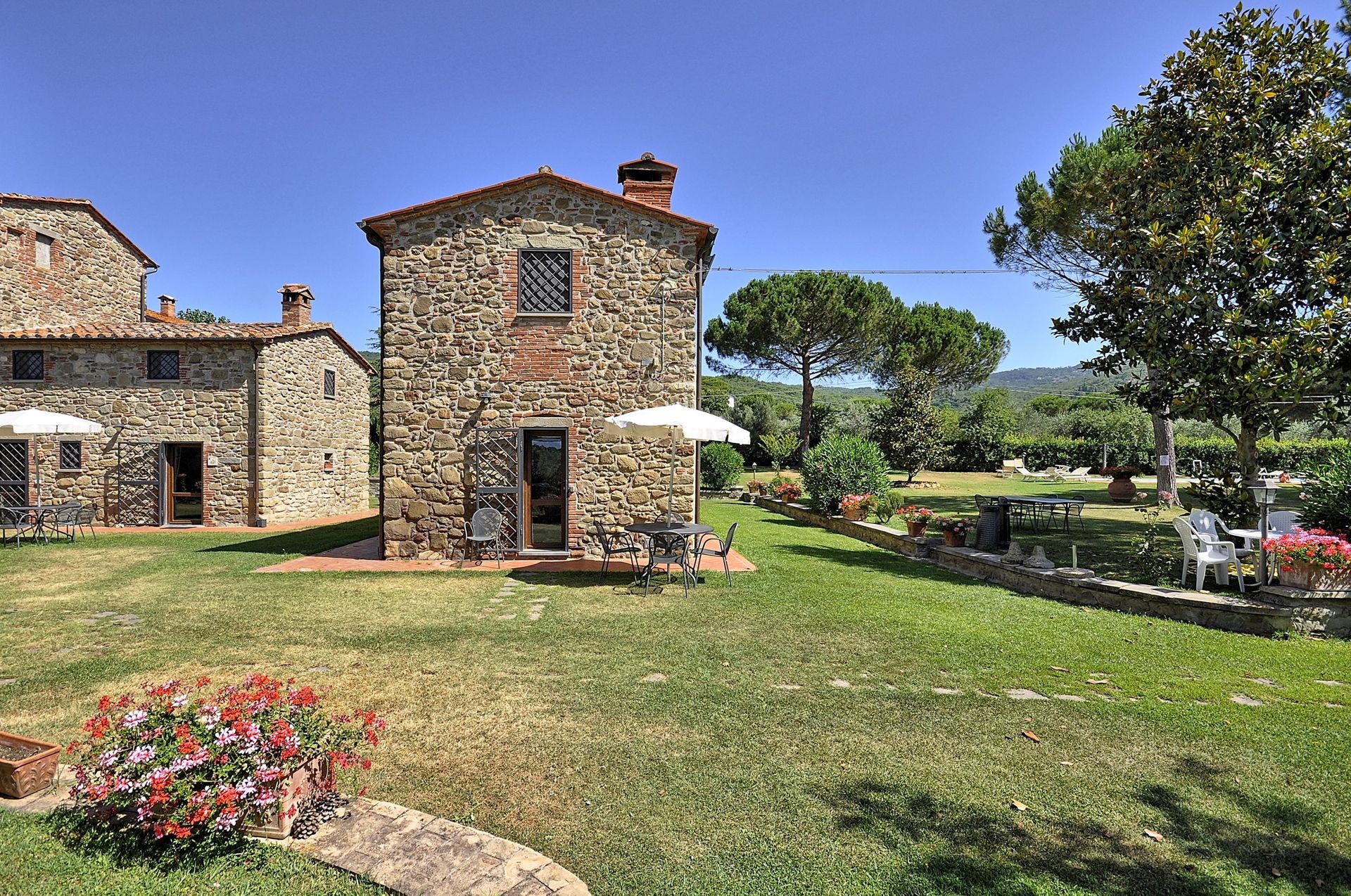 Apartment which is spread over two levels with small area in the garden furnished with a table, chairs and sun umbrella
