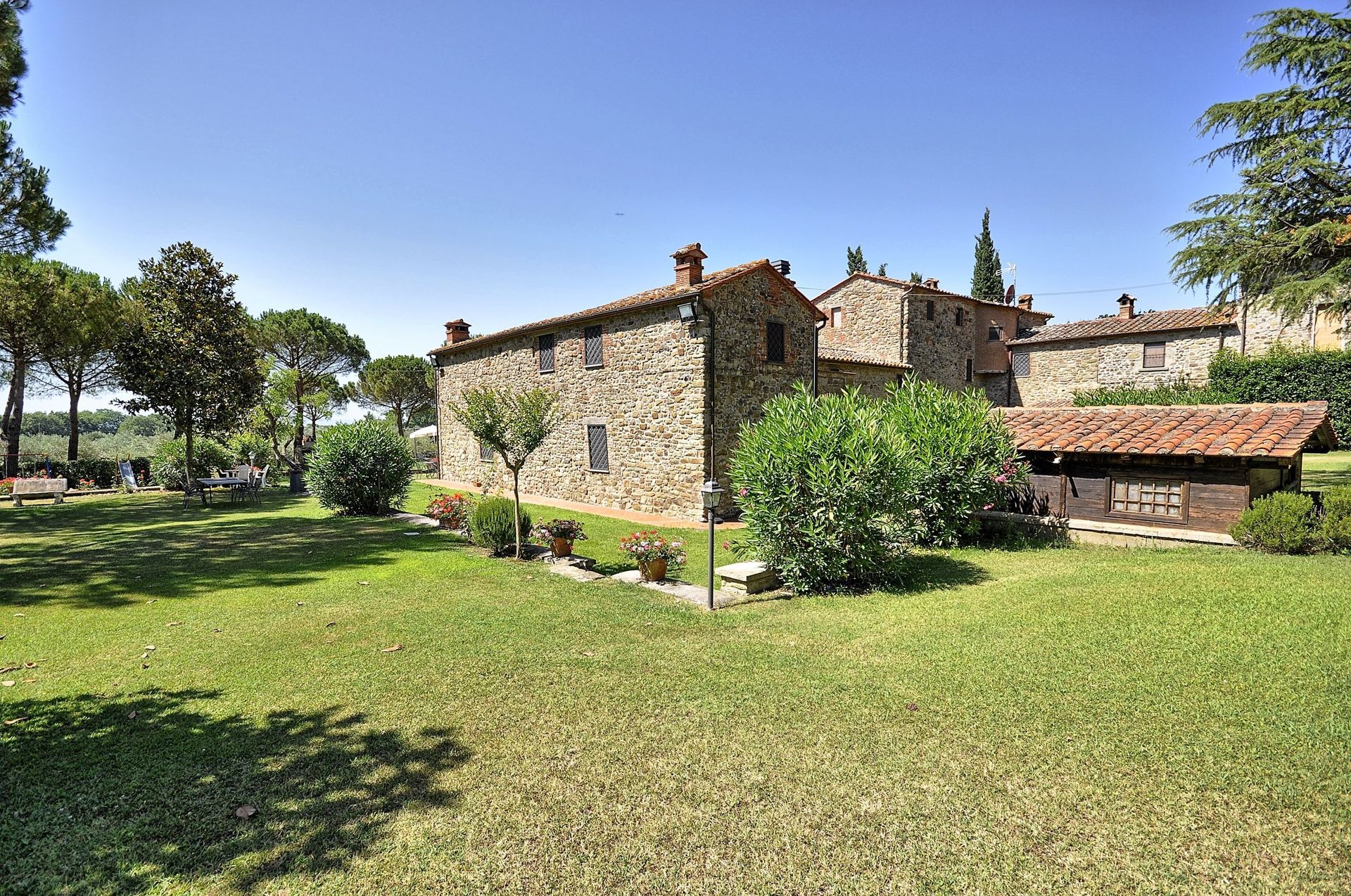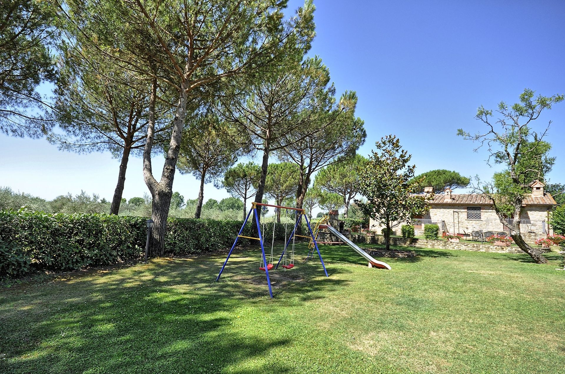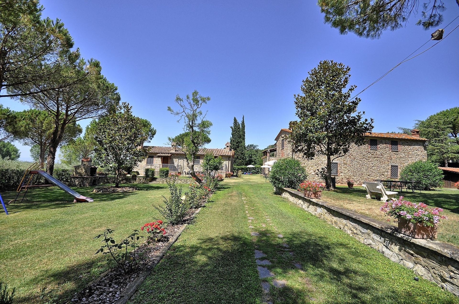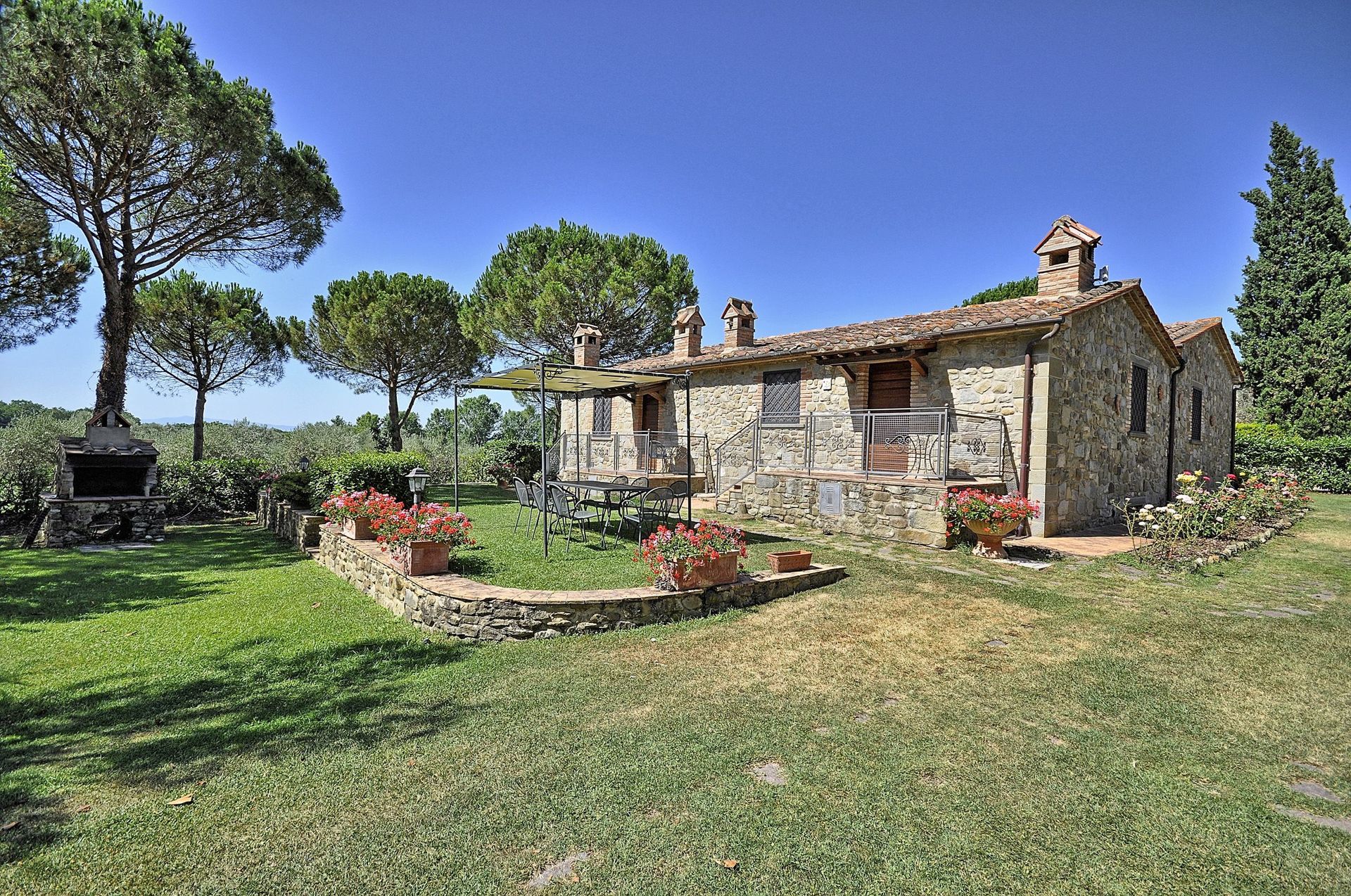 Apartment which is spread over two levels with small area in the garden furnished with a table, chairs and sun umbrella