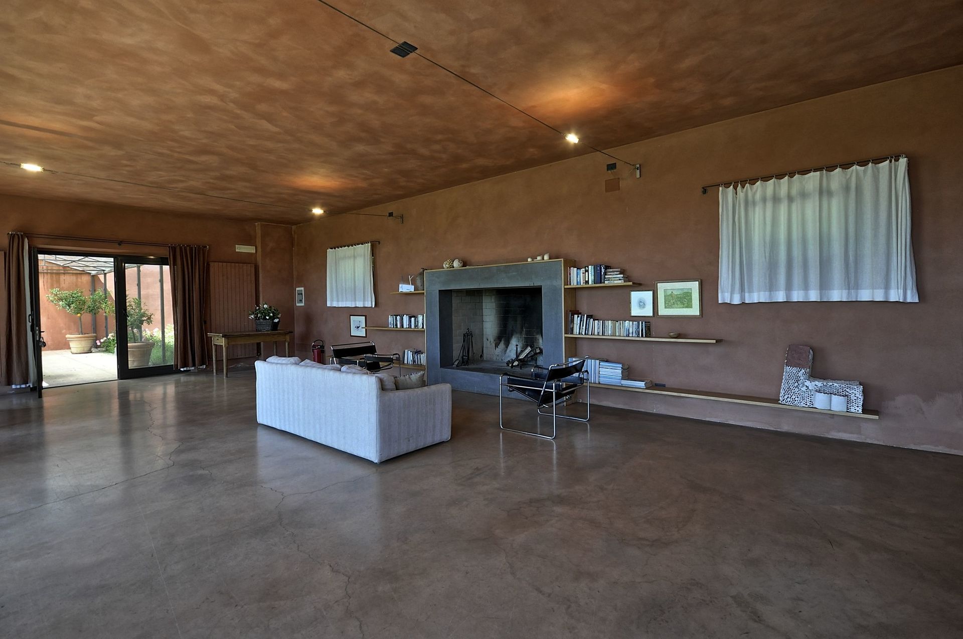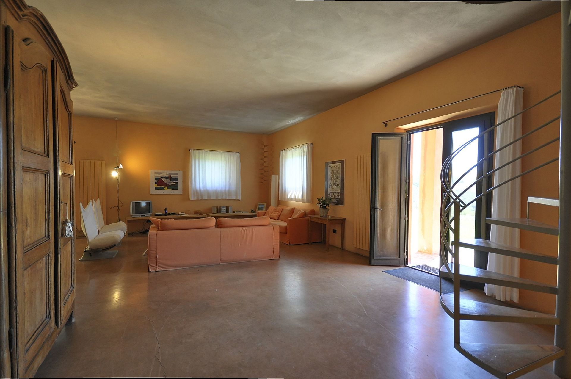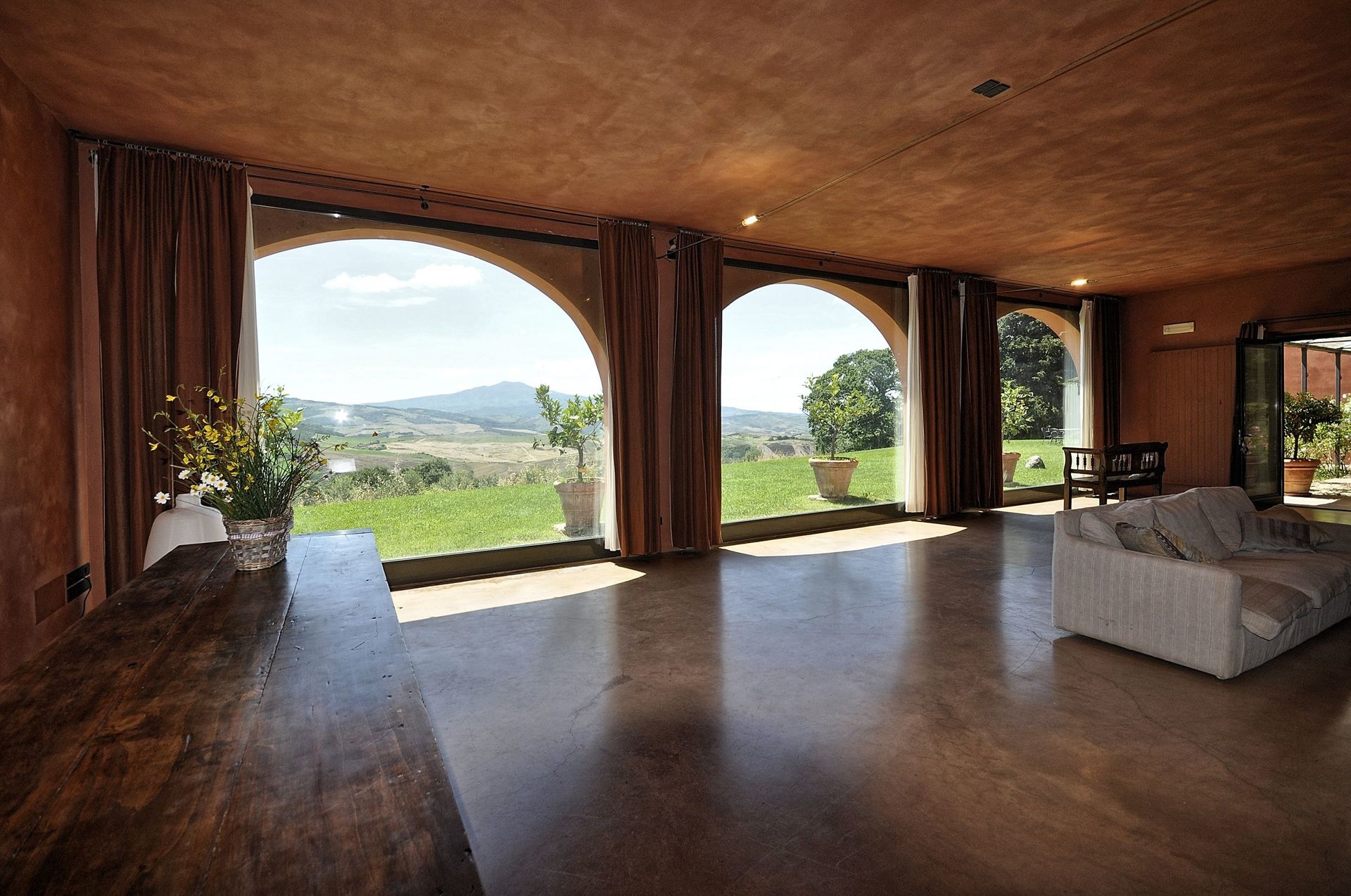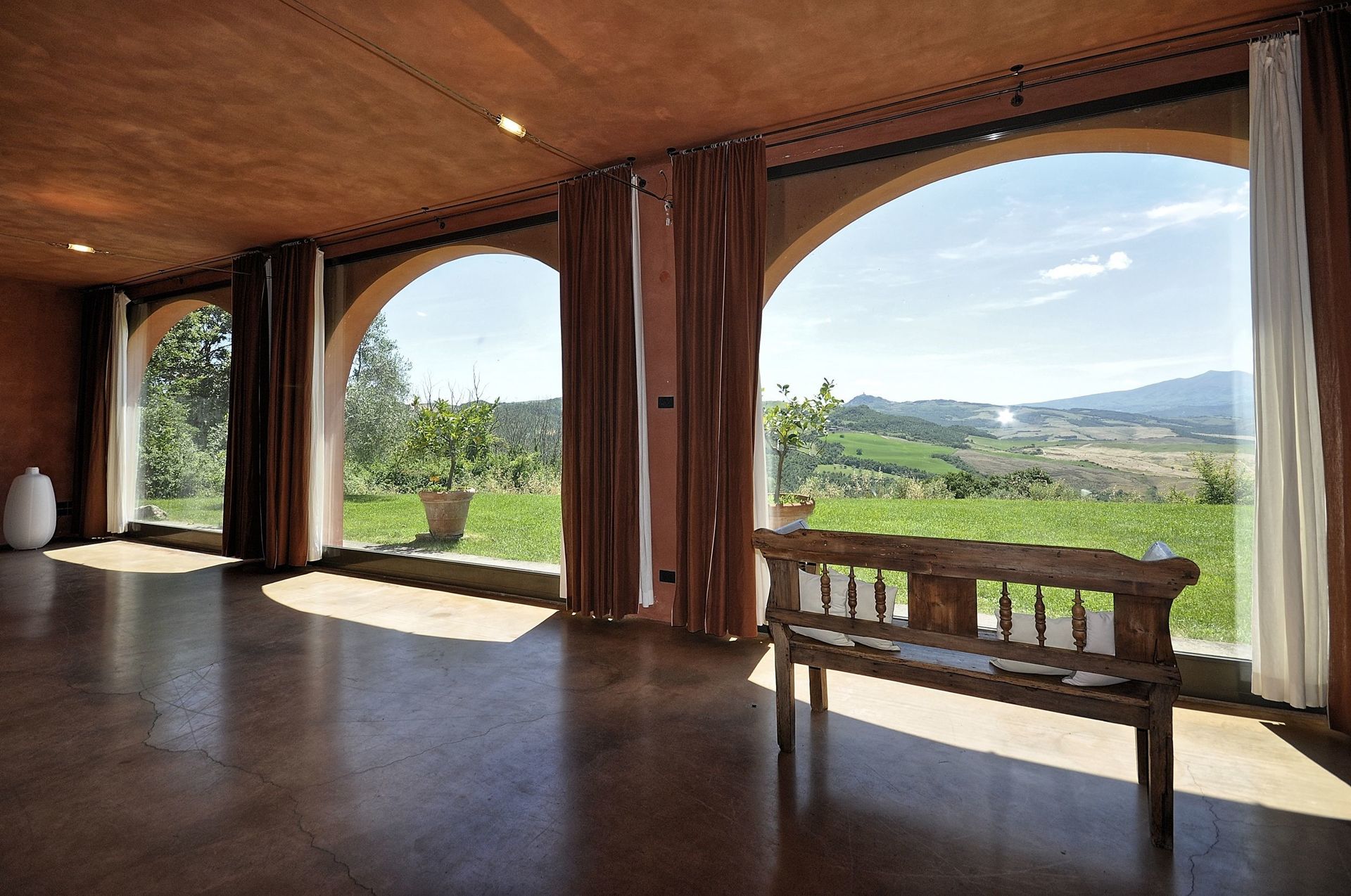 Annex: from the dining room a French door take to a big room equipped with sofas arm chair and working fireplace, the characteristic of this room are its large arch windows facing the garden giving amazing view of the Val d’Orcia hills.