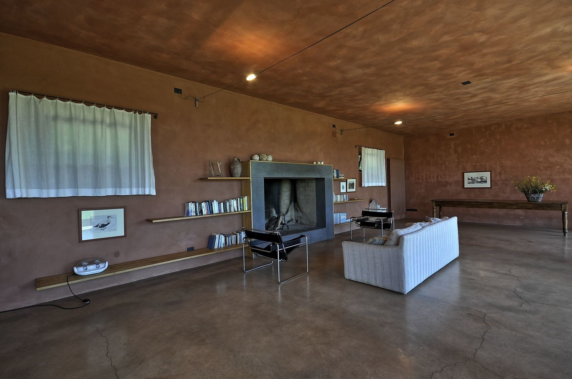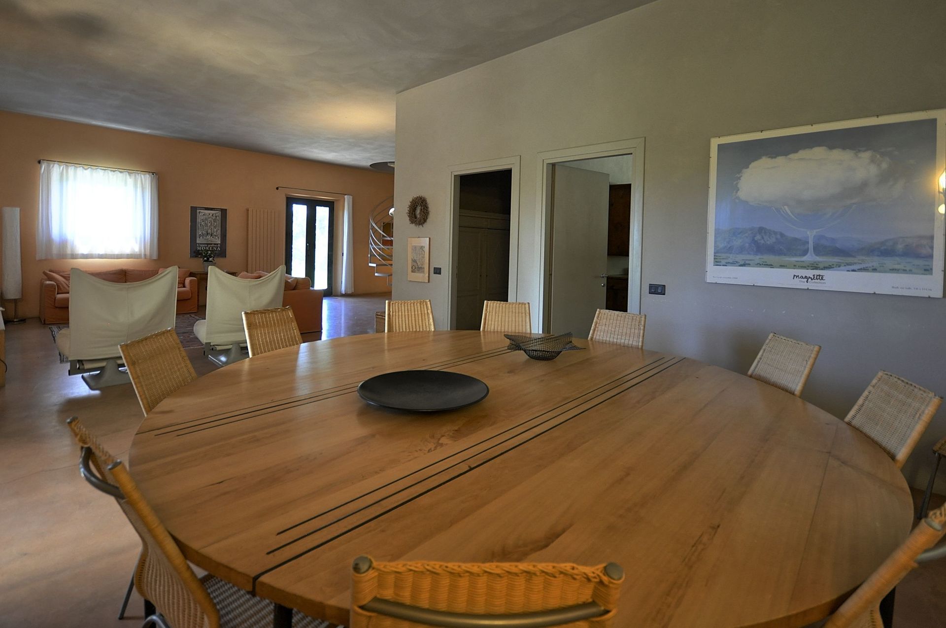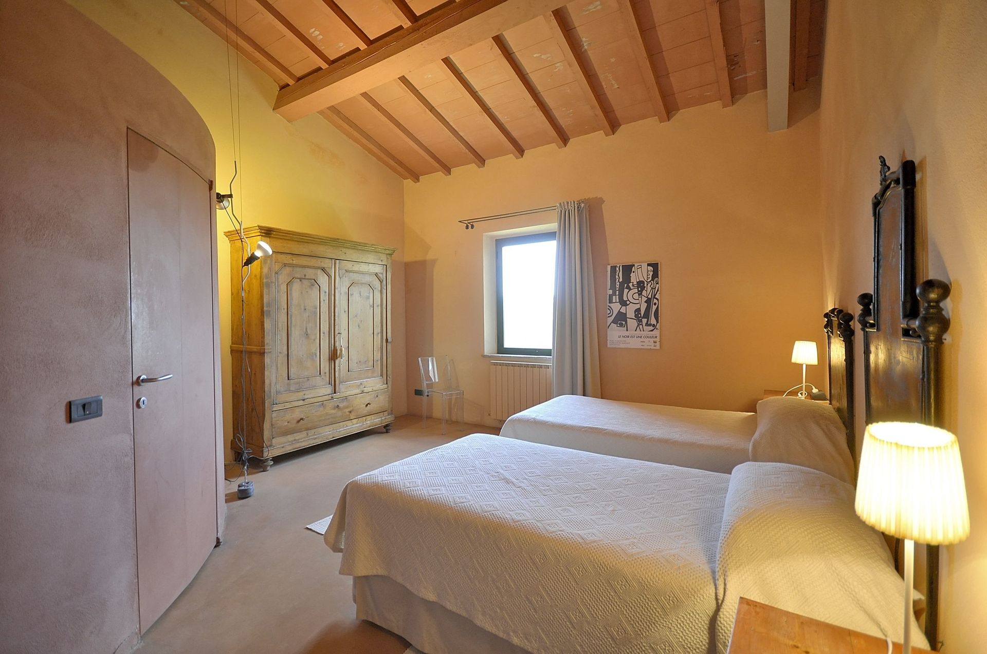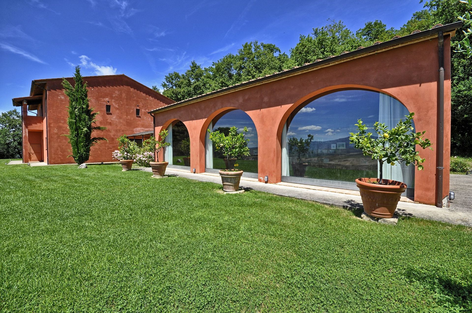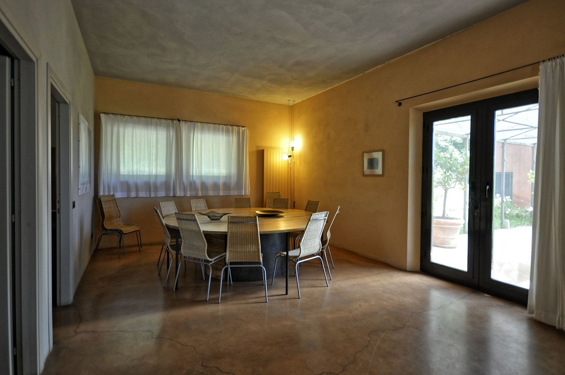 Annex: from the dining room a French door take to a big room equipped with sofas arm chair and working fireplace, the characteristic of this room are its large arch windows facing the garden giving amazing view of the Val d’Orcia hills.