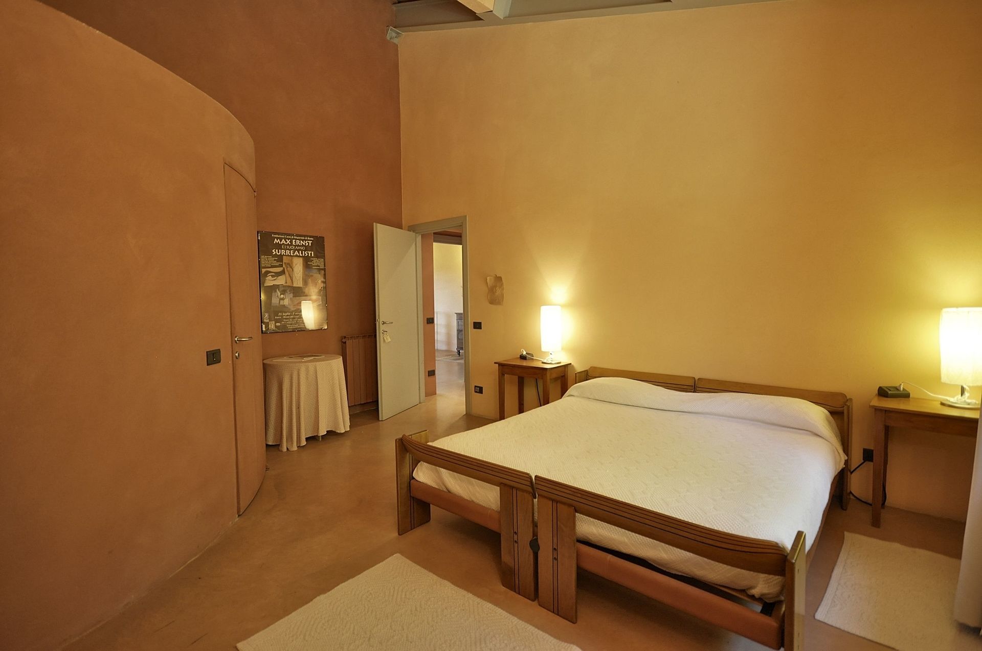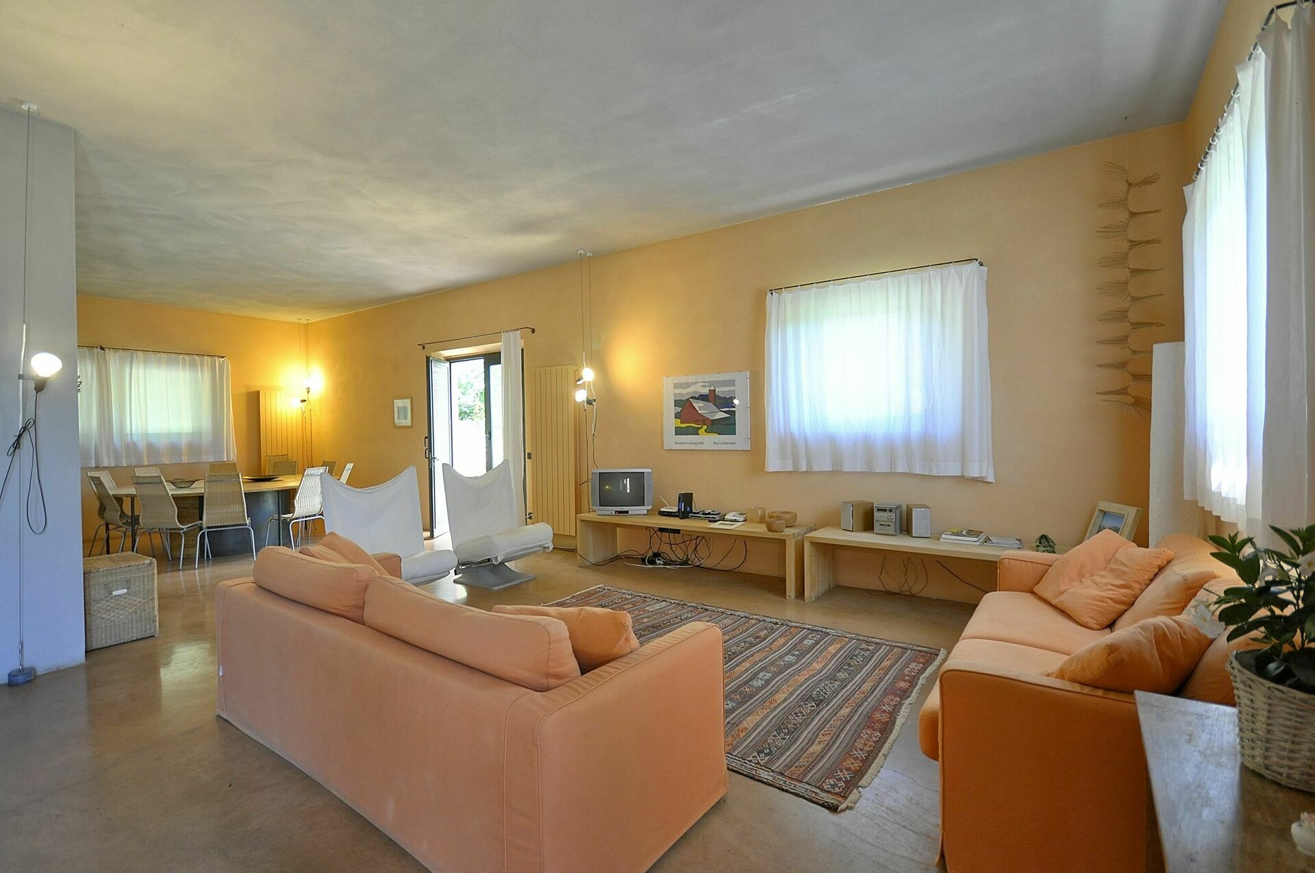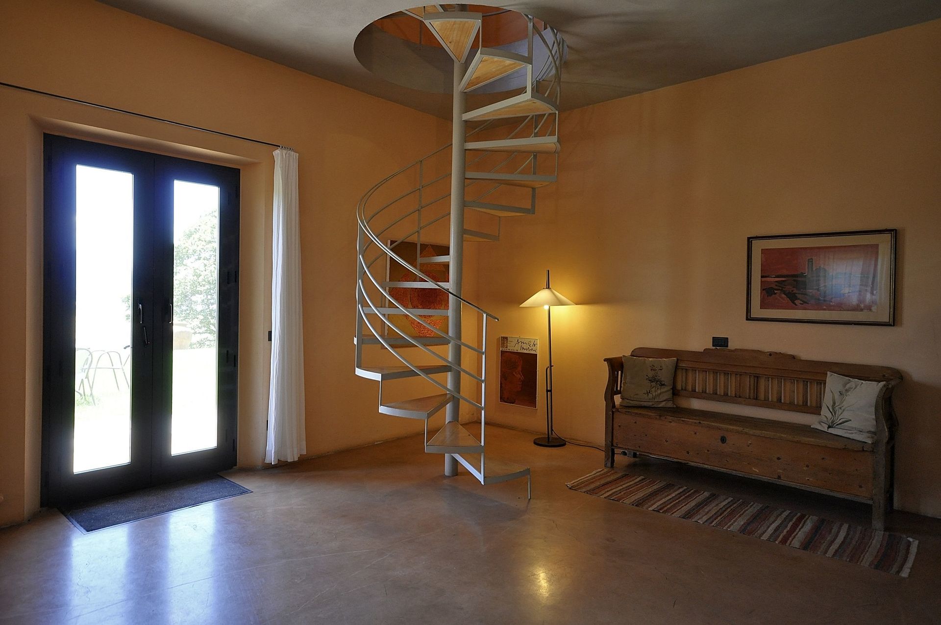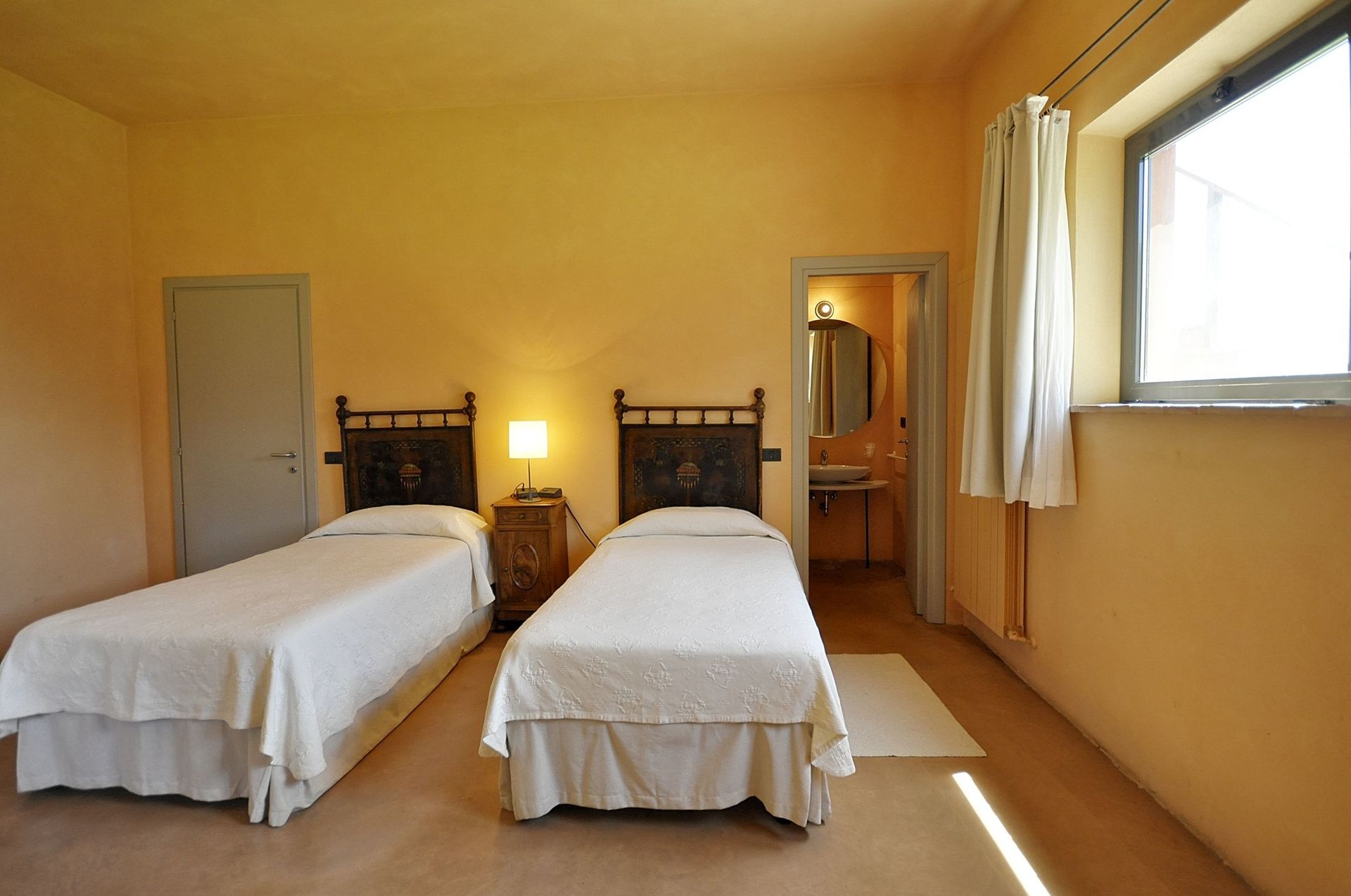 Annex: from the dining room a French door take to a big room equipped with sofas arm chair and working fireplace, the characteristic of this room are its large arch windows facing the garden giving amazing view of the Val d’Orcia hills.