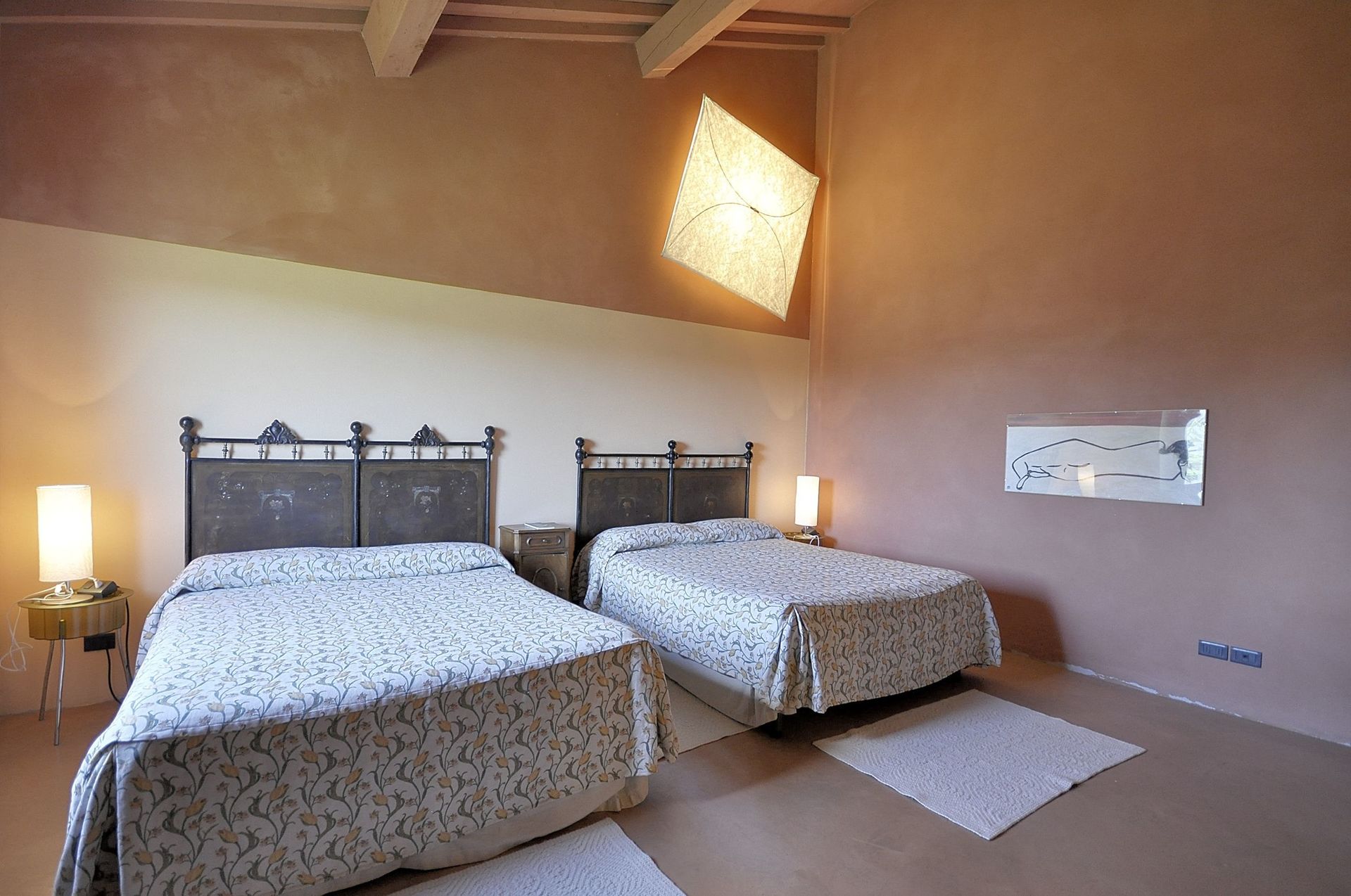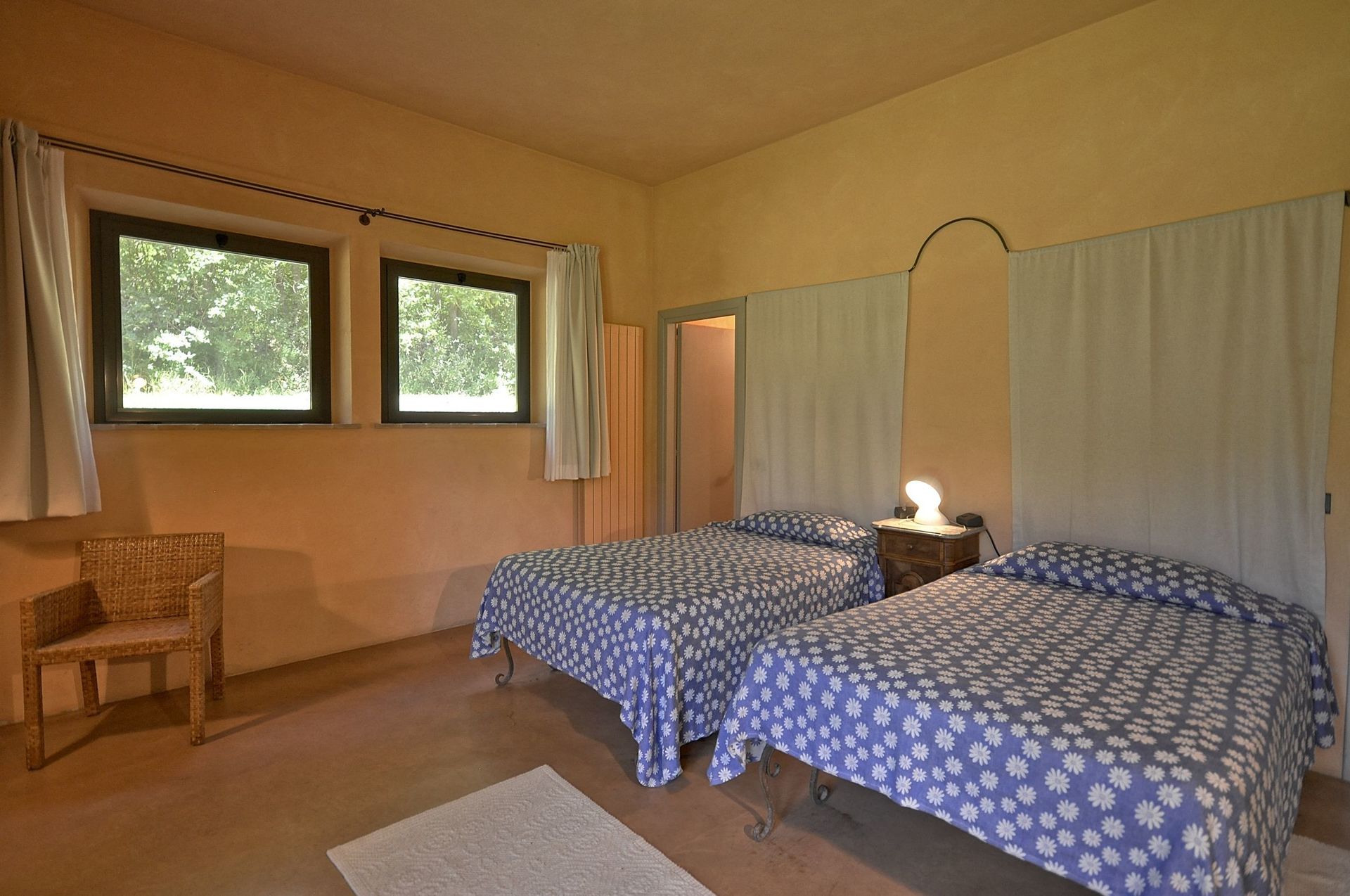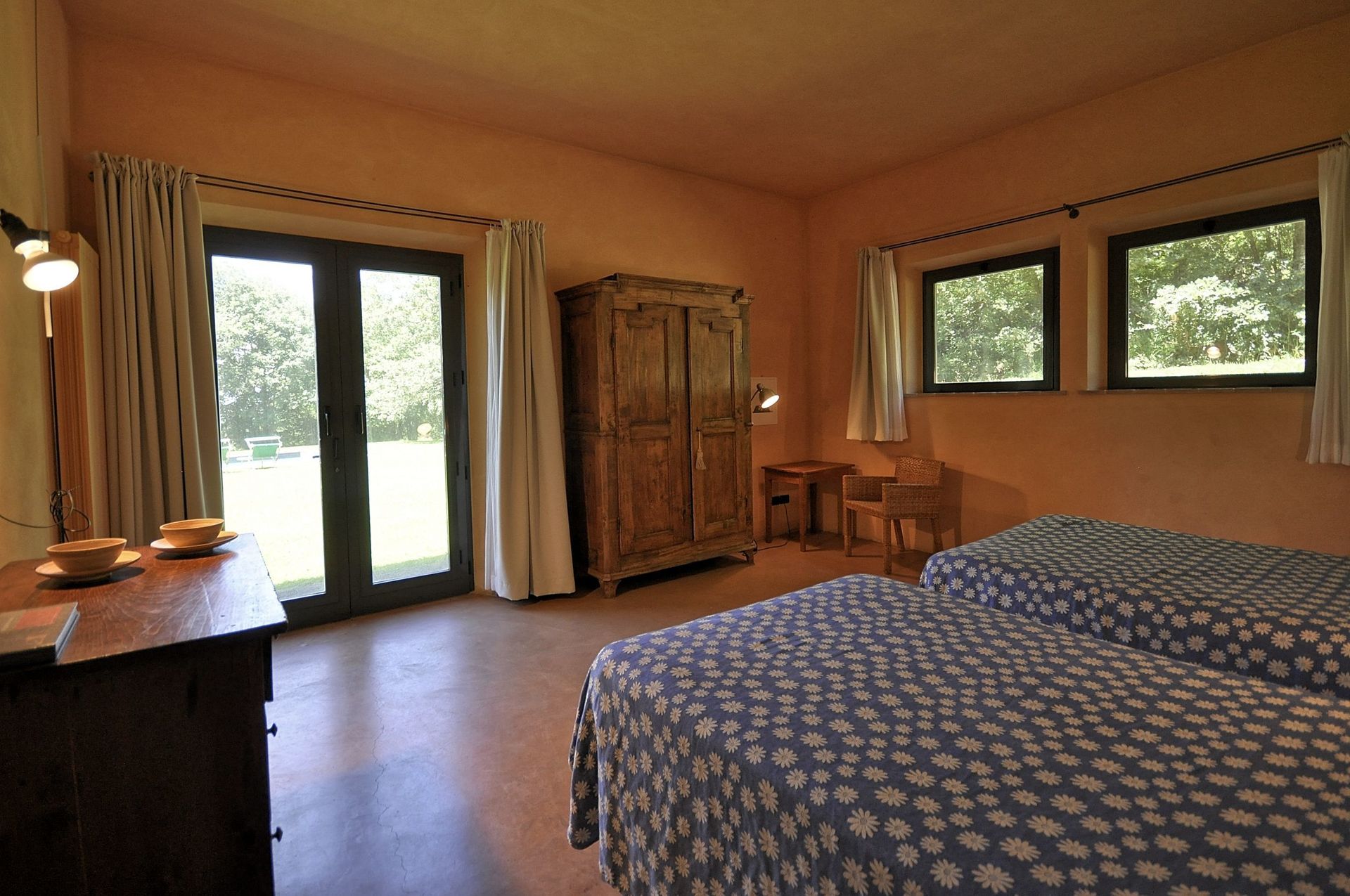 it this floor there are the first two bedrooms, one with two single beds (joinable upon request), and the other with two French beds, direct access to the garden, both bedrooms have its own bathroom with shower.