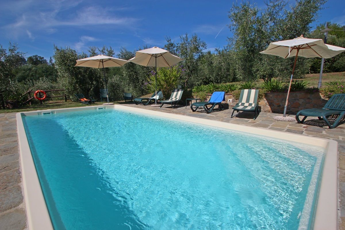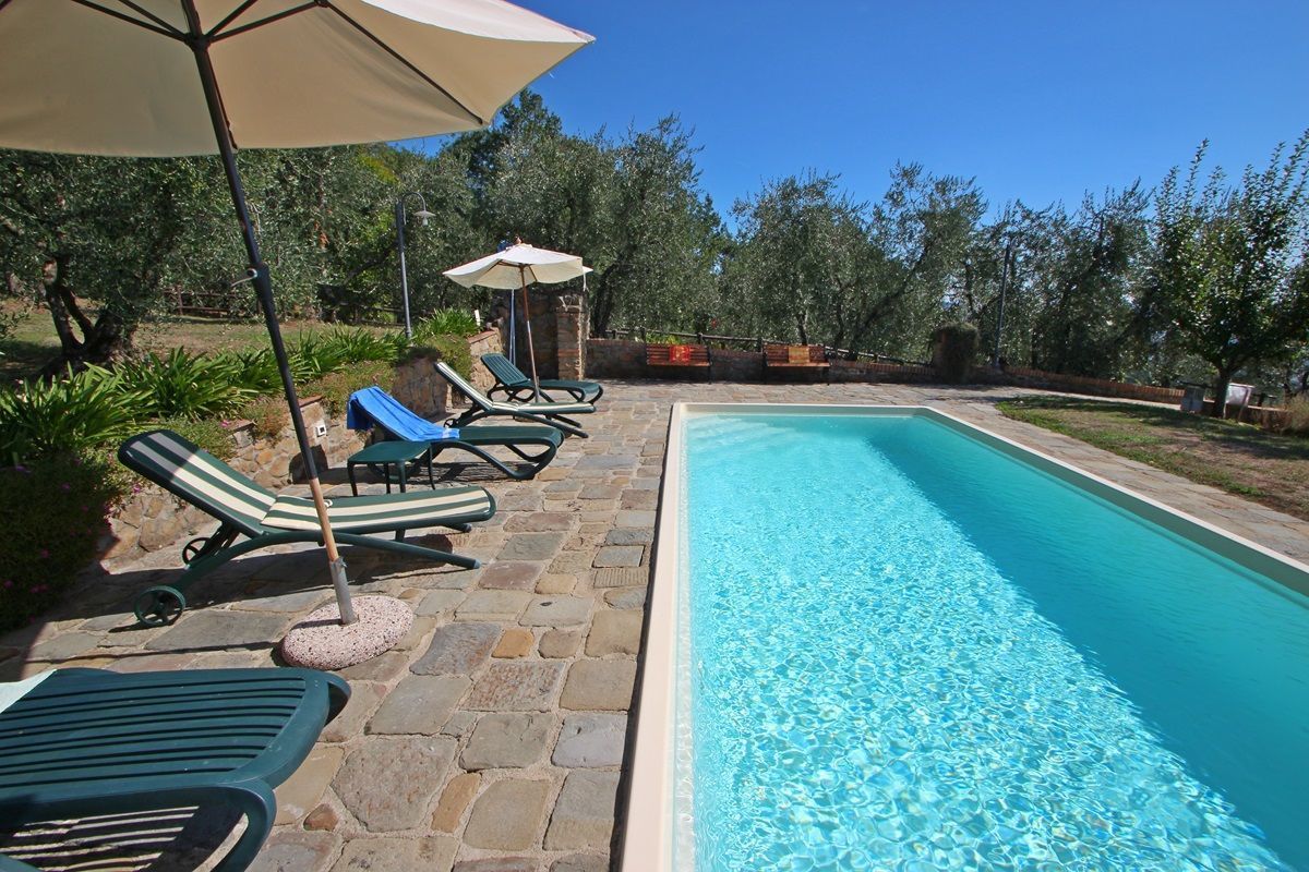 The pool shared by the two houses is located about 100 meters behind the main house on a terrace with panoramic views. Here guests have sunbeds, umbrellas, a cabin to store their belongings and a shower.