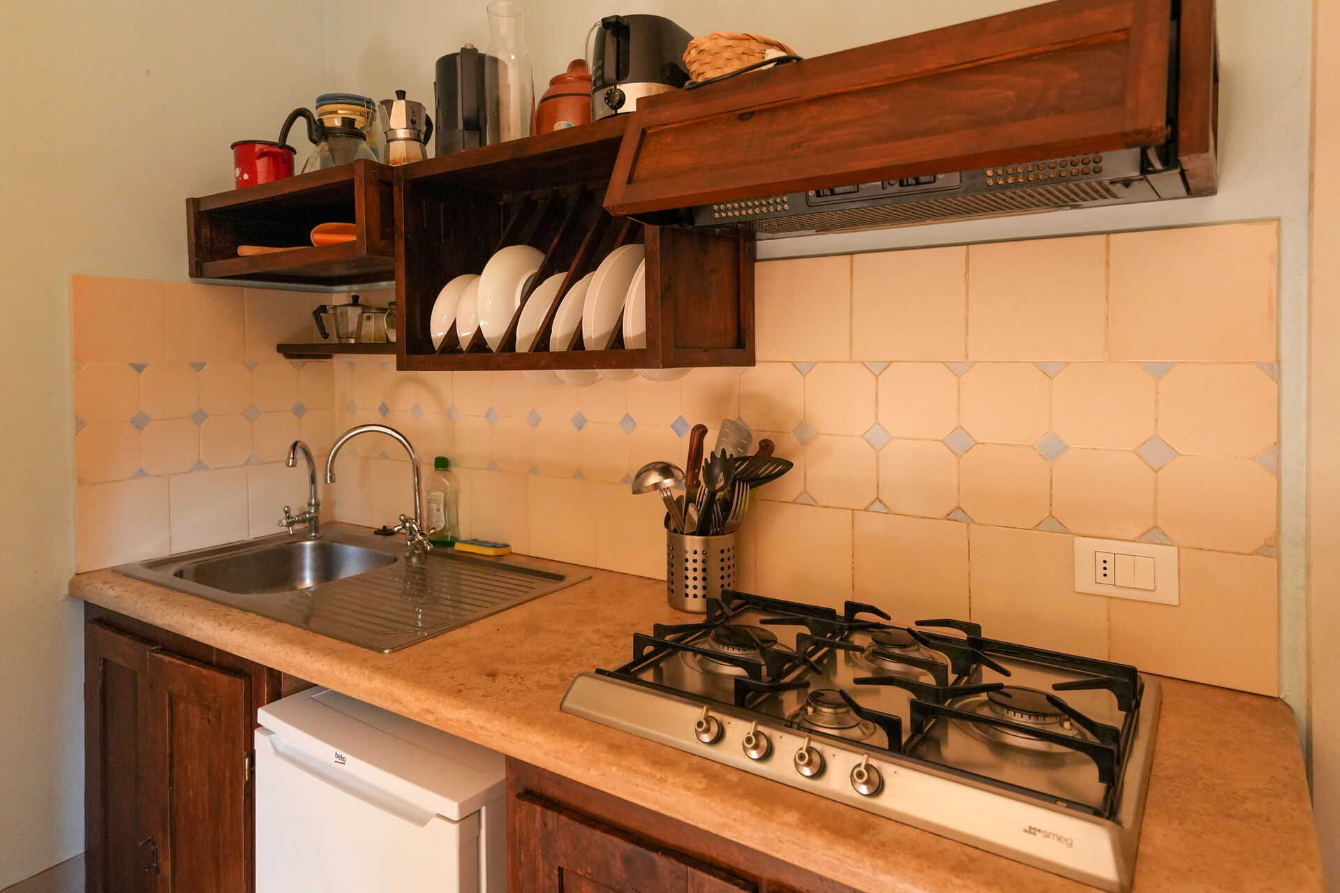 Hvis I nyder at lave mad til familie og venner så er der et veludstyret køkken med , samt masser af service og bestik til op til fire personer.