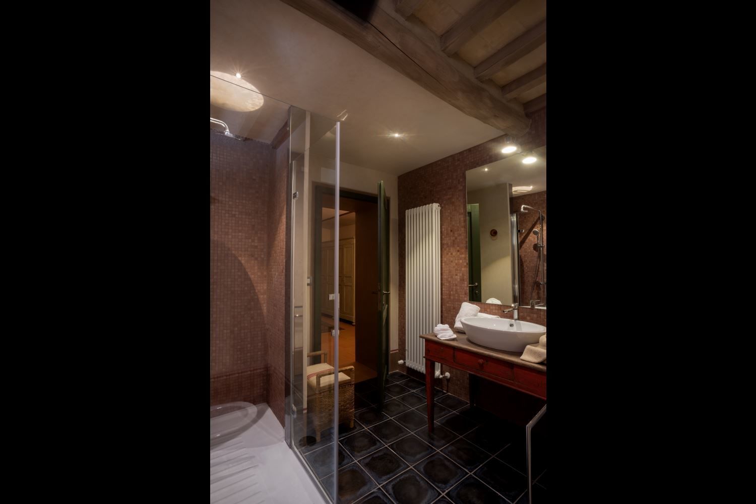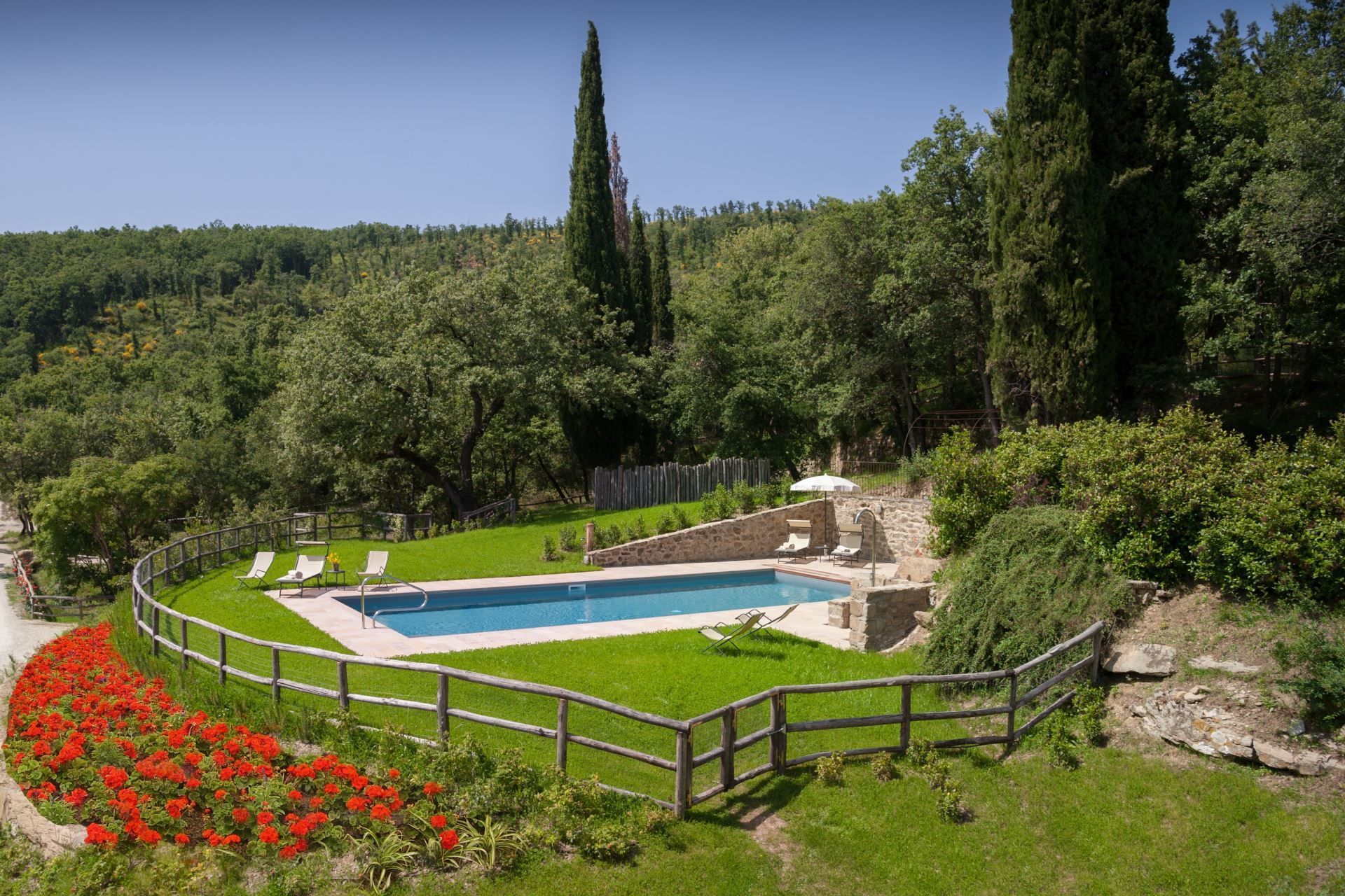 In front of the villa you will find the private garden and on the right-hand side the beautiful swimming pool (size 12x5 m, depth 1.40 m, completely enclosed - open from 01st May to 30th September). From here, every day, you can enjoy a splendid panoramic view over the city of Arezzo and its valleys, a view that becomes even more suggestive at night with the thousands of tiny lights that seem to chase each other. You will reach the centre of Arezzo in less than 10 minutes by car and here you will find all the necessary amenities and services, as well as museums, magnificent churches, cathedrals and monuments to visit.
