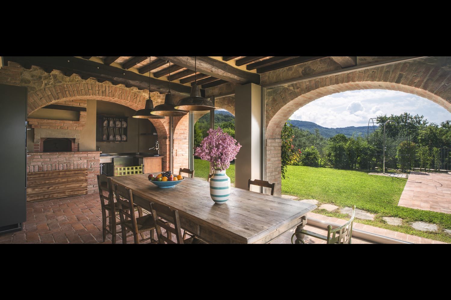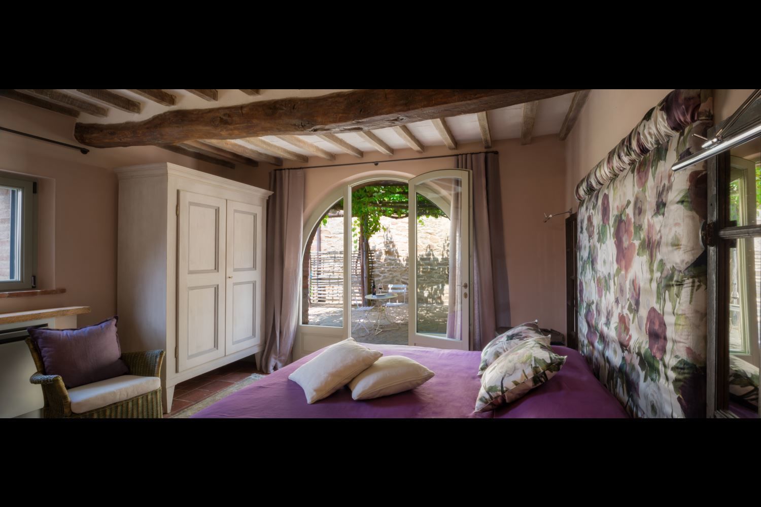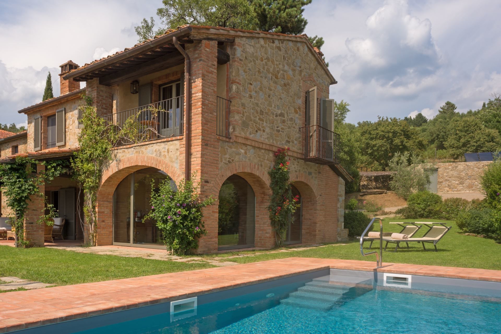 You will find Villa Mandorlo inside the ancient Podere di Pomaio, just outside Arezzo. It is an old farmhouse that has been renovated following all of today's eco-sustainability standards, which are similarly applied to the entire estate, which produces and exports excellent Tuscan IGT and DOCG wines. Podere Pomaio's Bio-architecture winery is listed among the 14 most beautiful Design Cellars in Tuscany for the Toscana Wine Architecture project.