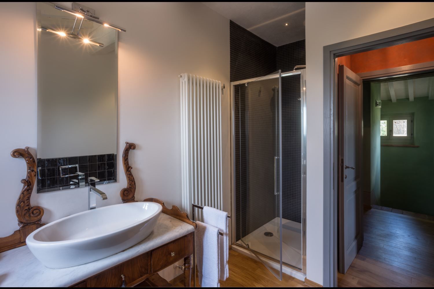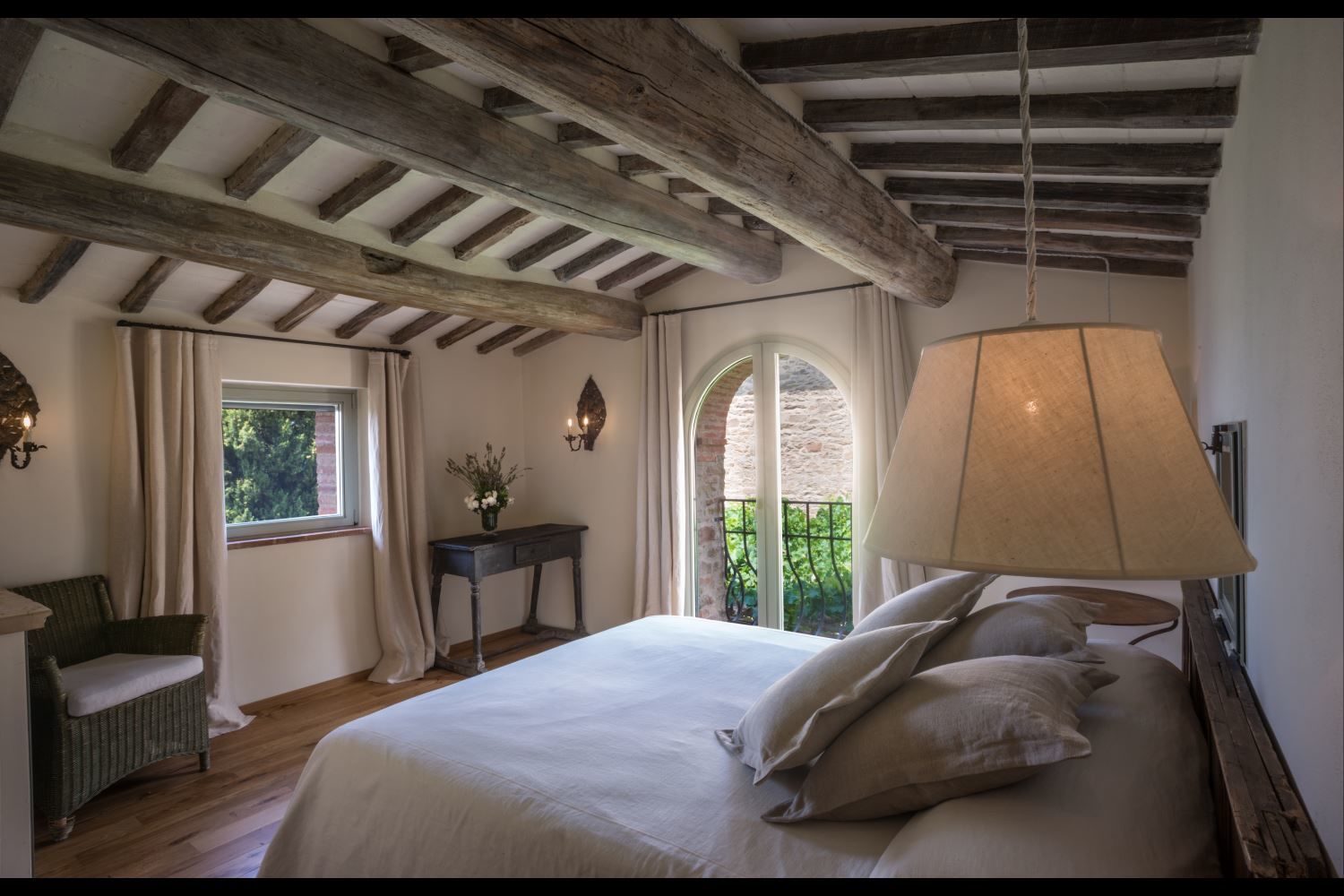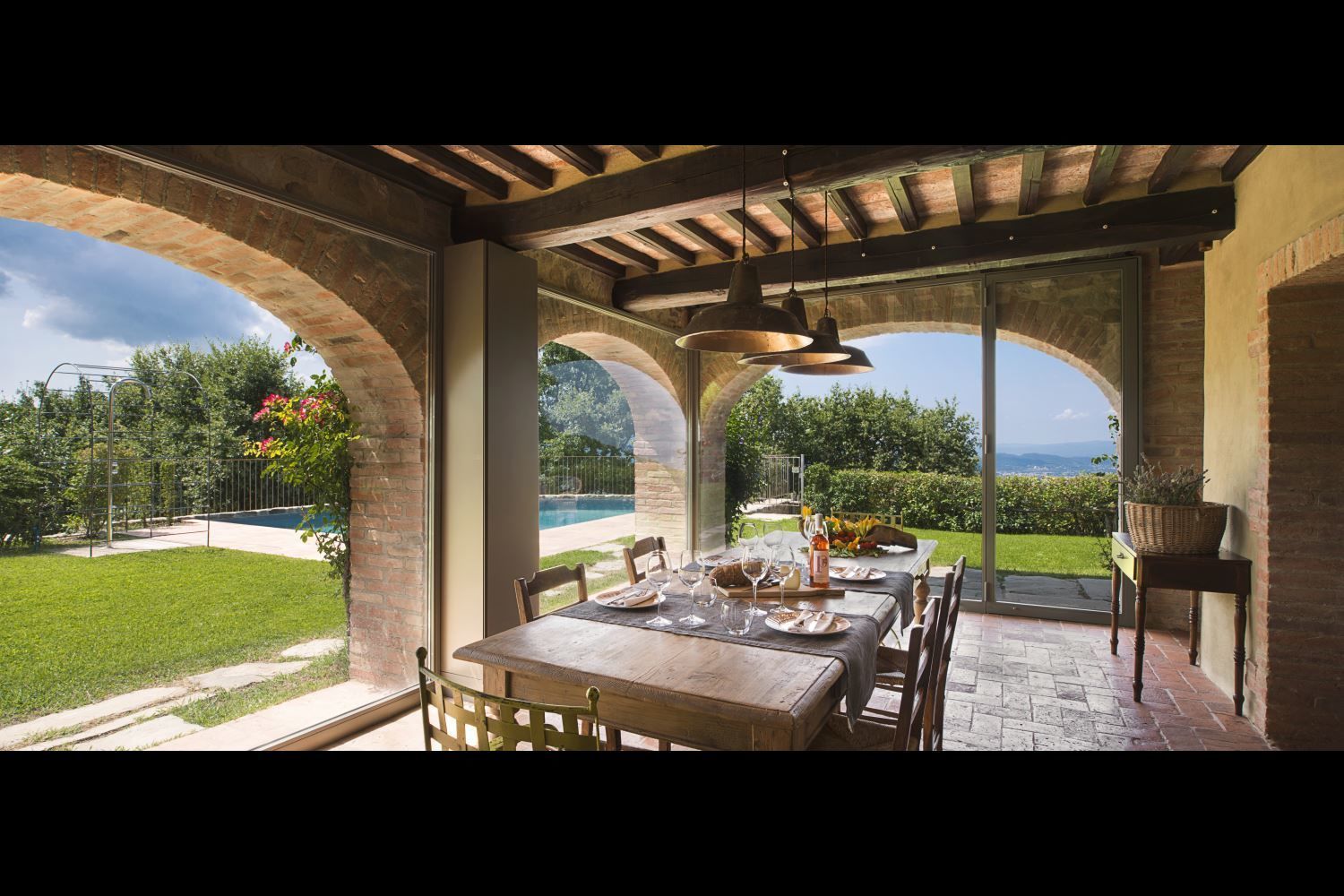 You will find Villa Mandorlo inside the ancient Podere di Pomaio, just outside Arezzo. It is an old farmhouse that has been renovated following all of today's eco-sustainability standards, which are similarly applied to the entire estate, which produces and exports excellent Tuscan IGT and DOCG wines. Podere Pomaio's Bio-architecture winery is listed among the 14 most beautiful Design Cellars in Tuscany for the Toscana Wine Architecture project.