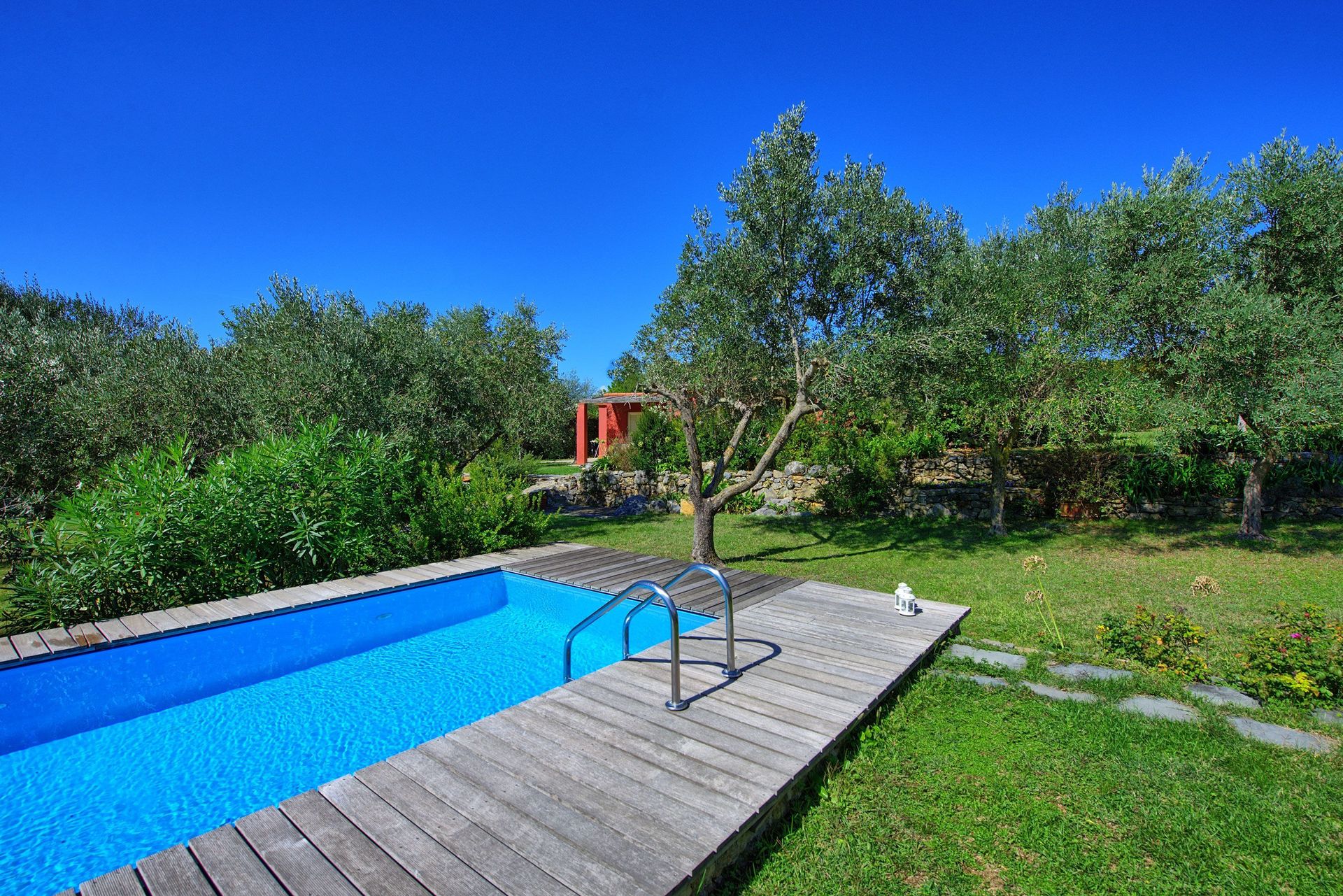 Ejeren bor 50m fra huset og gæsterne kan nyde godt af en stor have, som omfatter en terrasse foran feriehuset (møbleret med borde, stole og en grill), og en dejlig swimmingpool der måler 5x2.5m (komplet med liggestole og parasoller), for hvilke kan køle på varme sommerdage
