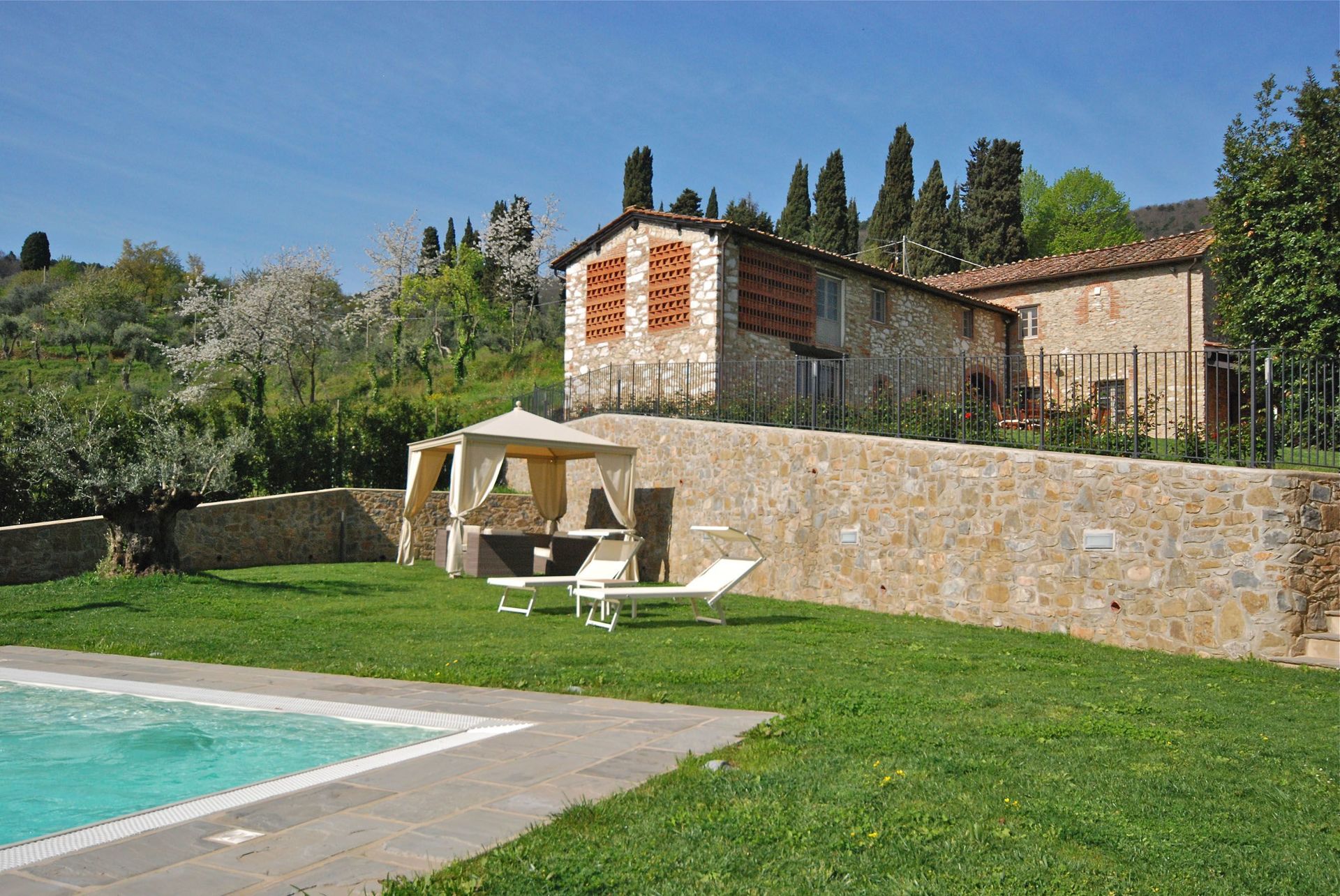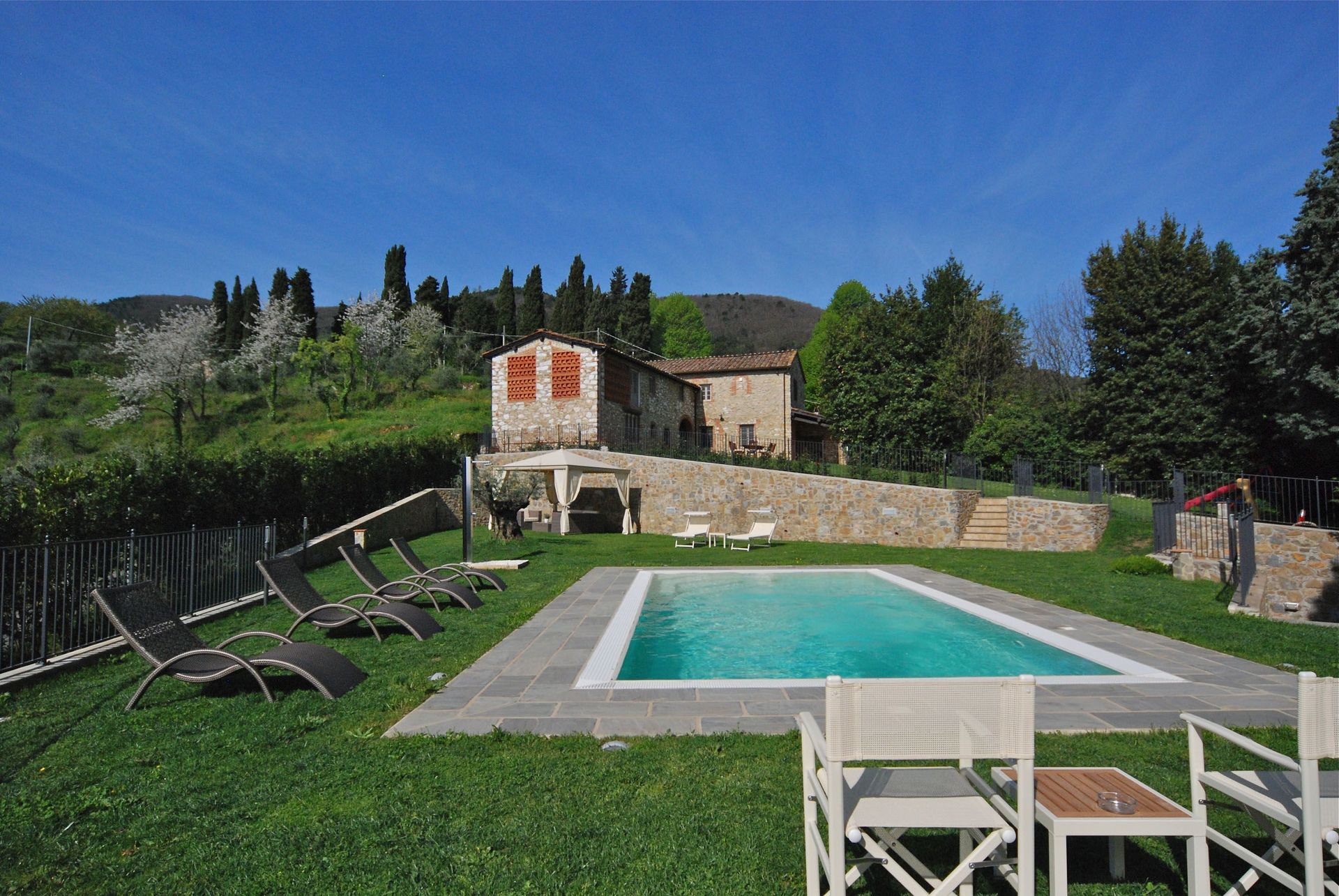 Ein sehr schön gelegenes Anwesen mit großen Räumen im toskanischen Stil. Die großen Rasenflächen wurden täglich am frühen Morgen bewässert. Wir hatten einen sehr erholsamen Urlaub und genossen täglich den Pool mit eingebauter Gegenstromanlage. Der Pool wird 2mal pro Woche gereinigt. Wir hatten die Option die Bäder und die Küche alle 2 Tage reinigen zu lassen. Für einen Abend haben wir den uns empfohlenen Koch bestellt. Dieser servierte uns (10 Personen ) ein hervorragendes toskanisches Menue, welches in der hauseigenen Küche vorbereitet wurde. Auch der Besuch eines Weinbaubetriebes mit Verkostung von 8 verschiedenen Weinen war ein schönes Erlebnis. Gerne empfehlen wir die Villa Montefiore weiter.
