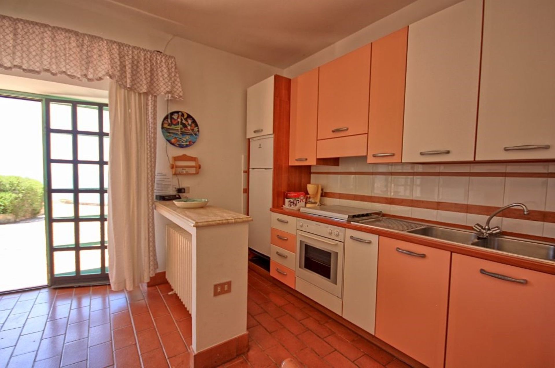 Køkken - stue: spisebord, køleskab, kogeplader, ovn, strygejern, italiensk kaffemaskine, sofa, kamin, enkeltseng, satellit tv, tv, udgang til have.