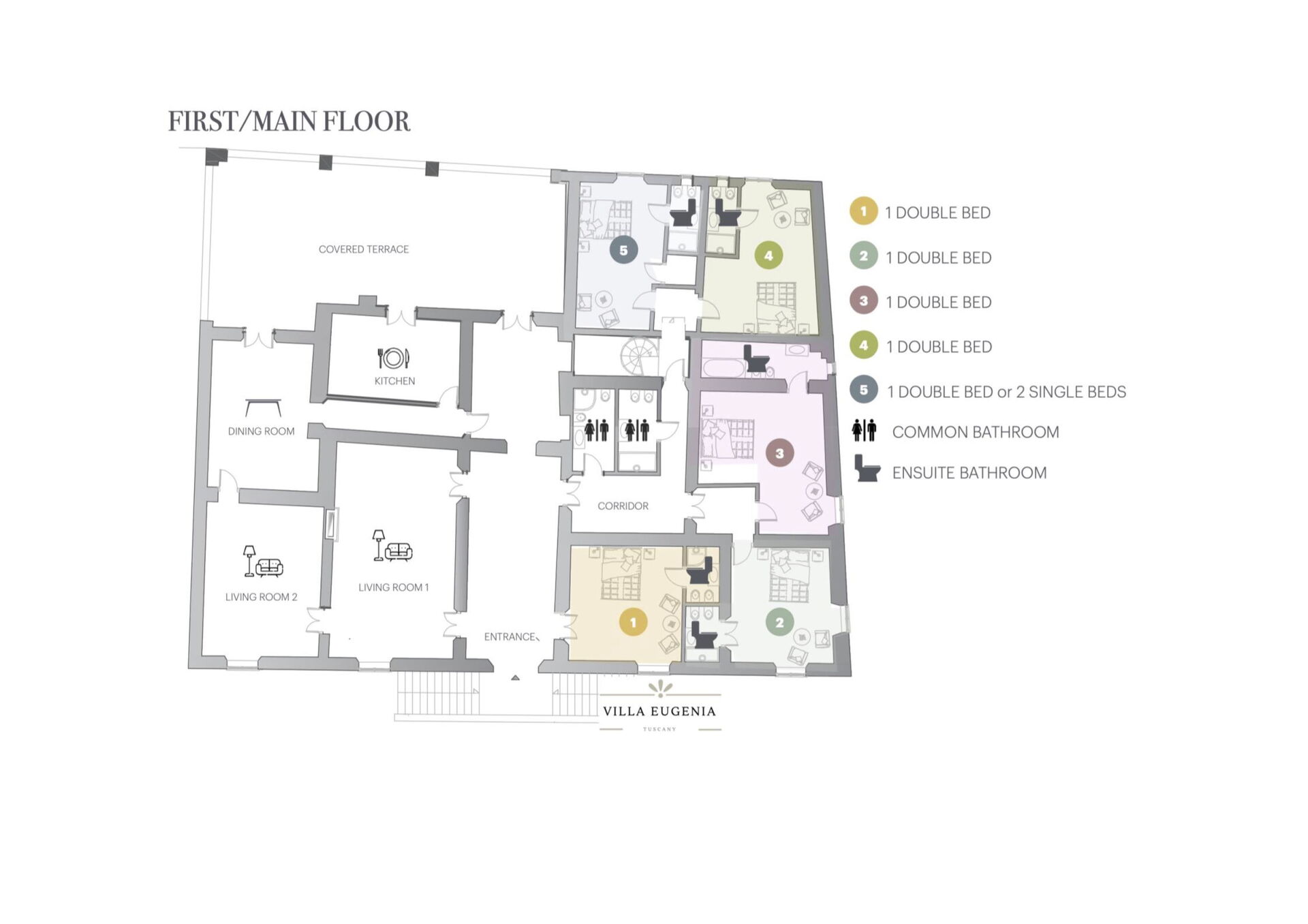 Ved ankomst vil I møde en flot ren velholdt ejendom med udsigt over bakkerne perfekt til rolig ferie i Toscana. Uanset hvordan I tilbringer dagene - med sightseeing, museumsbesøg, shopping eller bare ved at køre rundt på landet, så kan I slappe af med familie og venner ved poolen, når I kommer hjem, hvilket er en perfekt måde at afslutte endnu en dejlig dag på i Toscana. Udendørs vil I finde grill og gårdhave. Hvis I nyder at lave mad til familie og venner så er der et veludstyret køkken inkluderet kaffemaskine, mikroovn, brødrister, komfur og køleskab, samt, , samt masser af service og bestik til op til 20 personer. Hvis I foretrækker at spise 'al fresco', er der en fuldt møbleret veranda, hvor I kan nyde vejret, mens I spiser udendørs.