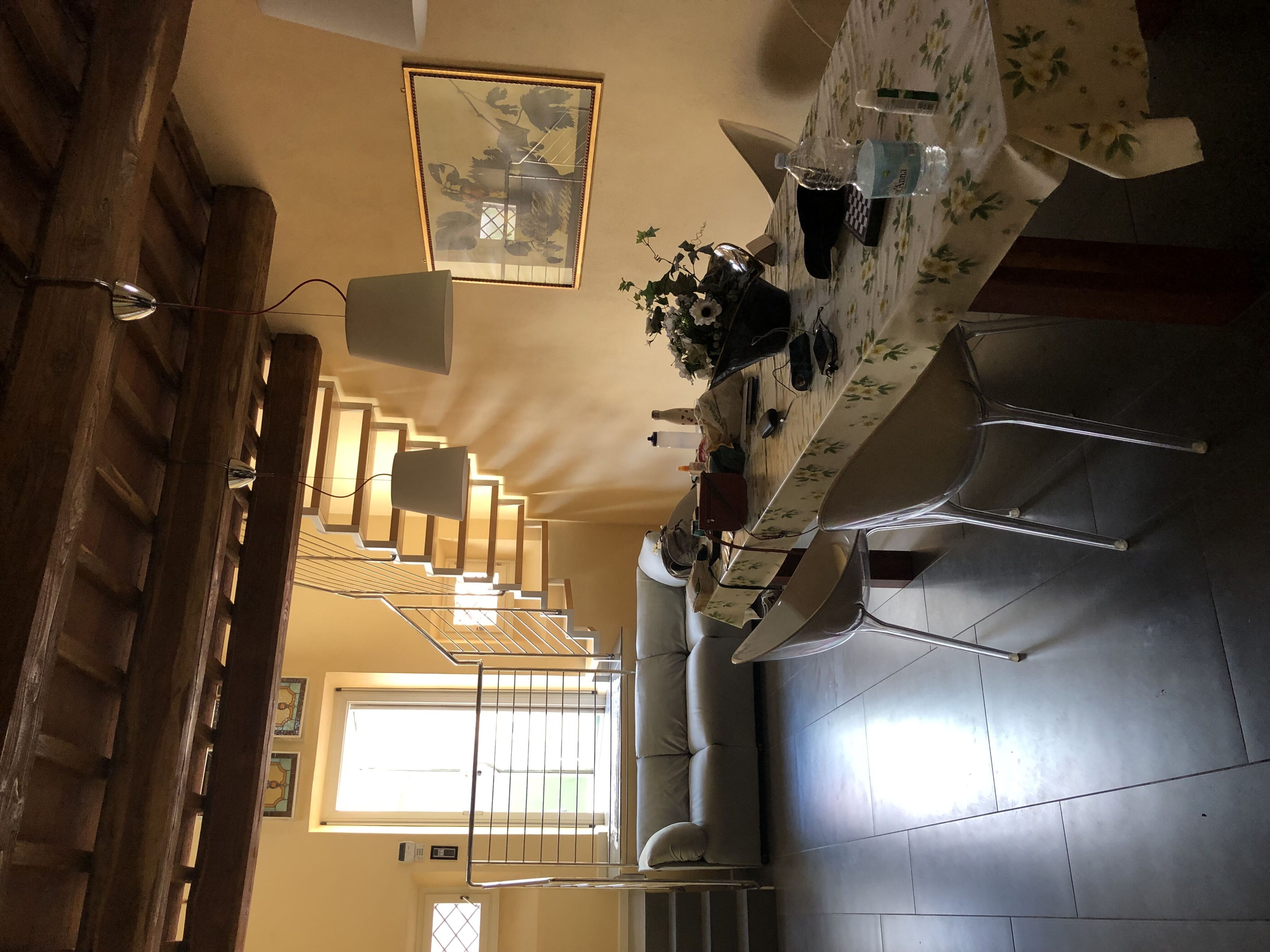 Entrance on the ground floor: dining room with table made of glass, huge modern kitchen with cookery island with stove with 5 fires, oven, microwave, dishwasher, filter coffee maker, toaster, big fridge/freezer, 1 bathroom with toilet, basin, bidet, outdoor area with sink, washing machine, and lift to the 1st floor.