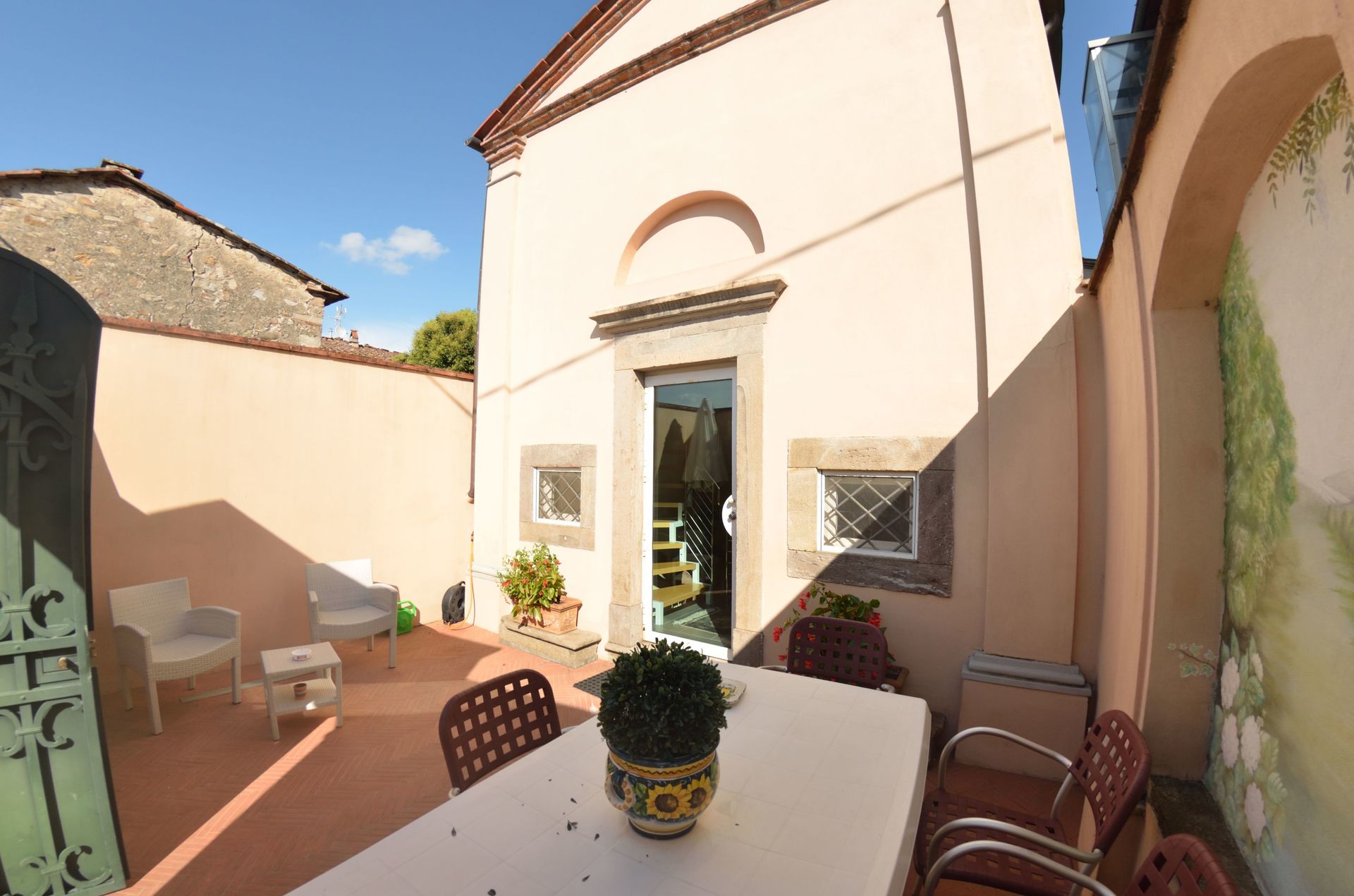 The owners ‘villa is located within the grounds of Magia 2; the chapel i.e. the holiday home Magia 2 is detached on the back of the owners’ villa. The holiday home disposes of an independent access to the house within an outdoor area which is equipped with a table, chairs und barbeque for your fine dining al fresco.