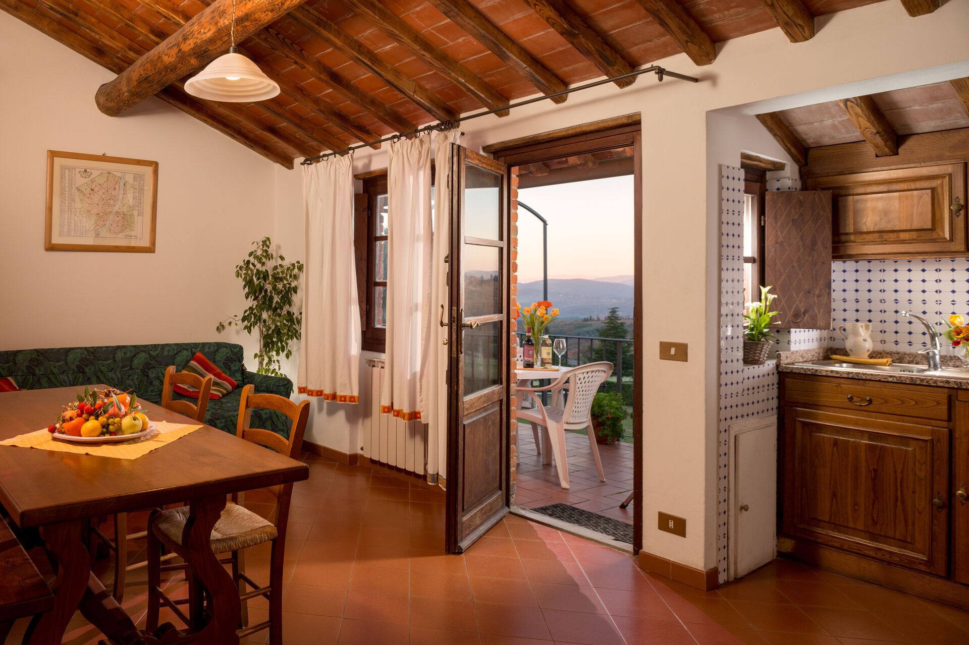 Der er et køkken med kaffemaskine og køleskab , samt masser af service og bestik til op til fire personer. Spis 'al fresco' som en ægte toskaner. Den fuldt møblerede gårdhave er det ideele sted for at nyde sit måltid, familien og det flotte toskanske vejr.