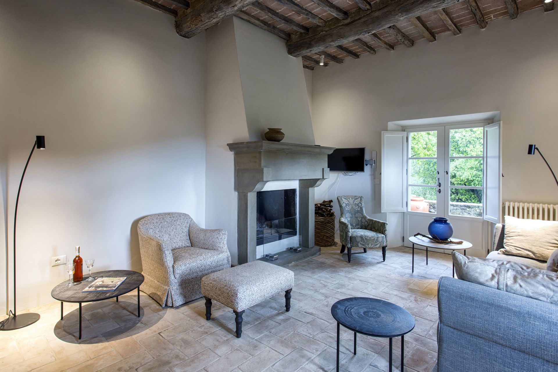 Stue: sofa, lænestol, kamin, WIFI internet, klimaanlæg, satellit tv, udgang til have.