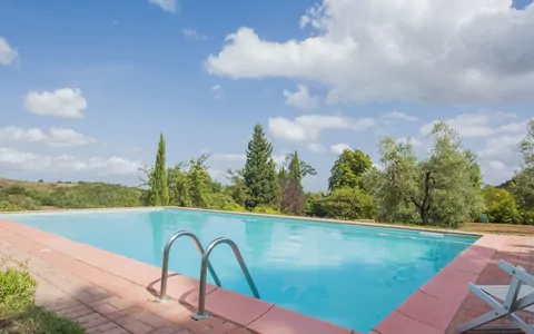 5 km from Chianni: Stone farmhouse surrounded by vineyards and olive groves, within a property that also includes a forest with a stream. The property situated in the Pisa inland. 5 km from the house is the thermal center of Casciana. Ability to add 4 beds (on request, extra). Air conditioning payable locally at EUR 15.00 per day. Manor house "Il Ruscello". 5 km from the centre of Casciana Terme, 40 km from the centre of Pisa, 60 km from the centre of Firenze, in a secluded, quiet, sunny position on top of a hill, in the countryside, in the woods. Private: property 42 ha with lawn, swimming pool (6 x 12 m, depth 150 cm, 23.05.-03.10.). Outdoor shower, garden furniture, barbecue. House maid on request (extra). Cook on request (extra). Motor access to the house (2 km via unmade road). Parking at the house. Shop 3 km, grocery 3 km, bus stop 1 km, railway station "Pontedera" 20 km, sandy beach 50 km, thermal baths "Casciana Terme" 5 km. Golf course 20 km, tennis 3 km, riding stable 3 km. Please note: car recommended.