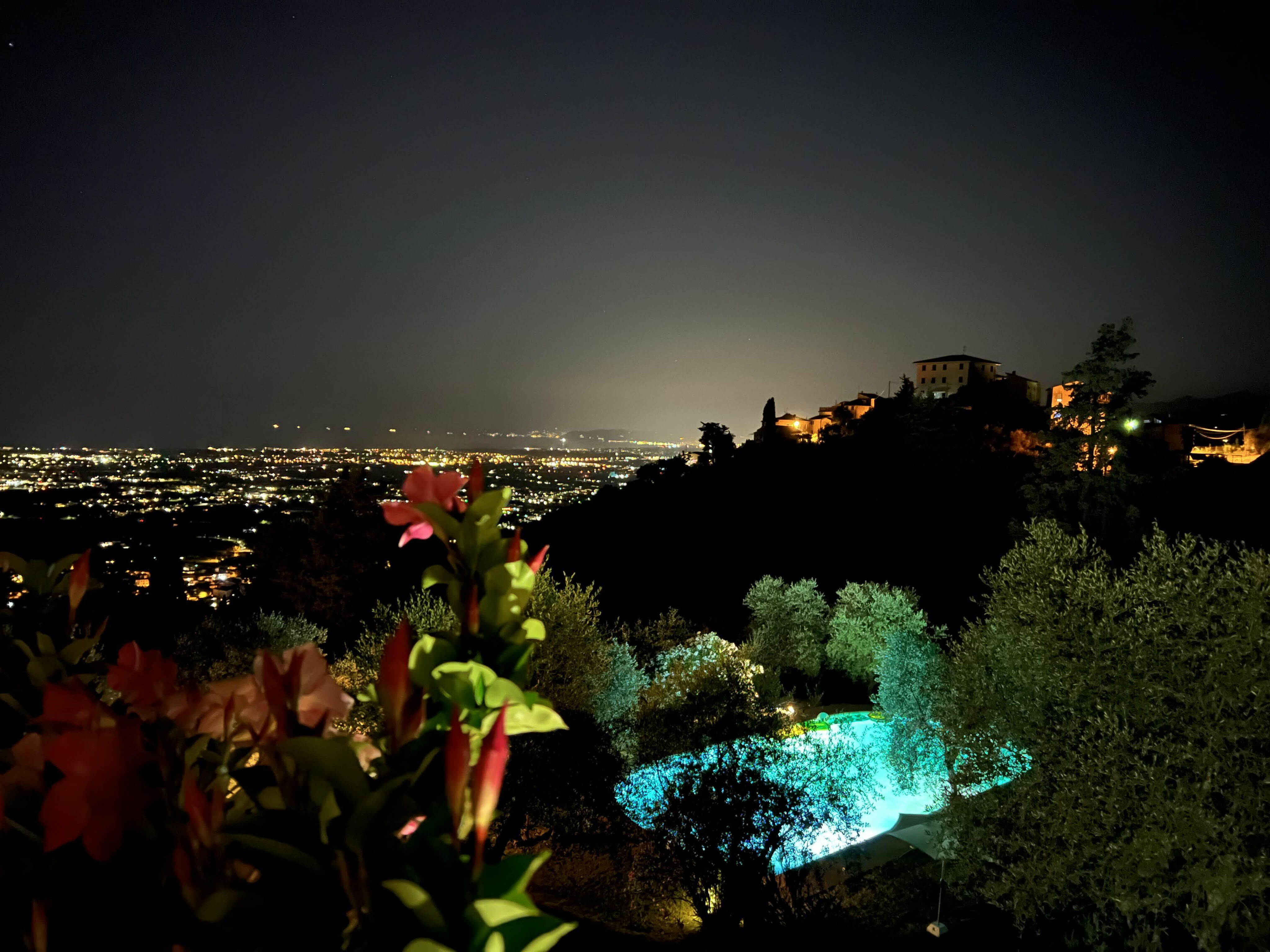 Large villa away from nearest neighbors set in a fully enclosed, terraced and gardened setting overlooking the sea above the Versilia coastline.