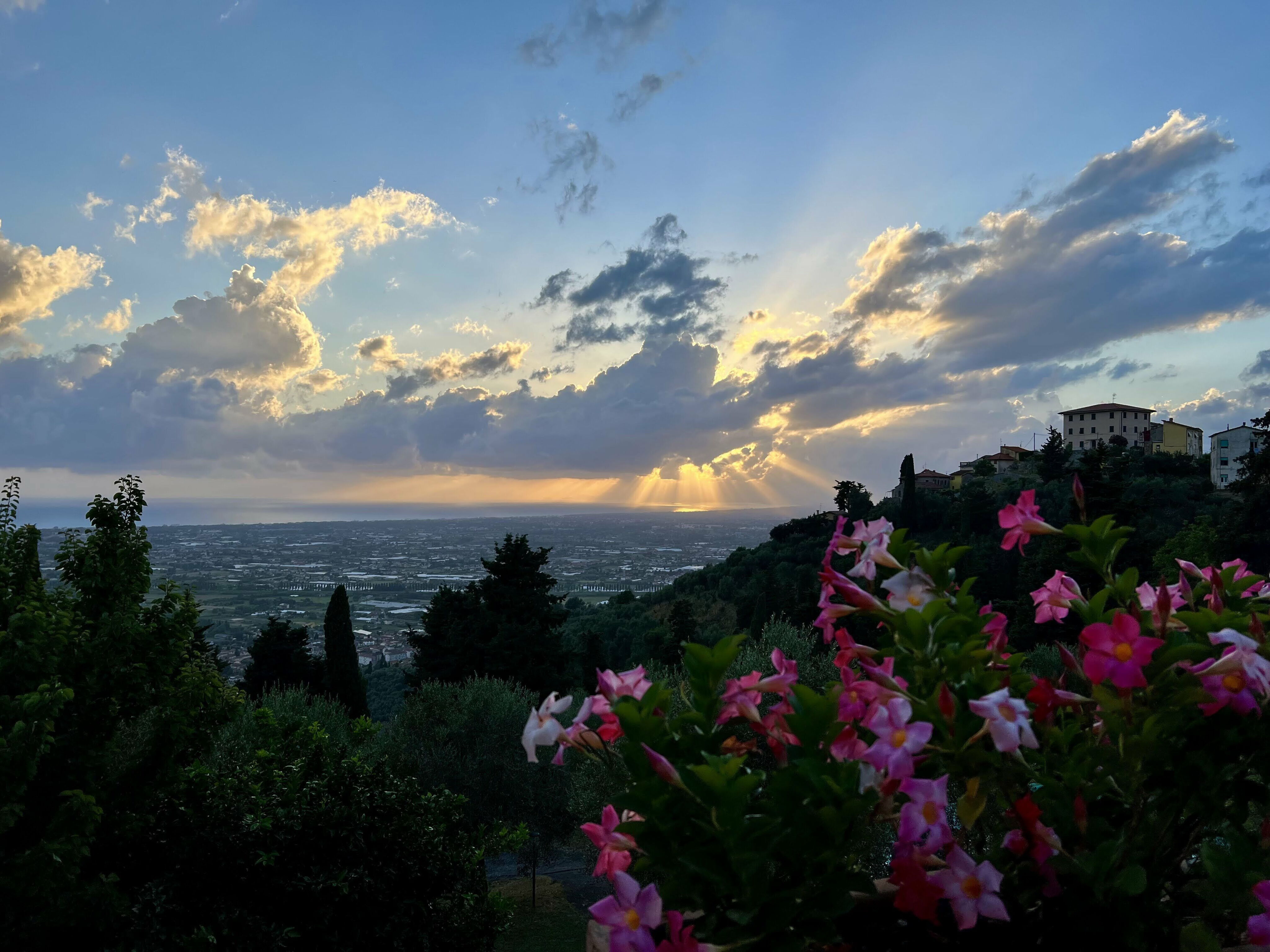 From its location at height of about 300 meters, the wonderful view extends north from above the beaches of Viareggio and Forte dei Marmi, on through the Gulf of La Spezia and on past the famous Cinque Terre.