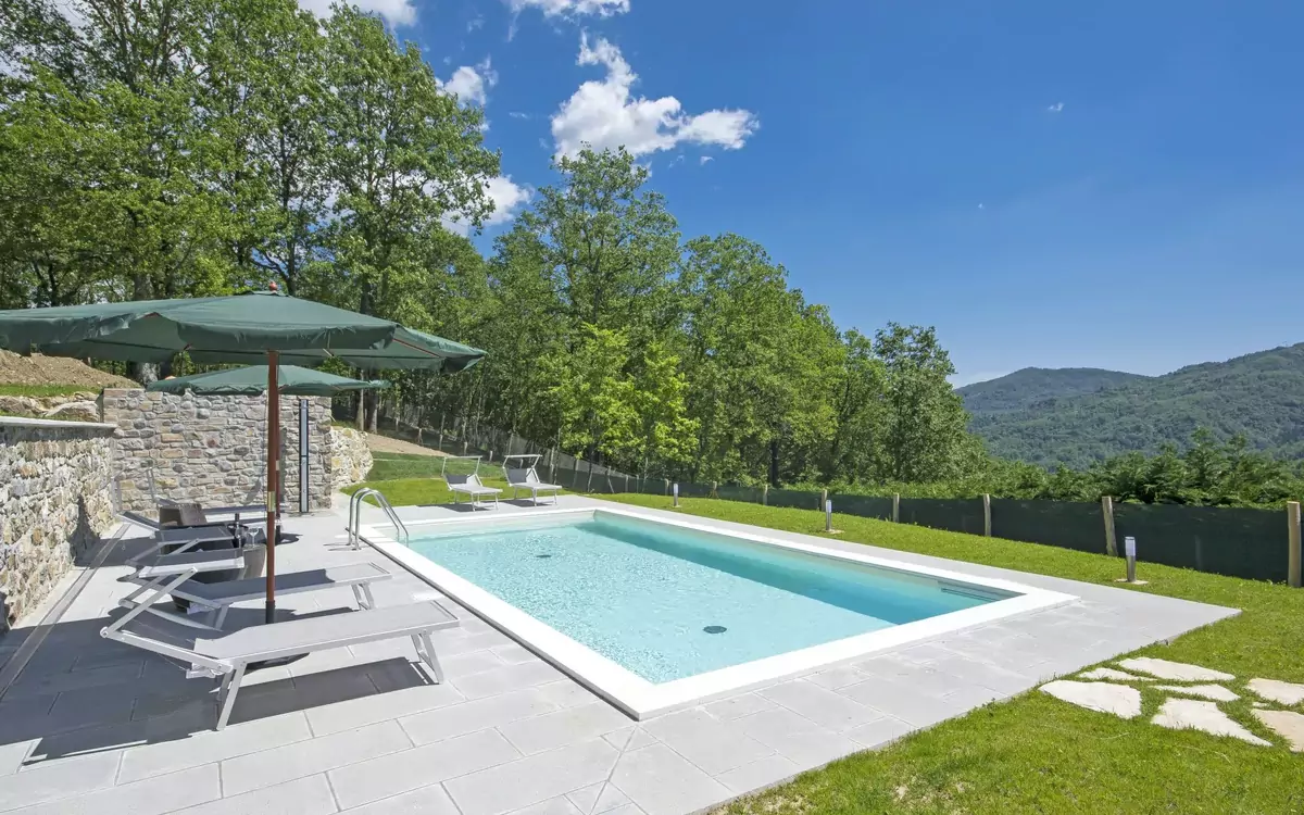 Den fælles svømmepøl måler 8 x 4 meter med en dybde på 120 cm og er tilgængelig fra 15. maj til 30. september. En udendørs bruser befinder sig i nærheden af poolen. Haven er udstyret med komfortable havemøbler, der inviterer til afslapning i skyggen af de omgivende træer. Et grillområde er til rådighed for udendørs spisning.