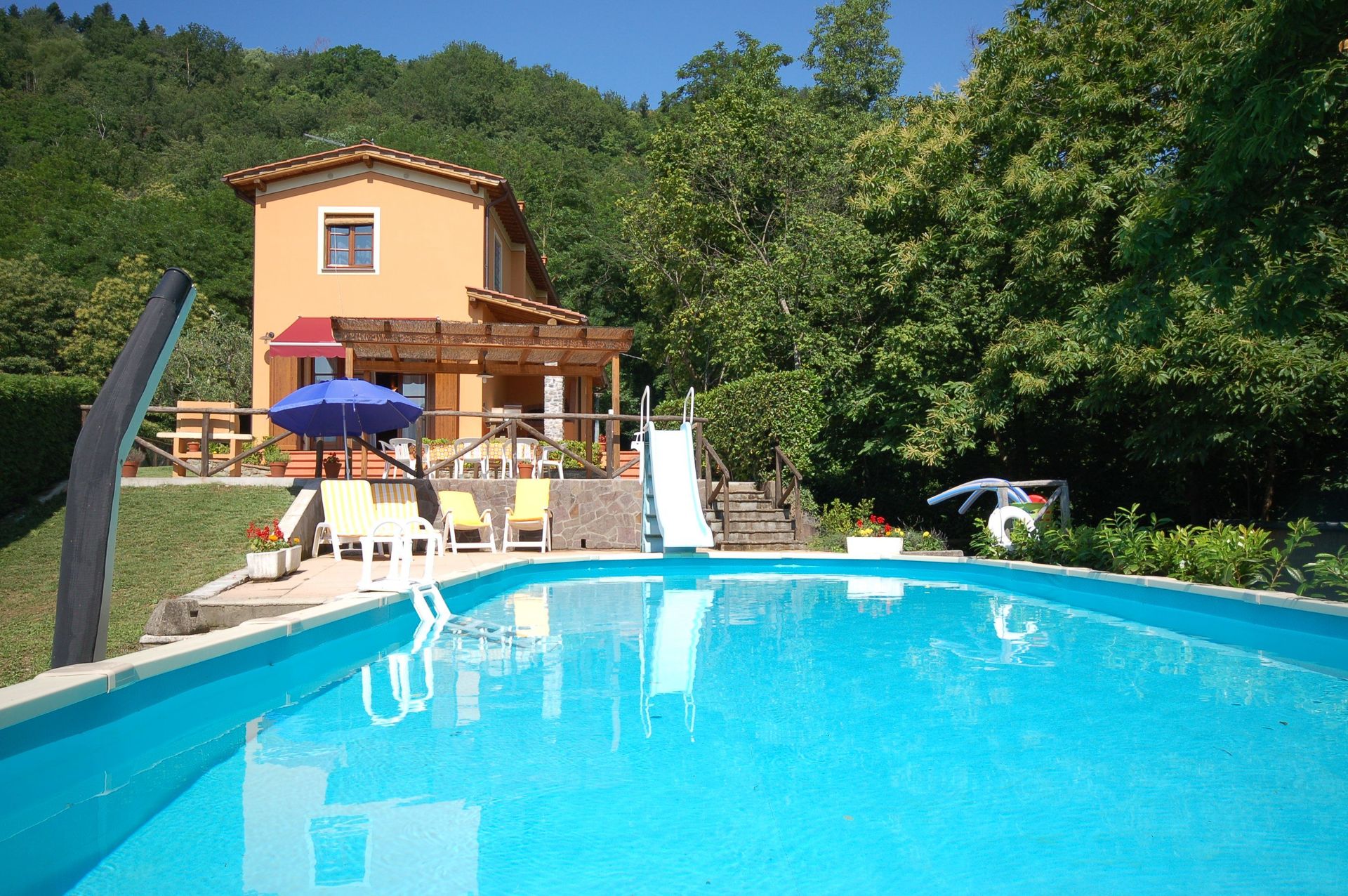 Over all a very nice house. Nice pool, very good equiped kitchen, nice bedrooms and nice bathrooms. But there are three little things. At first, there are only two sunbeds, and four sunchairs. For a house that is designed for eight people it is not enough to chill at the pool together. Secend, there is a deep slope next to the pool with no or only a litte fence in front of it, so water toys like balls or other stuff often roll the the hill and you have to put your shoes on to get them back and thrid, because of the mountains the pool and the house are in the shadow at around 6 pm (Last august week). But there the owner can not do much ;). And fourth we did not get the TV runing and the TV did not have a HDMI input. That was very sad for us. The owner of the house is very polite and they contact you on week before you came there by WhatsApp what makes it very easy to communicate with her (when you have internet, beacause in the house and the surroundings we had not have internet).