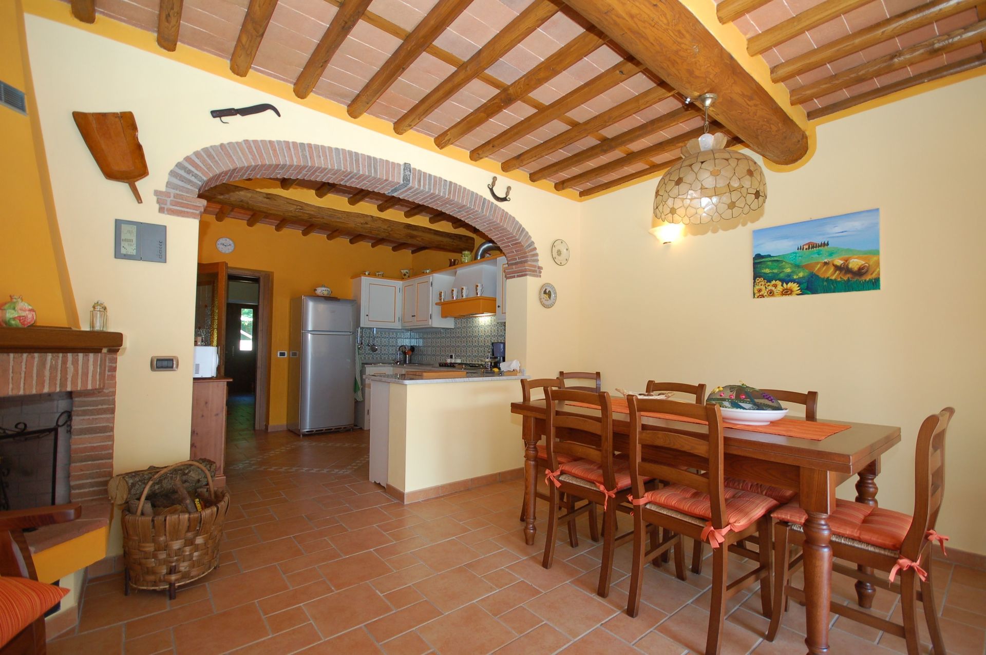 Køkken: veludstyret køkken, spisebord (personer: 8), opvaskemaskine, køleskab, fryser, mikroovn, ovn, brødrister, amerikansk kaffemaskine, kamin, udgang til veranda.