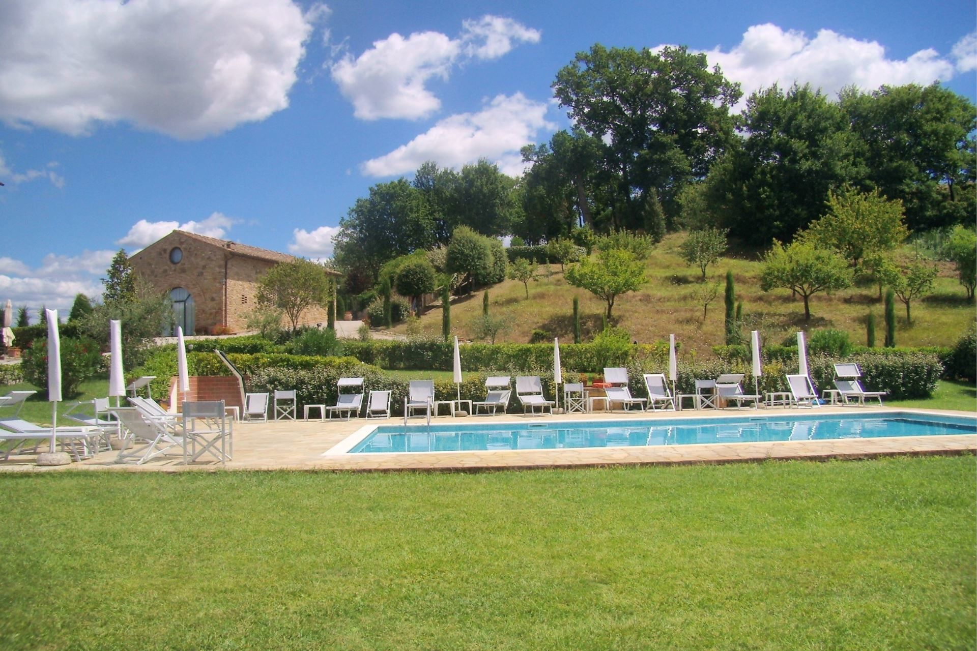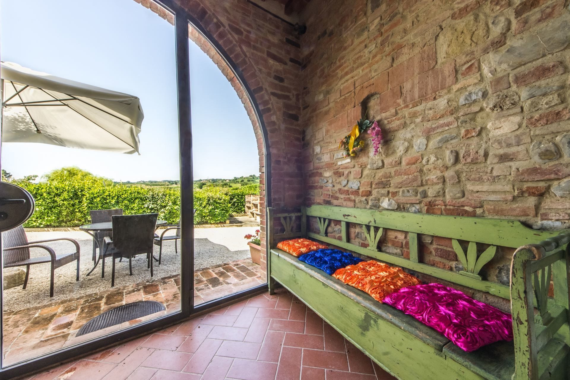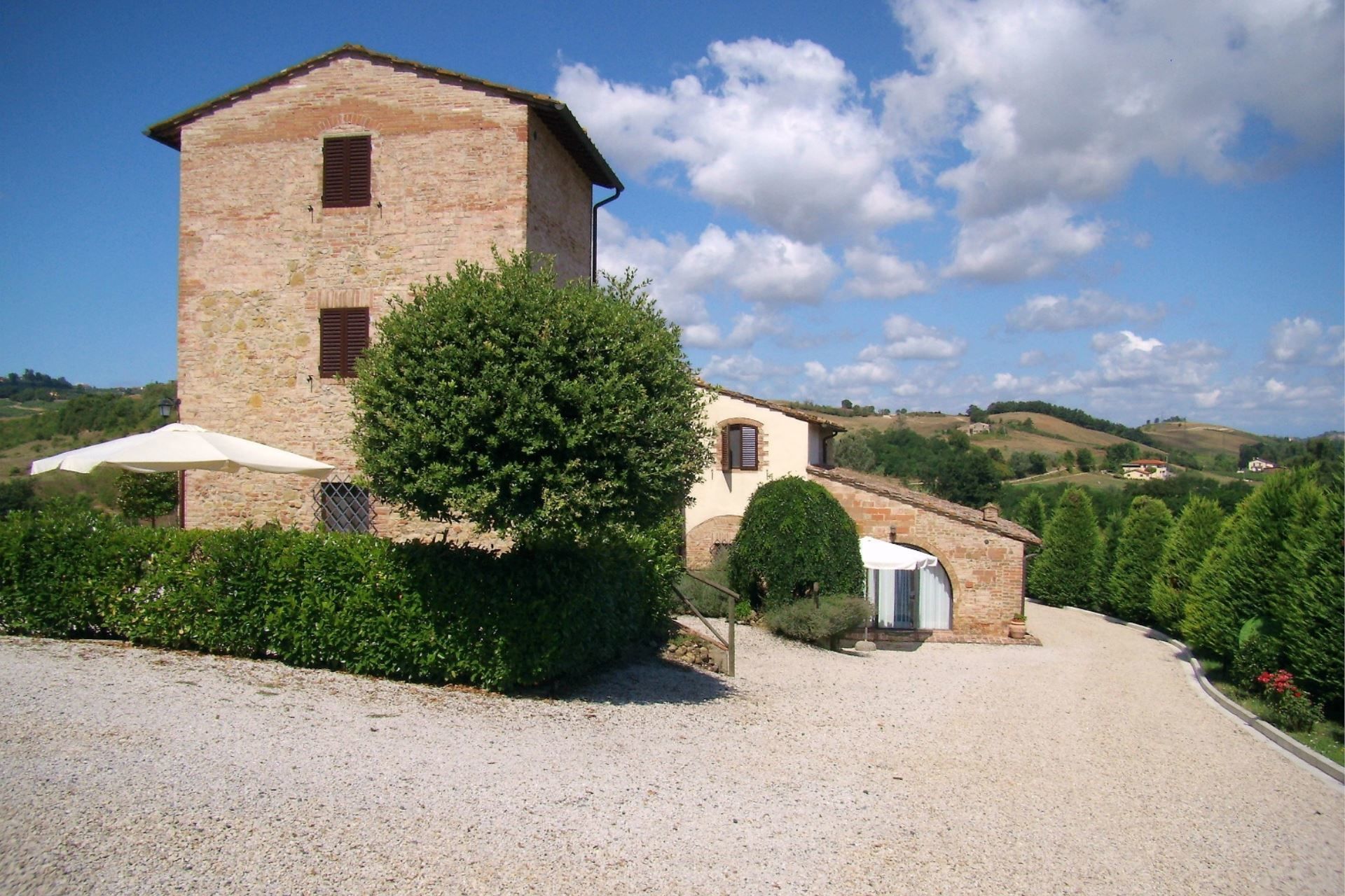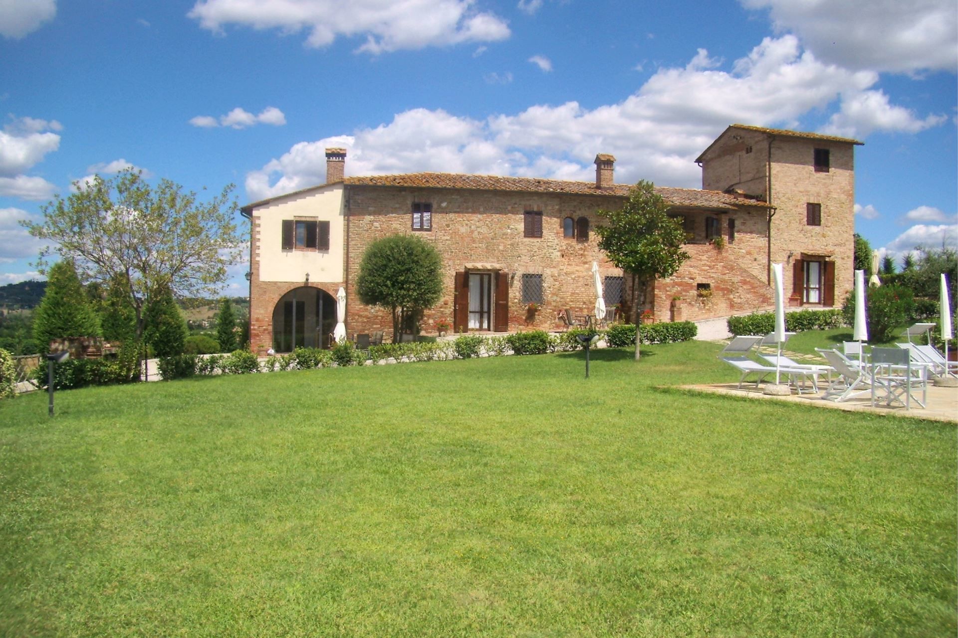 The ancient Tower and the completely restored farmhouse. Caselsa's name comes from the River Elsa which flows through the valley. It was the last house to the North of a large farm and originally only consisted of a single 'Tower' built explicitly as a look out for approaching strangers. Over the years the building was enlarged several times and in fact the various periods of construction are easy to see. In 1992 the whole building was completely renovated and divided into 5 apartments, each equipped with all the modern comforts (air conditioning, Wi-Fi access, dishwasher, washing machine etc…). In the wide, fenced garden has been realized a swimming pool (size m. 6x12, depth m. 1,40) and an external space equipped with table and chairs for outdoors meals.