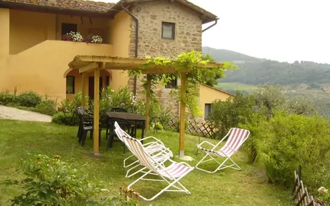 The house advertised by us is composed of two apartments, communicating with each other only from the outside, both equipped with their own equipped kitchen. House "Il Fienile", 350 m a.s.l.. 2.4 km from the centre of San Polo in Chianti, 17 km from the centre of Greve in Chianti, 22 km from the centre of Firenze, in a quiet, sunny, elevated position on top of a hill, in the countryside. For shared use: property 10 ha, swimming pool (above ground) (9 x 5 m, depth 135 cm, 04.05.-27.09.). Garden furniture, barbecue. Private: swimming pool (above ground) (9 x 5 m, depth 135 cm, 04.05.-27.09.). Garden furniture, barbecue. In the house: washing machine, heating to be paid on the spot (01.11.-15.04.), heating available only from 01.11. to 15.04.. Motor access to the house (1 km via unmade road). Parking on the premises. Shop 2.4 km, supermarket 2.4 km. Golf course (18 hole) 8 km. Nearby attractions: San Casciano in Val di Pesa 22 km, Panzano in Chianti 25 km, Badia a Passignano 29 km, San Donato in poggio 32 km, Radda in Chianti 35 km, San Gimignano 55 km. Please note: the owner lives on the same property.