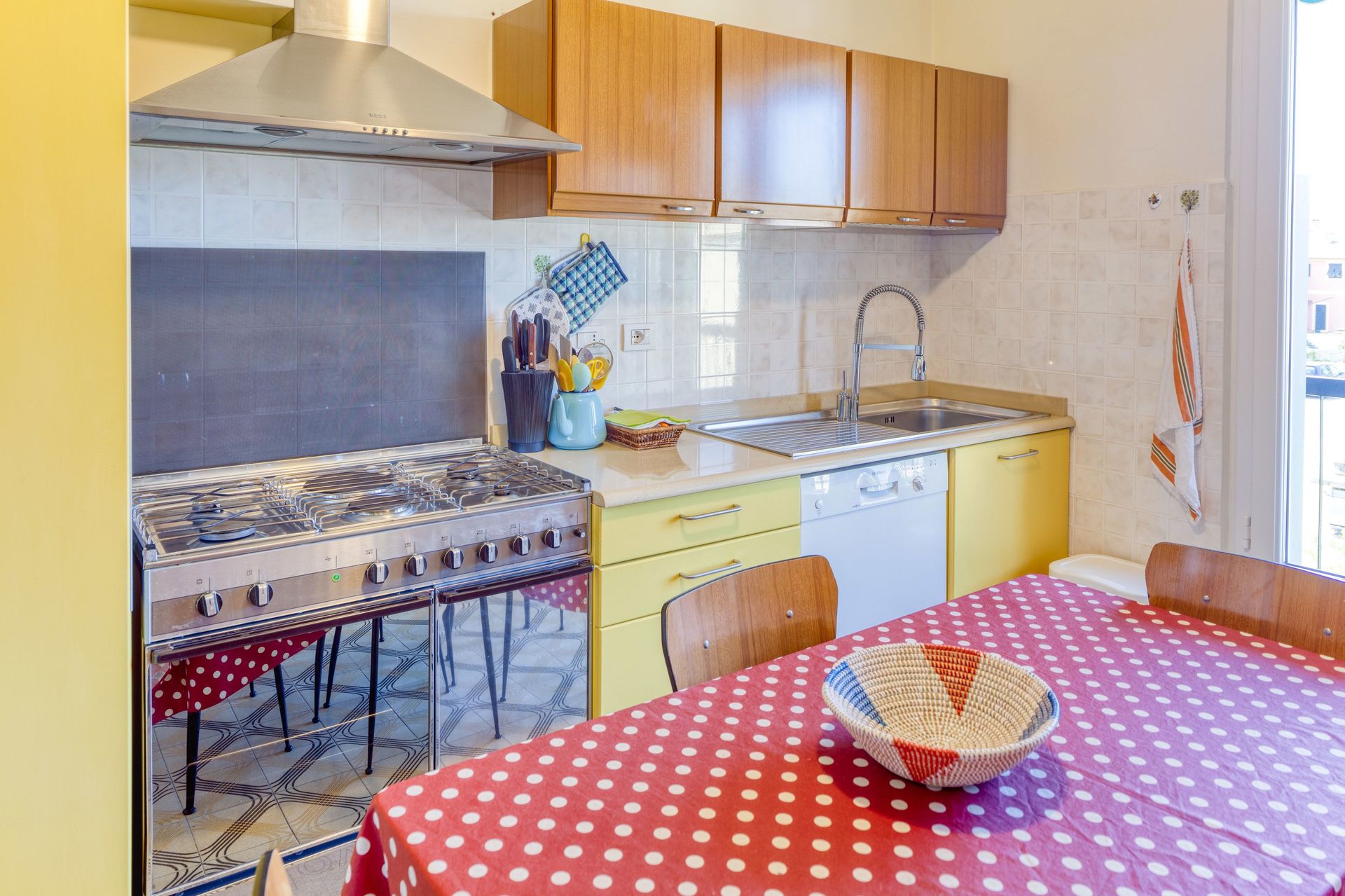 Leveres med alle bekvemmeligheder: opvaskemaskine, vaskemaskine, ovn, komfur med 6 brændere, mikroovn, køleskab, fryser.