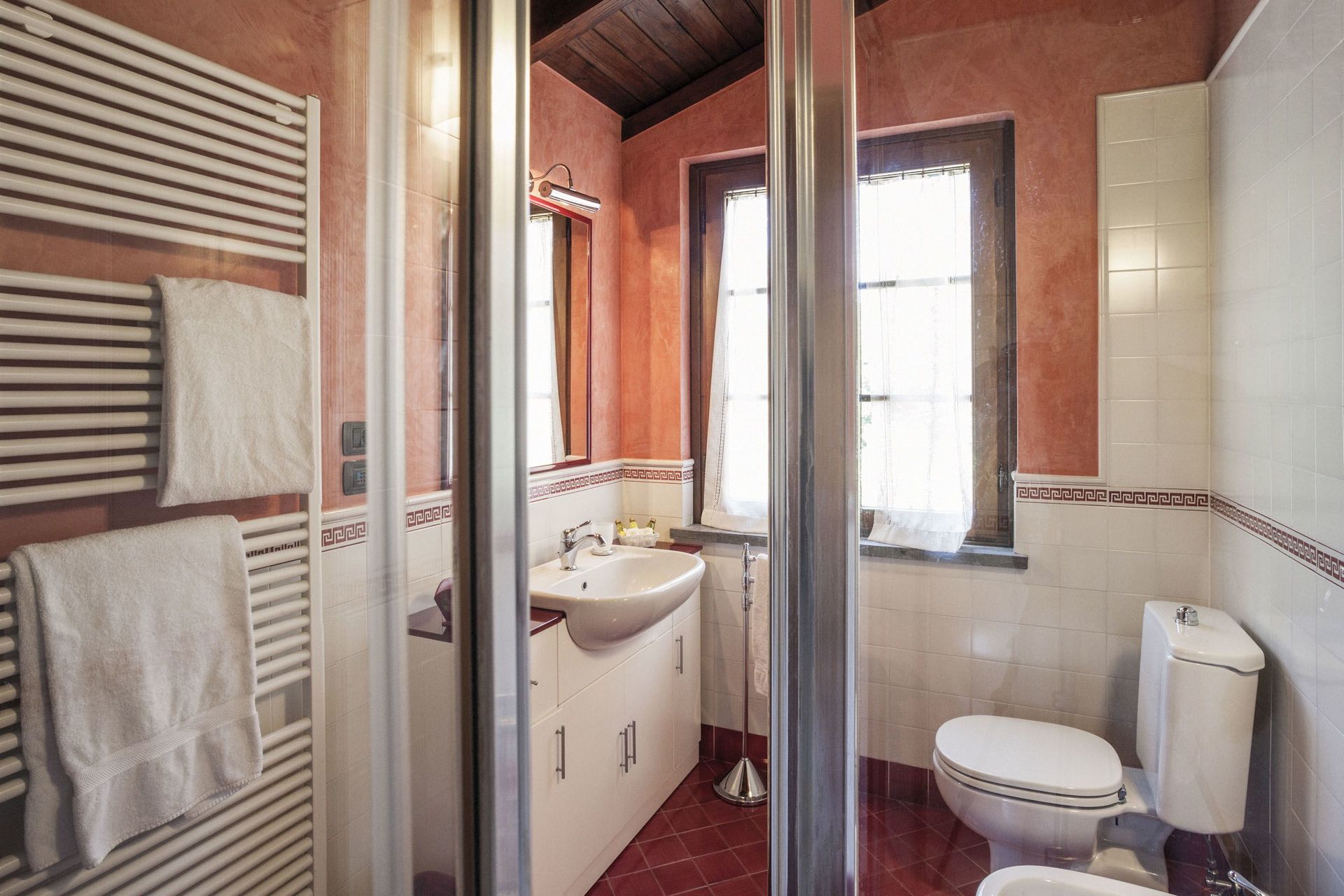 Badeværelse: vask, wc, bidet, bruser, myggenet.