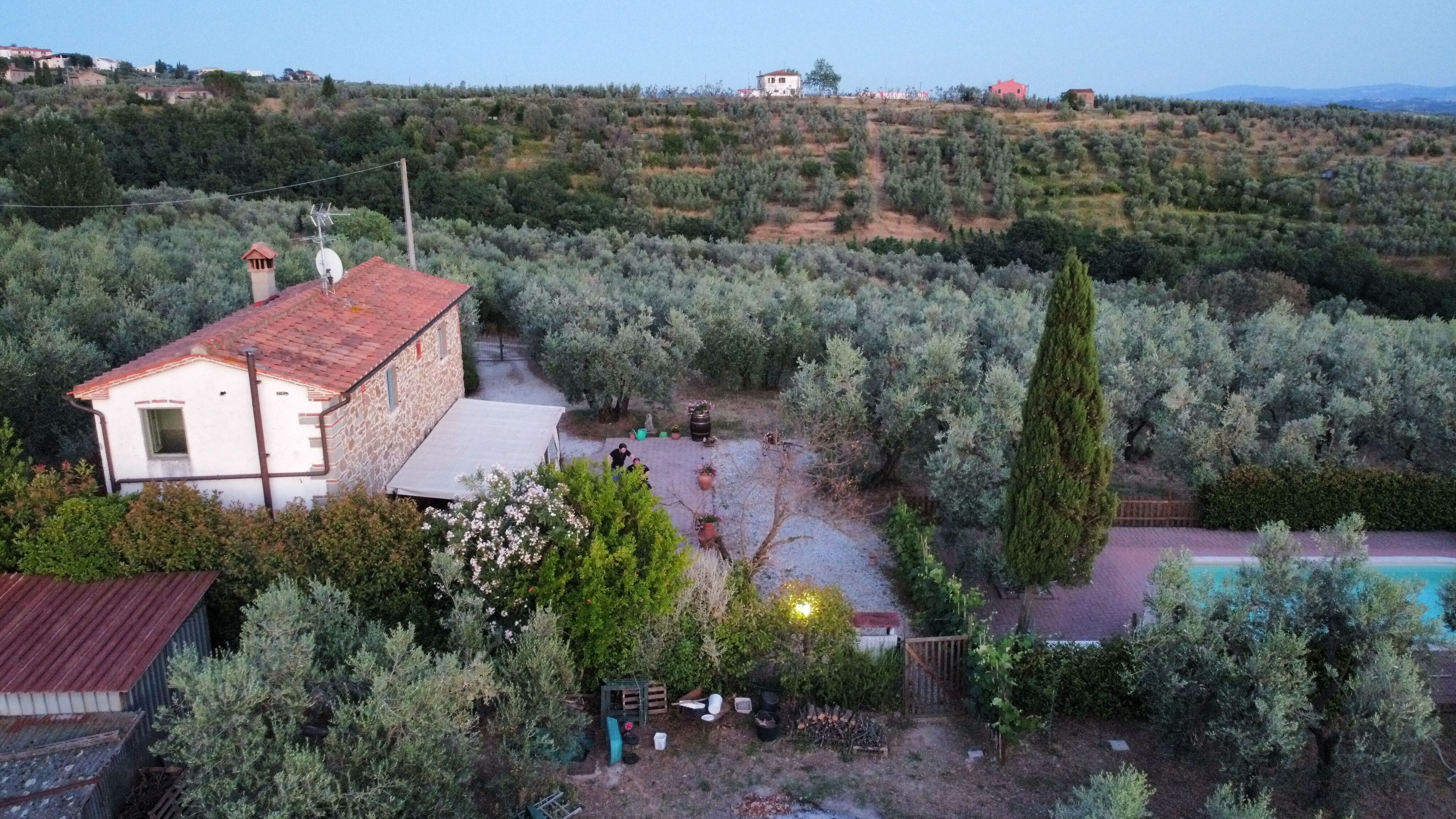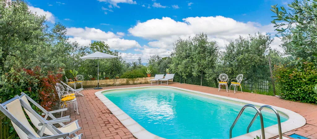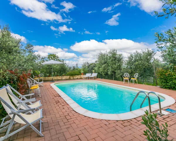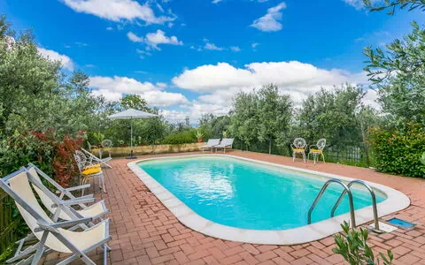 Det indhegnede område på 1.000 m² omfatter en frodig eng under skyggen af gamle oliventræer. Svømmepølen måler 8 x 5 meter med en dybde på 120 cm og er tilgængelig fra 1. maj til 5. oktober; en udendørs bruser befinder sig i nærheden. En velindrettet terrasse med havemøbler tilbyder ideelle rammer for spisning og samvær med udsigt over landskabet. Et barbecueområde er til rådighed for udendørs måltider.