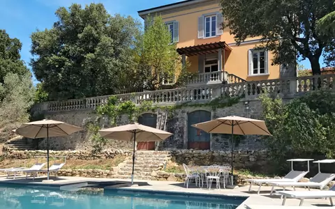 Historisk villa "Villa Belvedere (SGS135)", bygget i 1800, renoveret i 2017, omgivet af træer og marker. 3.5 km fra bymidten af San Giustino Valdarno, 15 km fra centrum af Terranuova, 22 km fra bymidten af Arezzo, rolig beliggenhed, i det grønne. Til alene benyttelse: grund 2 ha (indhegnet), park, have i forskellige niveauer træer, pool (12 x 7 m, Sæsonbestemt tilgængelighed: 01.Maj. - 25.Sep.). Udendørs brus, lysthus, terrasse (50 m2), havemøbler. Opbevaringsrum muligt. Stejl tilkørsel (500 m natursti). Trappe (12 trin) til huset. Parkeringsplads (for 3 biler, overdækket) på grunden. Indkøbsforretning 3.5 km.