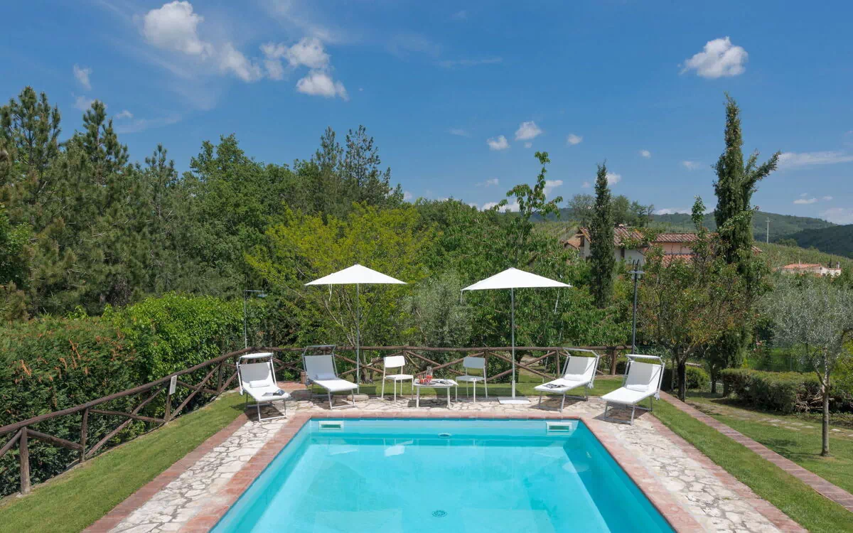 Meget smuk, hyggeligt, rustikt enfamiliehus "Villa del Poggio", omgivet af træer og vingård. 2 km fra bymidten af Radda in Chianti, 12 km fra centrum af Castellina in Chianti, 23 km fra bymidten af Montevarchi, i en bydel, i det grønne. Til alene benyttelse: smuk, velplejet have 5'000 m2 (indhegnet) med græsplane og træer, frugthave, liggeplæne, pool (12 x 5 m, Sæsonbestemt tilgængelighed: 02.Maj. - 14.Okt.). Bordtennis, lysthus, terrasse, havemøbler. Til afbenyttelse: cykler (6). Parkeringsplads (for 3 biler) på grunden. Fødevarebutik 2 km, supermarked 3 km, busstoppested 2 km, banegård "Montevarchi" 23 km, pool 12 km, svømmehal 23 km. Bemærk venligst: bil anbefales. Madlavningskurser bestilles på forespørgsel. Ejer bor på sammen grund.