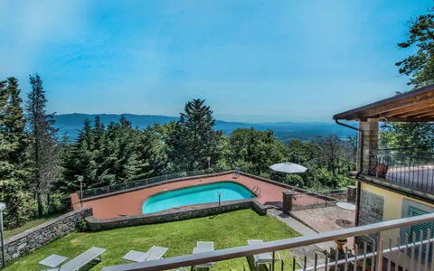 6-værelse-hus 230 m2 på 2 etager, på forhøjet stueetage. Rustikt og hyggeligt indrettet: stue/spisestue med åben kamin, spisebord og sat-TV. Udgang til terrasse. 2 værelse, alle værelser med 1 fransk seng (160 cm). Køkken (ovn, opvaskemaskine, 4 gasblus, Brødrister, elektrisk kaffemaskine). Udgang til terrasse. Brus/bidet/WC. Nederste etage: spisestue, loftshøjde 220 cm med spisebord. Udgang til have. 2 værelse, alle værelser med 1 fransk seng (160 cm). Brus/bidet/WC. Opvarming (ekstra). Lille altan, stor terrasse 25 m2, overdækket. Havemøbler, grill, liggestole (14). Flotte panoramaudsigt over dalen, landskabet, skoven og Val d'Arno. Til benyttelse: vaskemaskine, højstol, barneseng til 2 år. Internet (trådløs LAN [WLAN], gratis). Parkeringsplads (indhegnet, 2 Biler) ved huset. Bemærk venligst: ikke-ryger lejlighed. Ingen obligatoriske ekstra gebyrer skal betales på stedet undtagen lokal skat. Hvis lejeobjektet er booket til færre personer end det maksimalt tilladte, vil ikke alle soveværelser være tilgængelige. IT051013C2WTB6E8AH