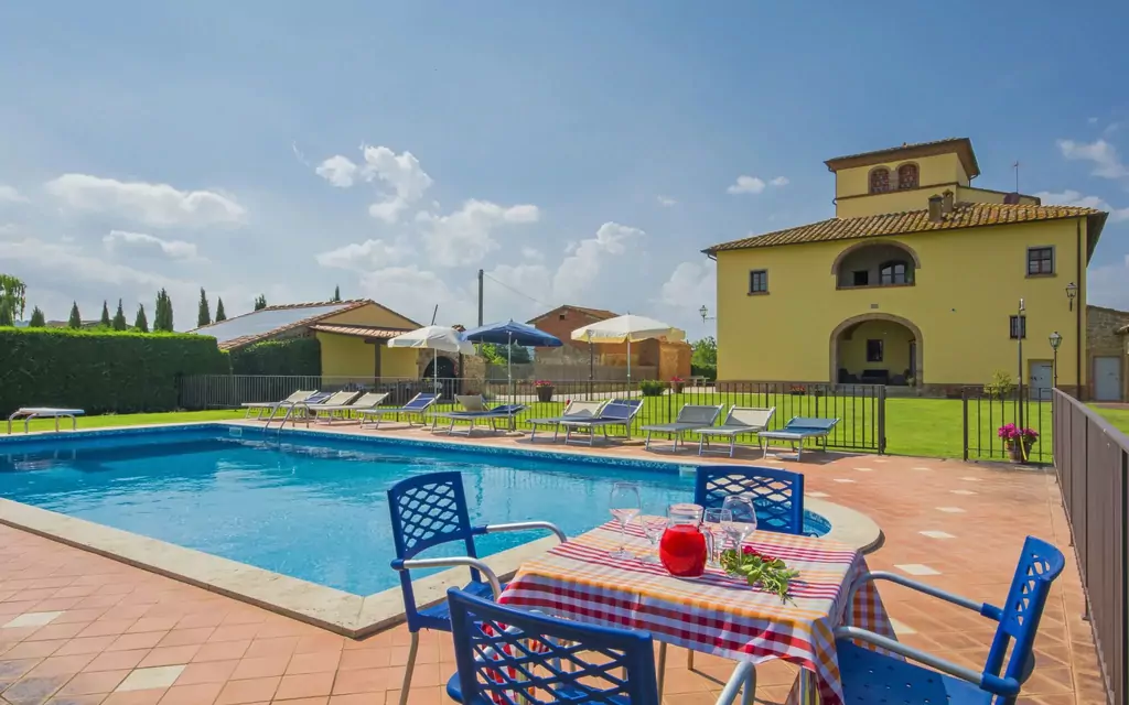 Meget stor, smuk, komfortabelt villa, bygget i 1814, renoveret, omgivet af græsmarker. 3 km fra bymidten af Monte San Savino, 7 km fra centrum af Lucignano, 80 km fra bymidten af Firenze, solrige beliggenhed, i det grønne. Til alene benyttelse: grund 6 ha, have 2'000 m2 (indhegnet) med græsplane, pool indhegnet (6 x 12 m, 120 - 230 cm dyb, Sæsonbestemt tilgængelighed: 18.Maj. - 05.Okt.) med indetrappe. Udendørs brus, bordtennis, lysthus, havemøbler, grill, legeplads (rutschebane). I huset: bordtennis, centralvarme, vaskemaskine, Opvarmningen betales lokalt, opvarme kun tilgængelig fra 01.Nov. - 07.Apr.. Rengøring af lejlighed muligt (ekstra). Kok muligt (ekstra). Parkeringsplads. Supermarked 3 km, indkøbscenter 12 km, busstoppested 4 km, banegård "Monte San Savino" 3 km, varmtvandsbad "Serre di Rapolano" 34 km. Ridehal 12 km. Nærliggende attraktioner: Arezzo 12 km, Montepulciano 33 km, Pienza 39 km, Siena 40 km, Cortona 42 km, Montalcino 46 km. Velegnet till arrangementer.