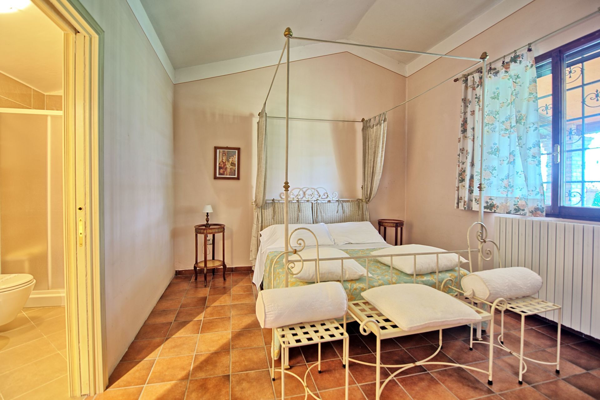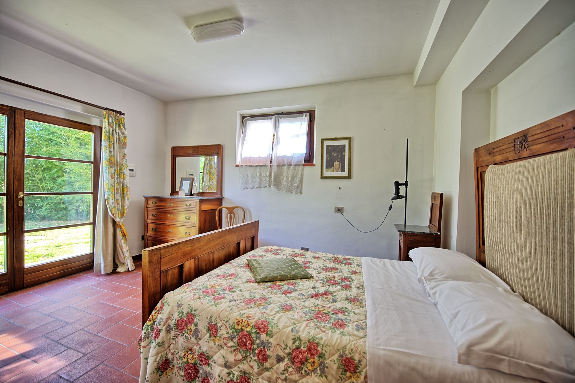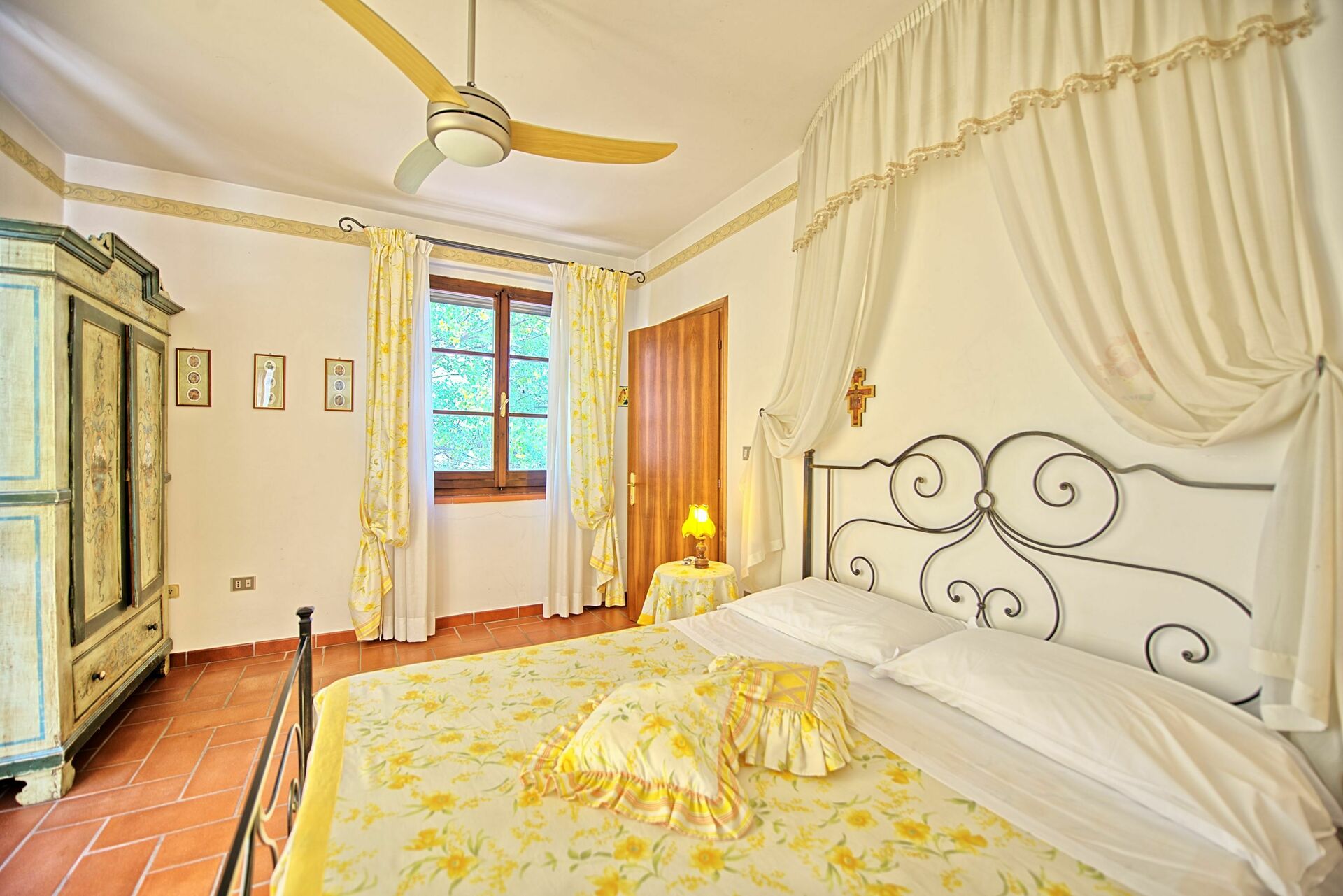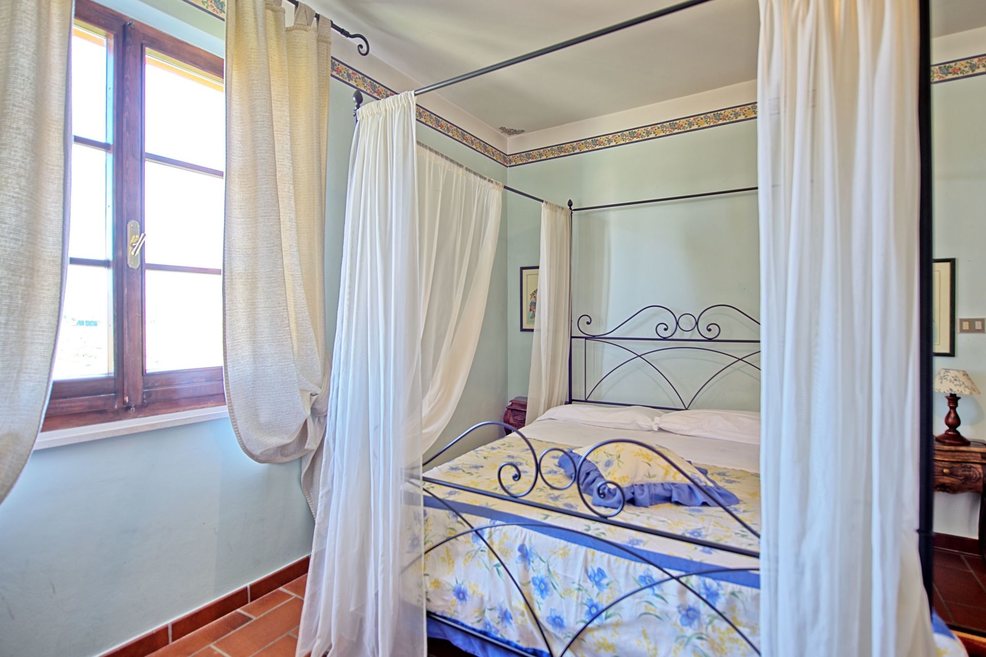 Stueetage: Møbleret overdækket tag. Terrassen har et stort spisebord. Indgang til køkken (ovn, køleskab, espresso presse) fra terrassen. Stue med tv og dekorativ pejs. Soveværelse med fransk seng og udgang til haven. Badeværelse med bruser. Stue med enkelt sovesofa og åbent køkken. Toilet med vaskemaskine. Dobbeltværelse med baldakin og eget badeværelse med bruser.