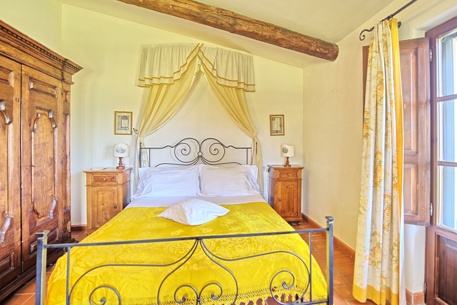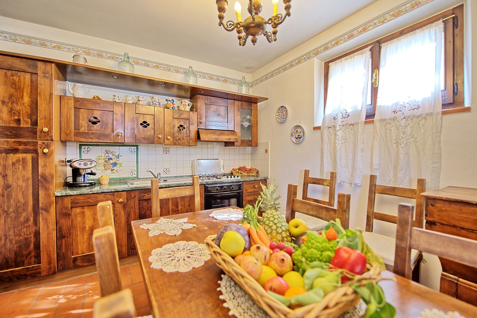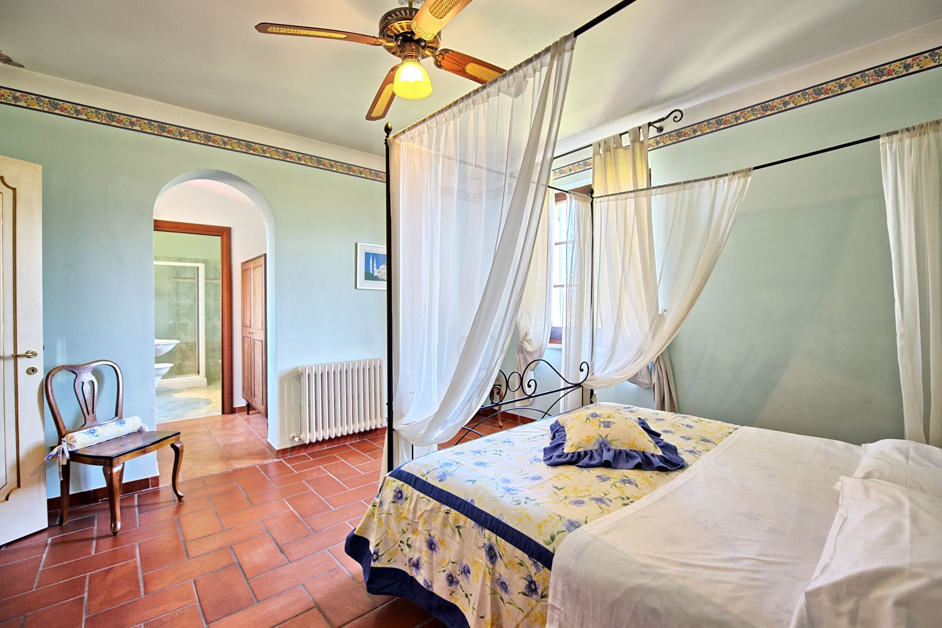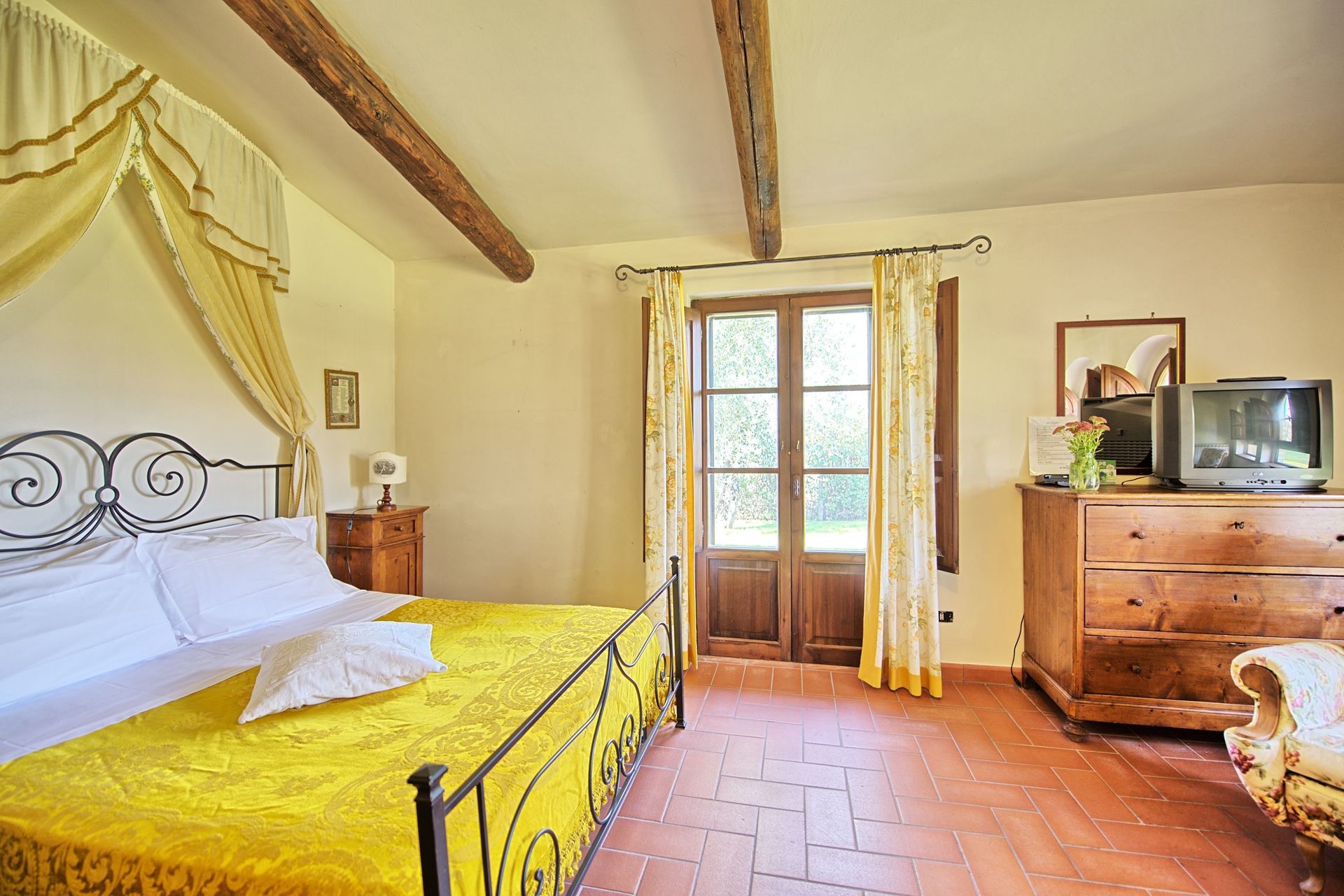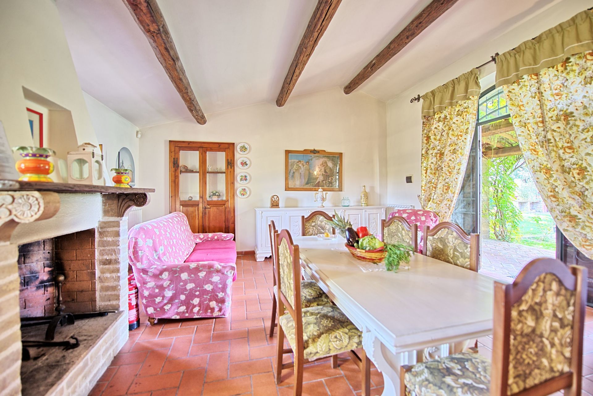 Stueetage: Møbleret overdækket tag. Terrassen har et stort spisebord. Indgang til køkken (ovn, køleskab, espresso presse) fra terrassen. Stue med tv og dekorativ pejs. Soveværelse med fransk seng og udgang til haven. Badeværelse med bruser. Stue med enkelt sovesofa og åbent køkken. Toilet med vaskemaskine. Dobbeltværelse med baldakin og eget badeværelse med bruser.