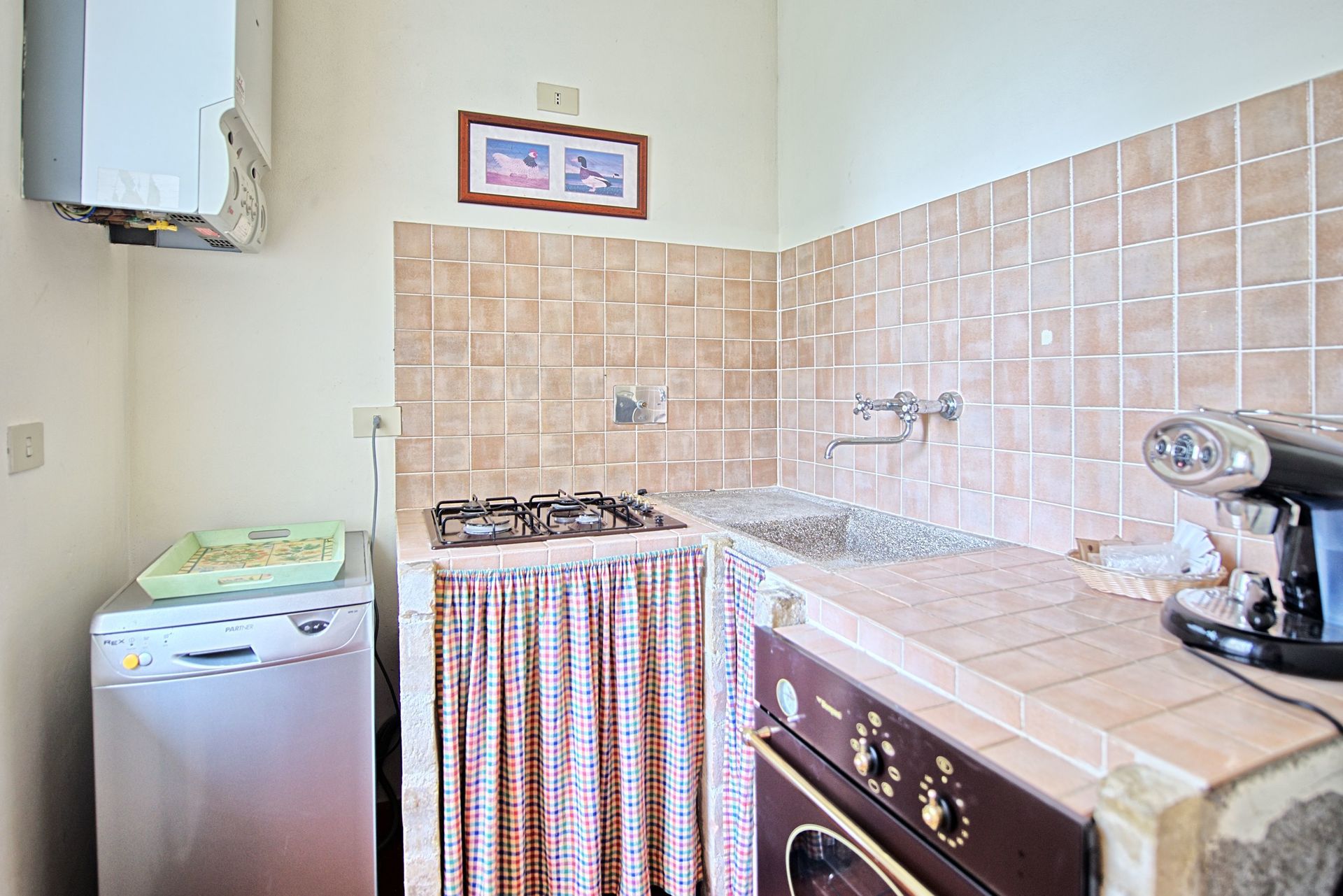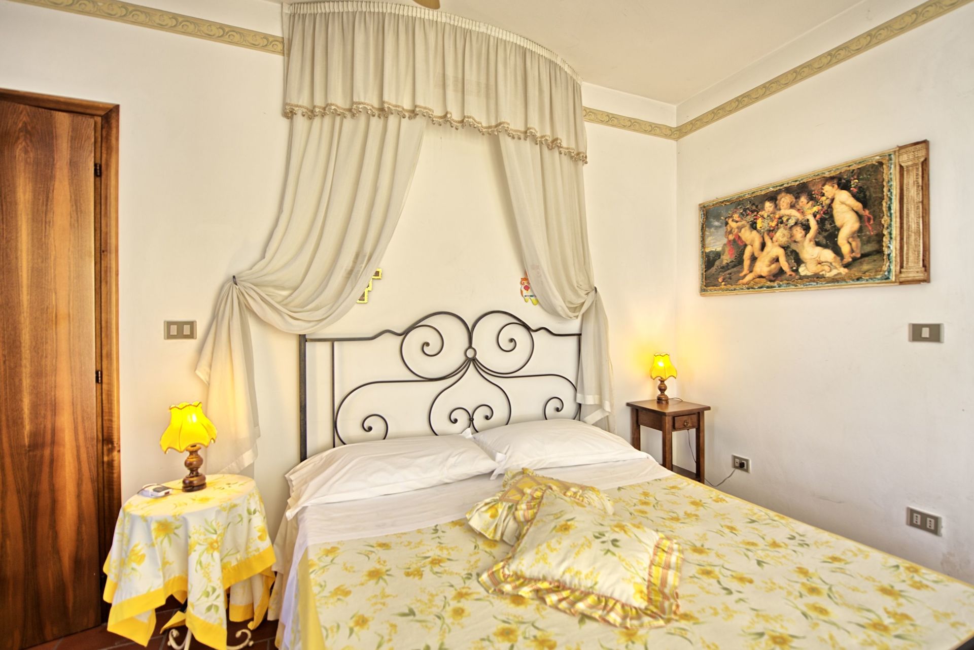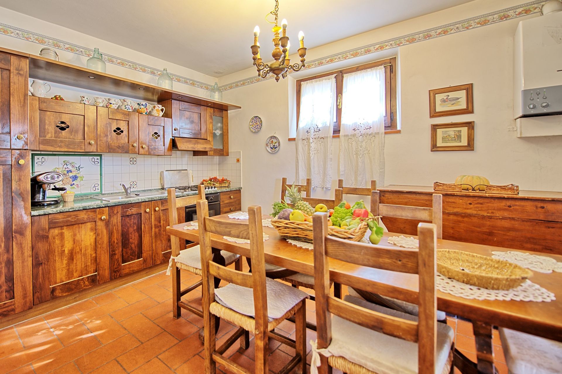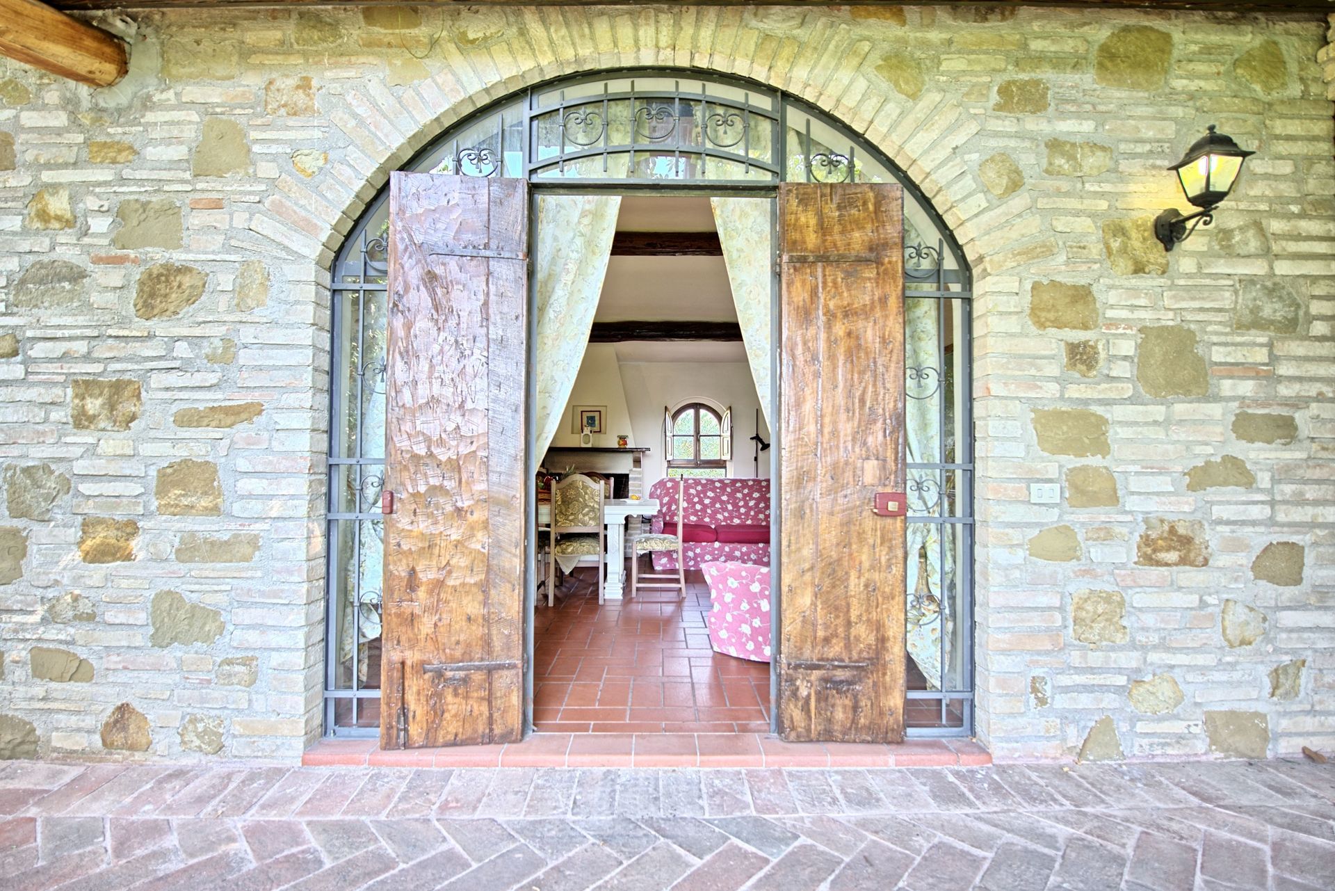 Stueetage: Møbleret overdækket tag. Terrassen har et stort spisebord. Indgang til køkken (ovn, køleskab, espresso presse) fra terrassen. Stue med tv og dekorativ pejs. Soveværelse med fransk seng og udgang til haven. Badeværelse med bruser. Stue med enkelt sovesofa og åbent køkken. Toilet med vaskemaskine. Dobbeltværelse med baldakin og eget badeværelse med bruser.