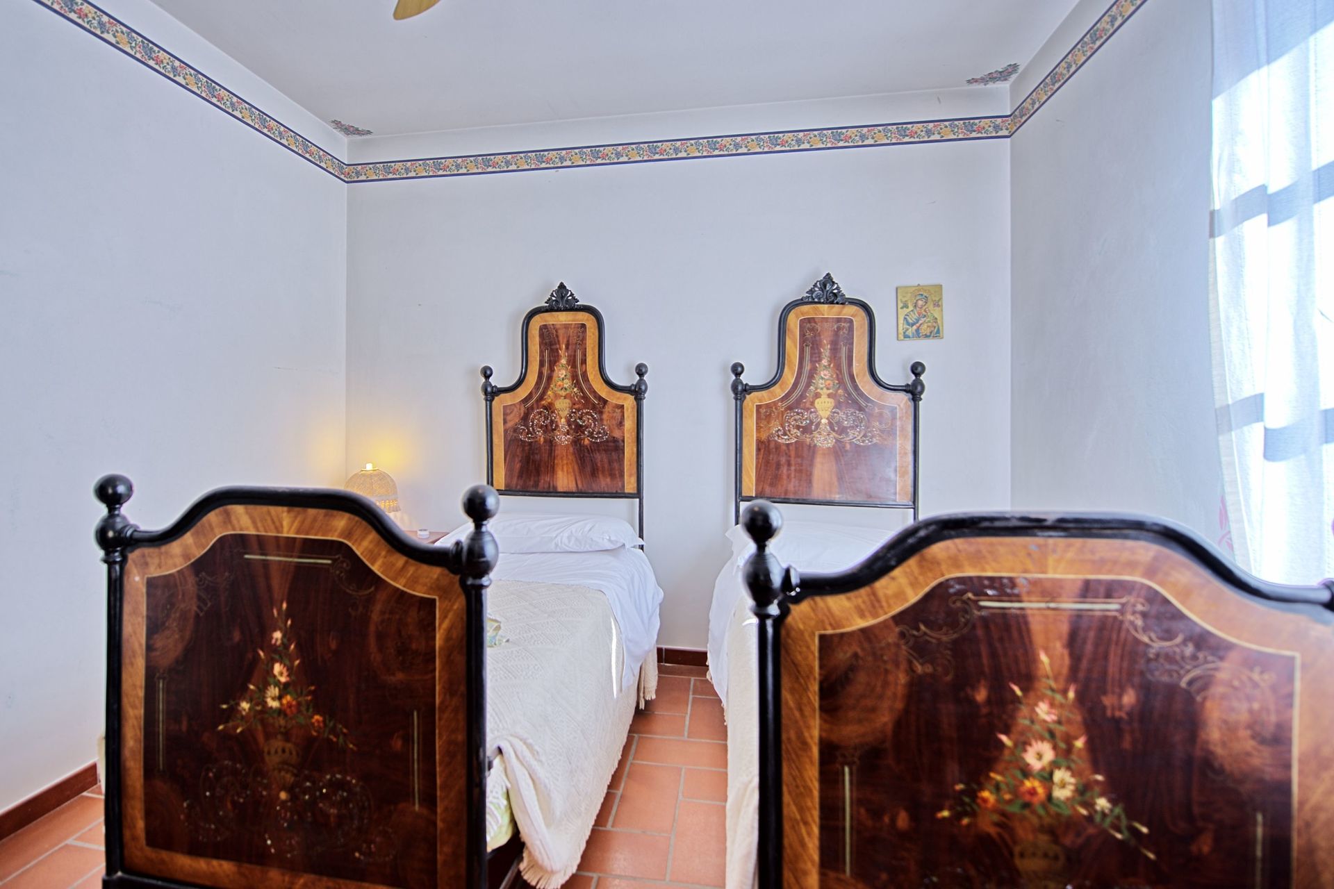 Anden sal: Dobbeltværelse, der giver adgang til et soveværelse med to enkeltsenge med eget badeværelse med bad / bruser, soveværelse med dobbeltseng, soveværelse med dobbeltseng med hylde og privat badeværelse med bruser.