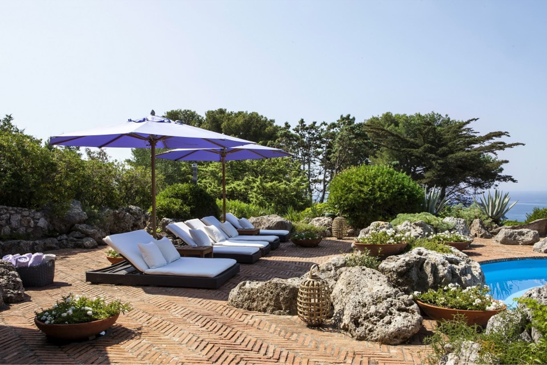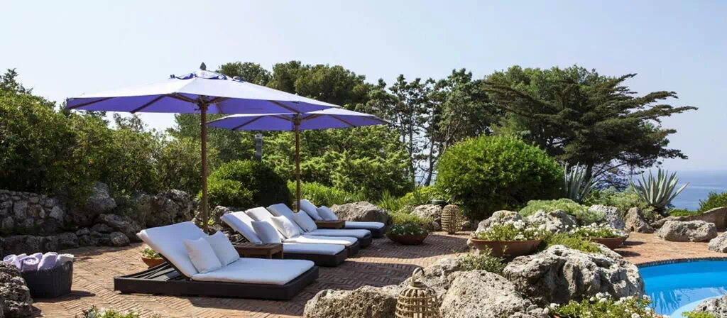 Swimming pool with a view of the sea and Porto Ercole. The wonderful swimming pool, of undulating shape, is about 20 m long and 12 m wide (at its widest point) and has a depth of min. 1.20 m and max. 3 m. All around, plants and flowers, sunbeds and umbrellas. From here guests can enjoy a breath taking view of the Monte Argentario promontory and the ancient fishing village, Porto Ercole.