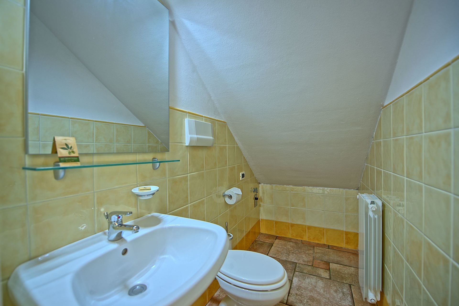 Stueetagen: indgang til stue (TV) med pejs, spiseplads og køkkenhjørne (fryser, mikroovn, opvaskemaskine), toilet, soveværelse med en enkeltseng og adgang til det udvendige, dobbeltværelse med adgang til udenfor, badeværelse med bruser .
