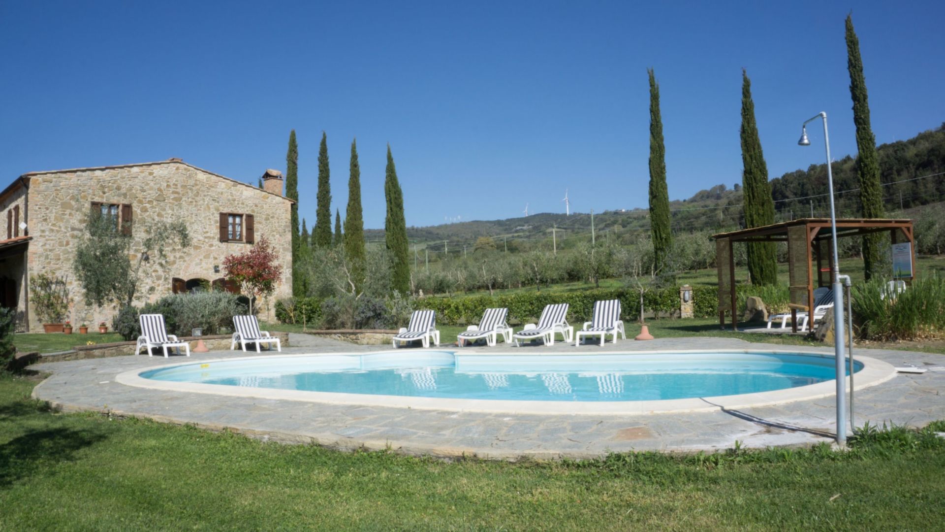 Ved ankomst vil I møde en skøn ren velholdt ejendom med udsigt over bakkerne perfekt til behagelig ferie i Toscana. Efter en hektisk dag med museumsbesøg, er det dejligt at nyde lidt tid med venner og familie ved kanten af poolen med et glas vin - det er en perfekt måde at køle ned på sidst på dagen. Udenfor vil I finde gårdhave og grill. At spise med venner og familie er en stor del af den toskanske kultur. Benyt køkkenet til madlavning med lokale produkter, når du er på ferie. Køkkenet indeholder mikroovn og køleskab, samt, masser af service og bestik til op til ti personer. Spis 'al fresco' som en ægte toskaner. Den fuldt møblerede gårdhave er det ideele sted for at nyde sit måltid, familien og det fine toskanske vejr.