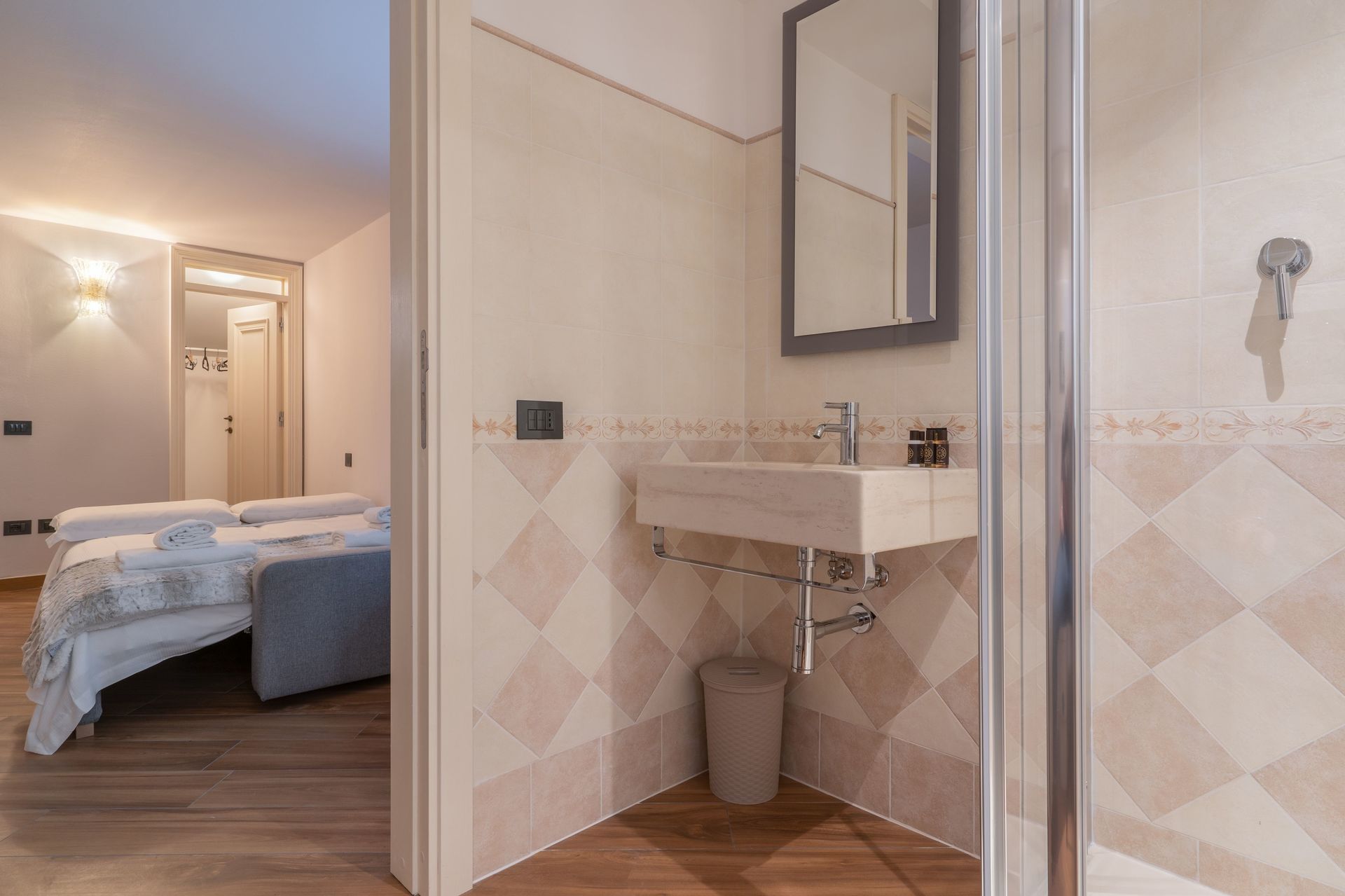 Soveværelse med bad 3: sovesofa, klimaanlæg, vask, wc, bidet, bruser.