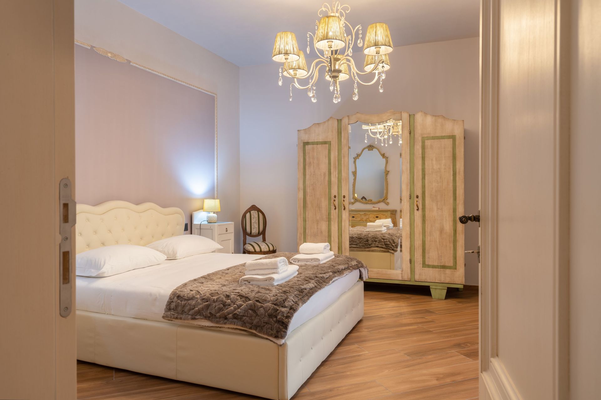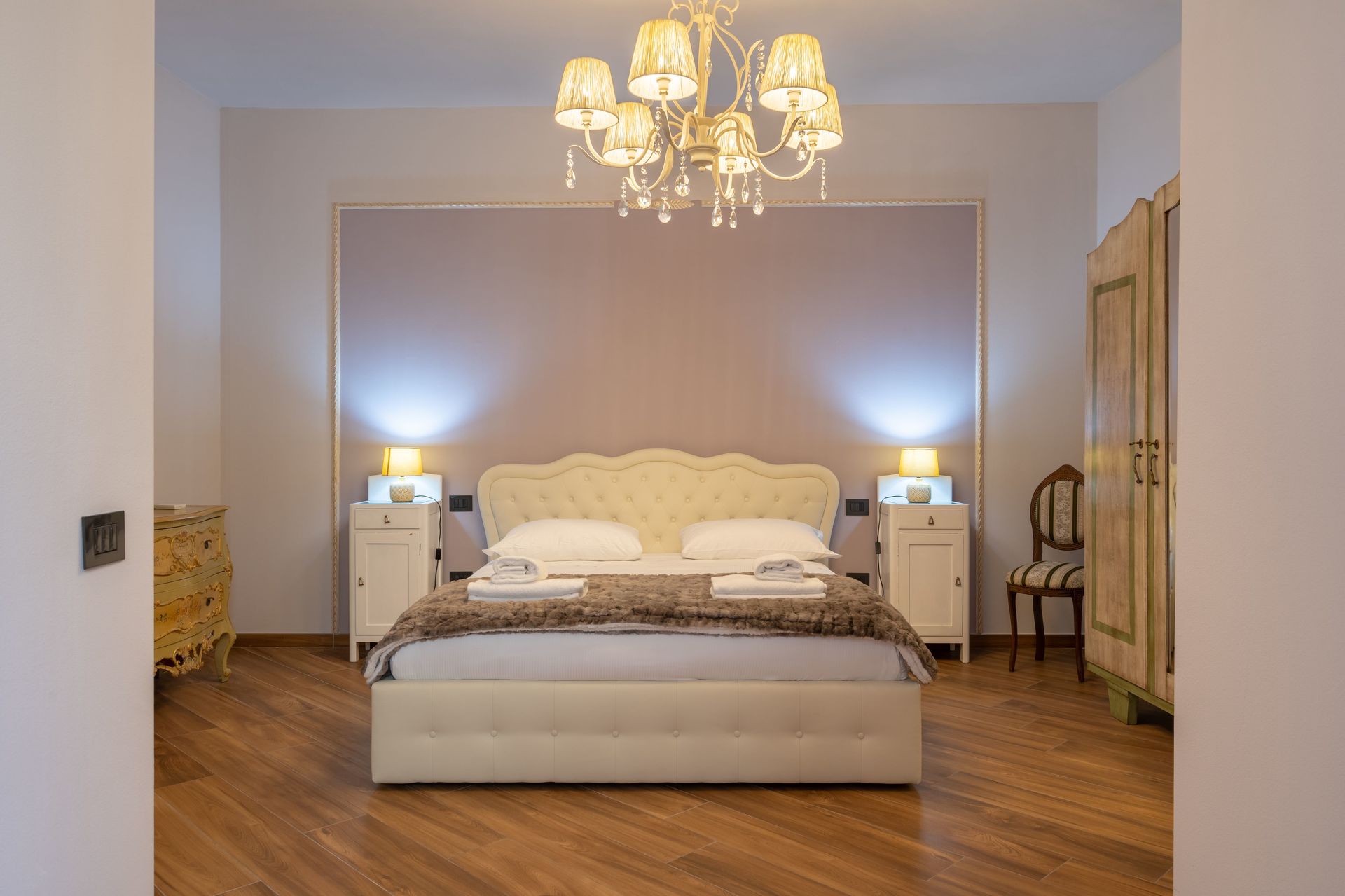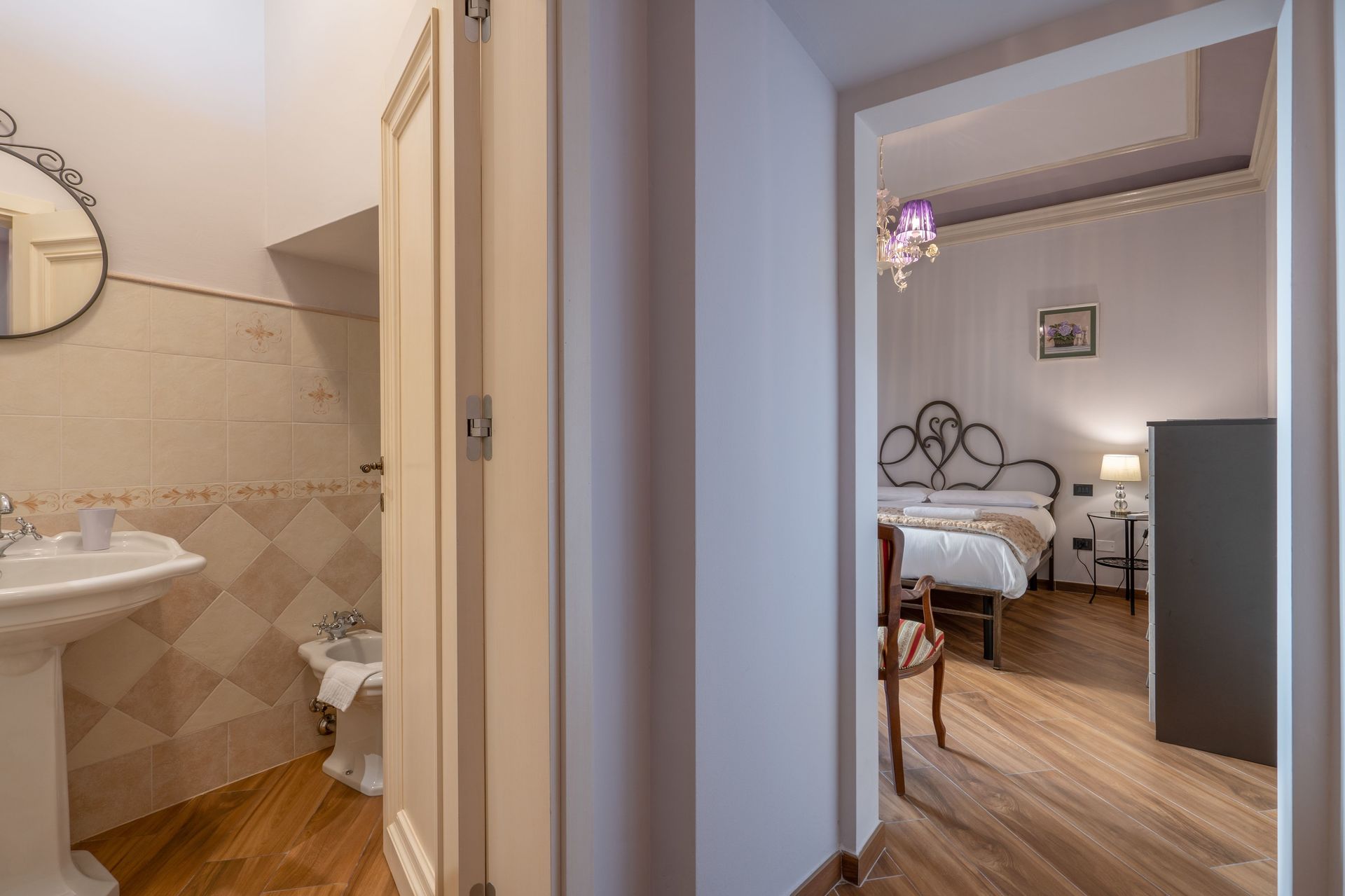 Soveværelse med bad 1: dobbeltseng, klimaanlæg, vask, wc, bidet, bruser.