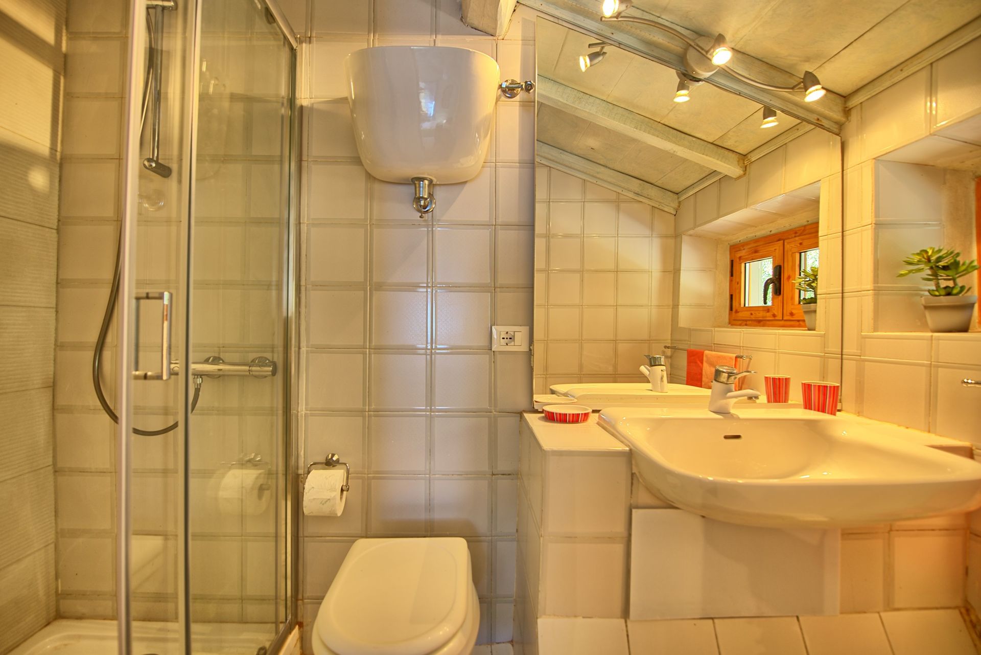 Første sal: lille stue med dobbelt sovesofa, soveværelse med dobbeltseng (aircondition), badeværelse med bruser, soveværelse med 2 enkeltsenge (aircondition) og privat badeværelse med bruser.